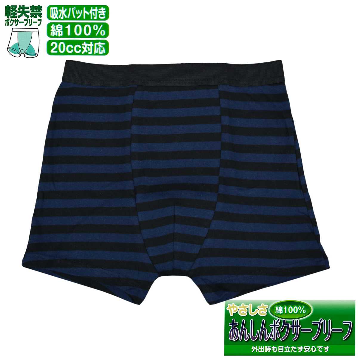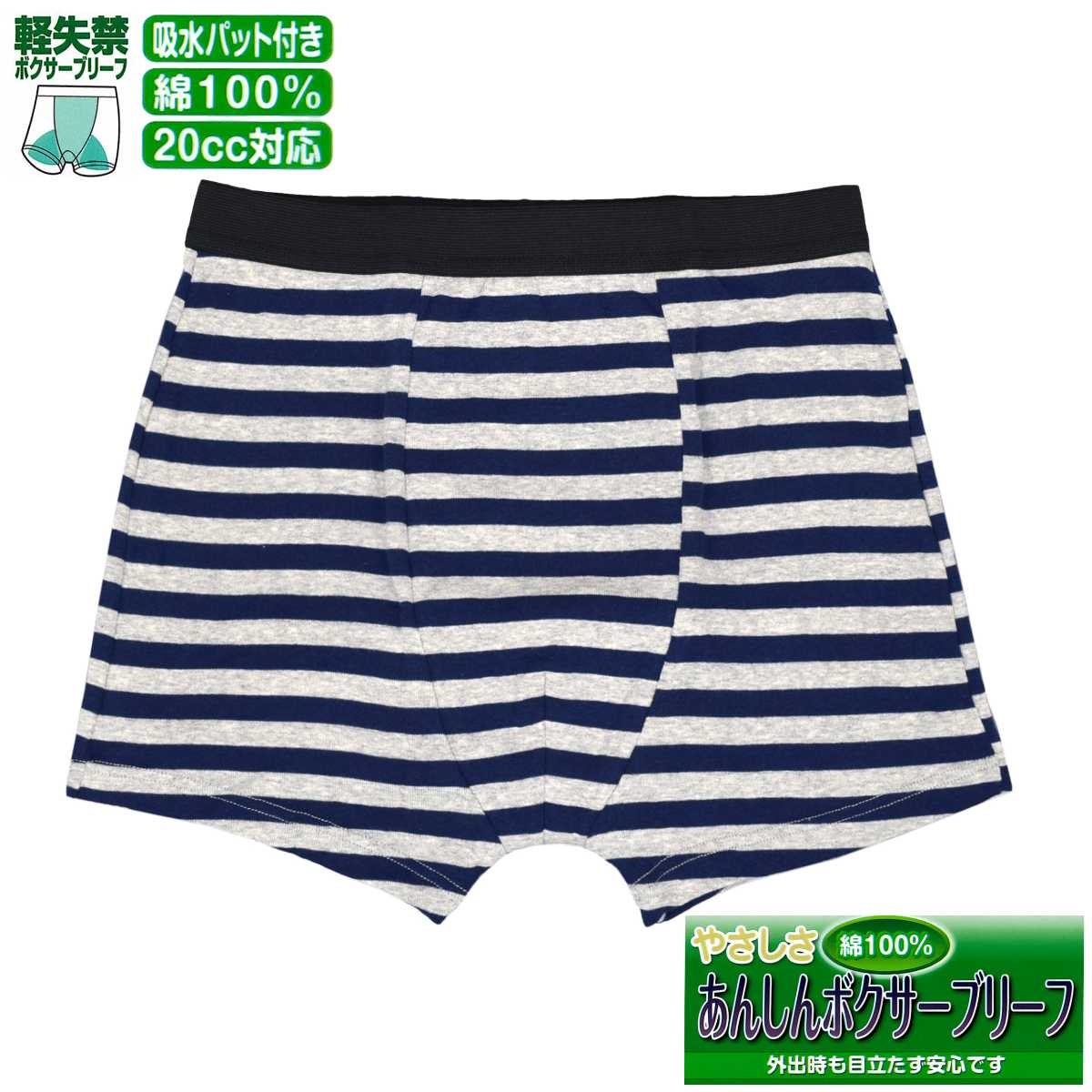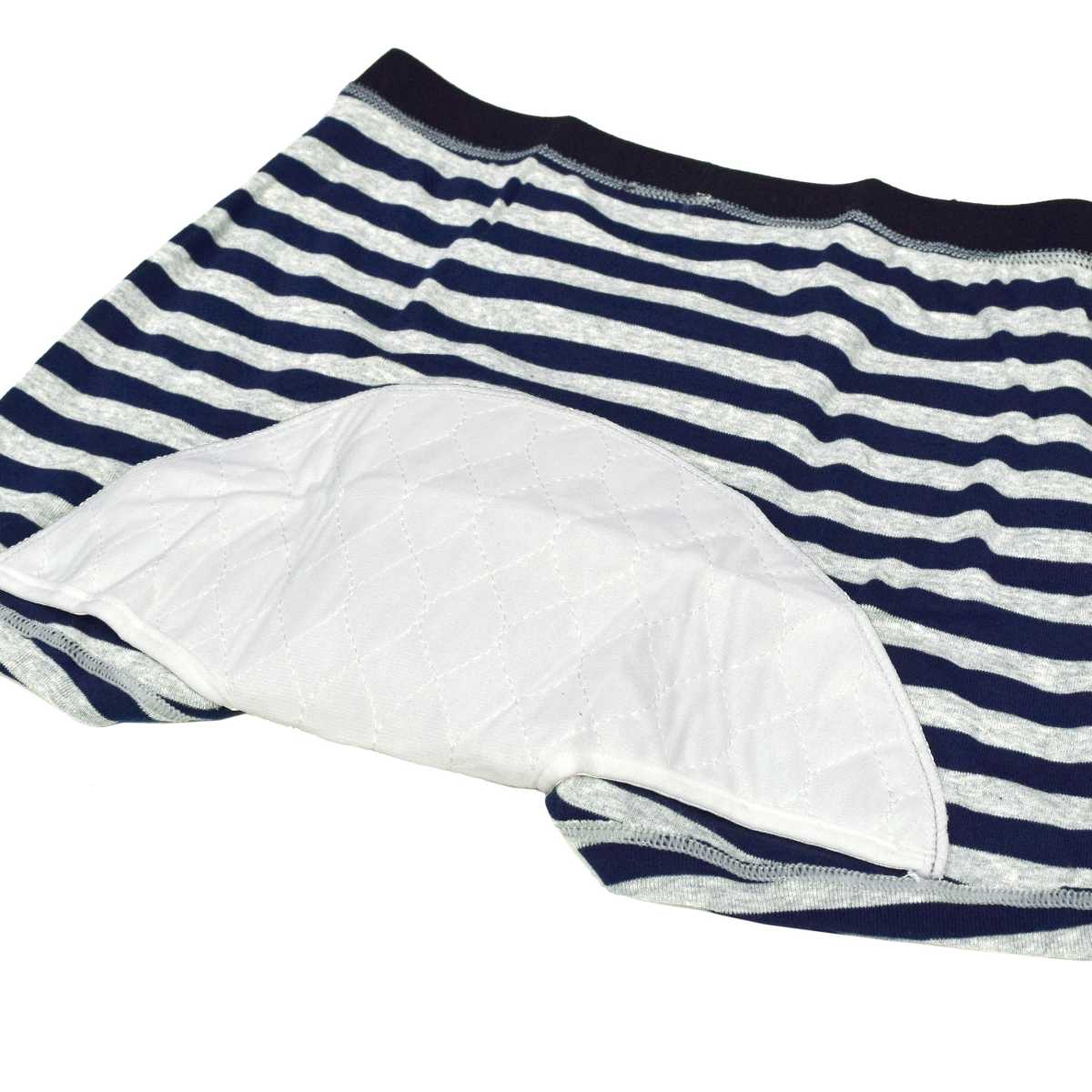 ☆ 商 品 説 明 ☆ 軽失禁用 綿100% 20cc 対応安心 ボクサーブリーフ 。 前からお尻まで付いている 吸水パッド が20ccまでの 軽失禁 に対応。外出時も安心です。前開きの無いタイプの 吸水パンツ です。尿じみ、横漏れもしっかり吸収。カジュアル なボーダー柄。こんな方におススメです。ちょい漏れが気になる、尿のキレが悪い、我慢出来ずに漏れてしまう、くしゃみで漏れてしまう、立ち上がる時漏れてしまう、スポーツをしている時漏れてしまう。