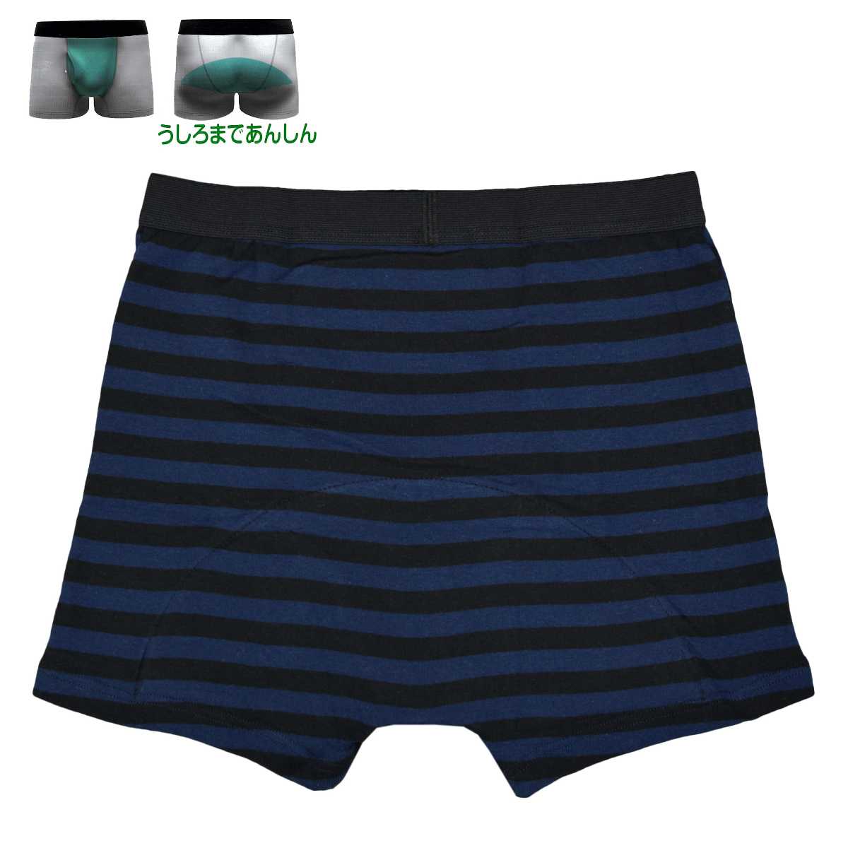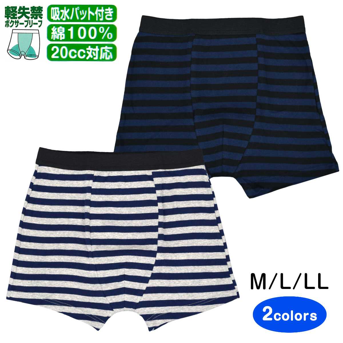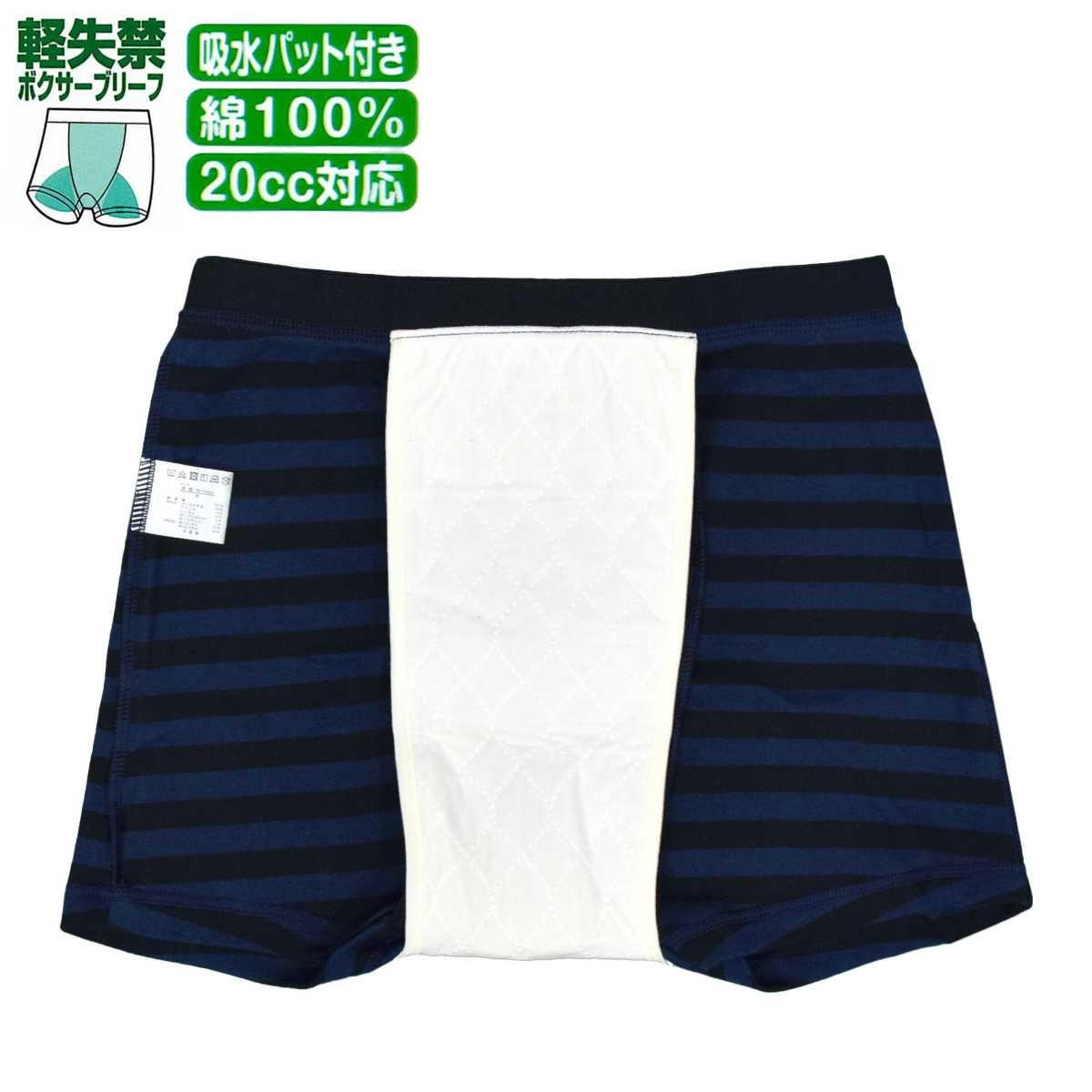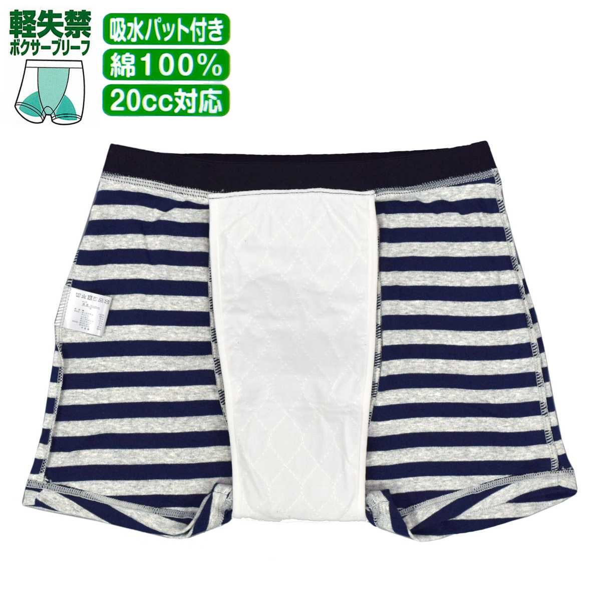 ☆ 商 品 説 明 ☆ 軽失禁用 綿100% 20cc 対応安心 ボクサーブリーフ 。 前からお尻まで付いている 吸水パッド が20ccまでの 軽失禁 に対応。外出時も安心です。前開きの無いタイプの 吸水パンツ です。尿じみ、横漏れもしっかり吸収。カジュアル なボーダー柄。こんな方におススメです。ちょい漏れが気になる、尿のキレが悪い、我慢出来ずに漏れてしまう、くしゃみで漏れてしまう、立ち上がる時漏れてしまう、スポーツをしている時漏れてしまう。