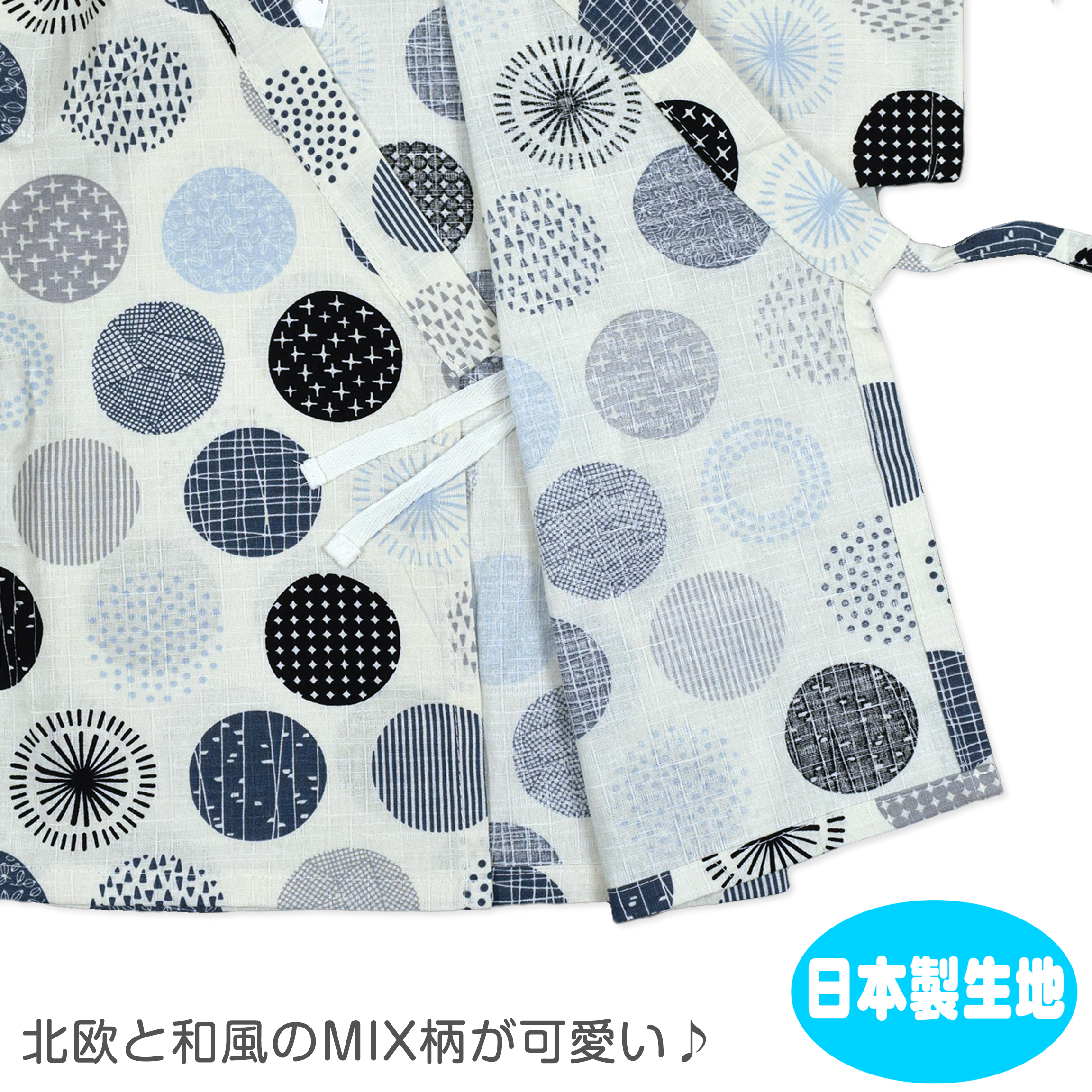☆ 商 品 説 明 ☆ 日本製生地使用 綿100% サザンクロス地 北欧水玉柄 甚平 。 北欧と和風のMIX柄が 可愛い じん平 上下セット です。安心の日本製、綿100%の生地使用です。トップスは、内側にも紐が付いていて着崩れしにくく、袖の切替部分は、千鳥かがりとなっているので涼し気。パンツのウエストはゴム。紐なし。ゴム取換え穴あり。 日本企画・日本製生地使用(中国縫製) *模様や柄の出方は個々の商品によってそれぞれ異なります。