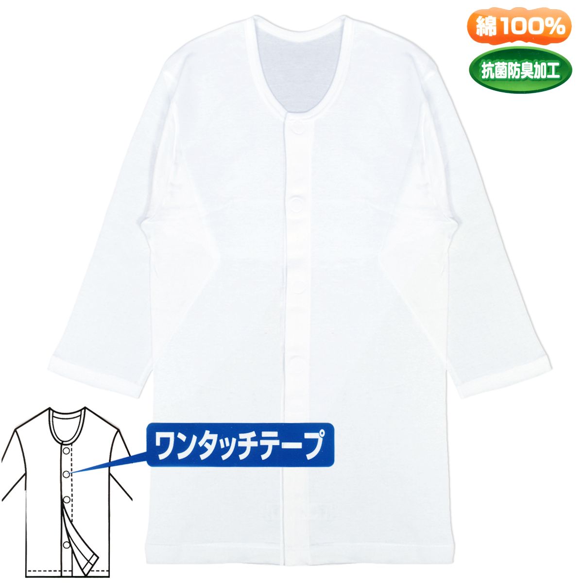 ☆ 商 品 説 明 ☆ 紳士 ワンタッチ マジックテープ付き 7分袖 前開き 肌着 です。 丸型のマジックテープを使用しているので角が肌に当たるなどの不快さもありません。 ボタンの留め外しが困難な方や術後などに役立つ 脱ぎ着 が楽ちんな肌着です。抗菌防臭 綿100%。