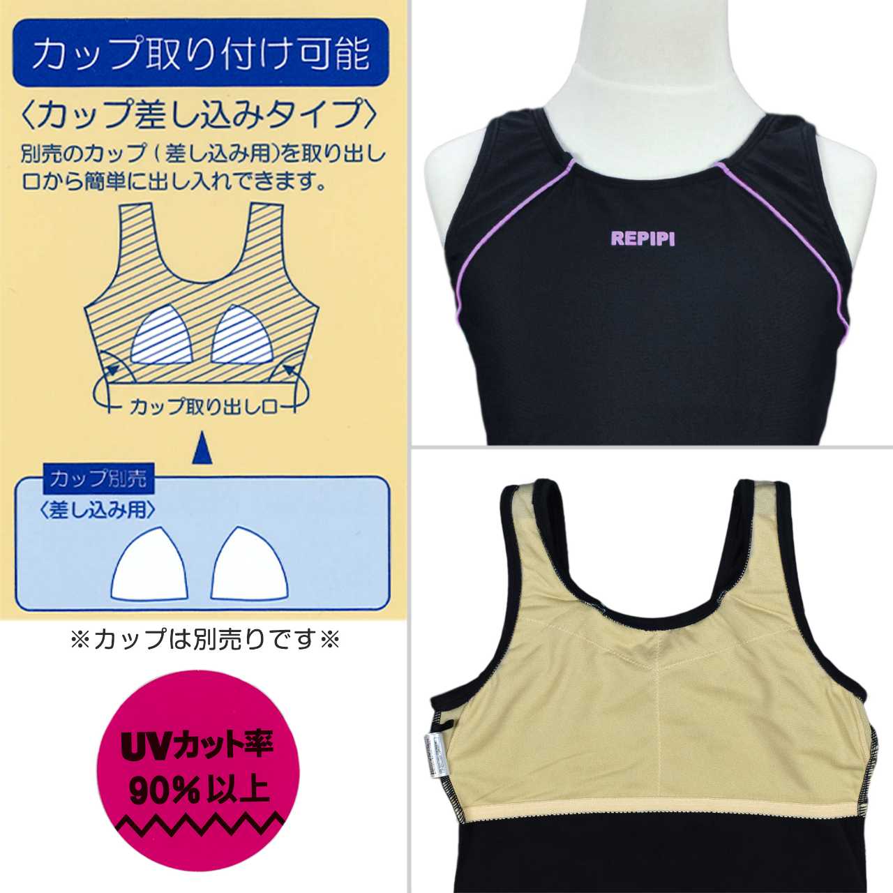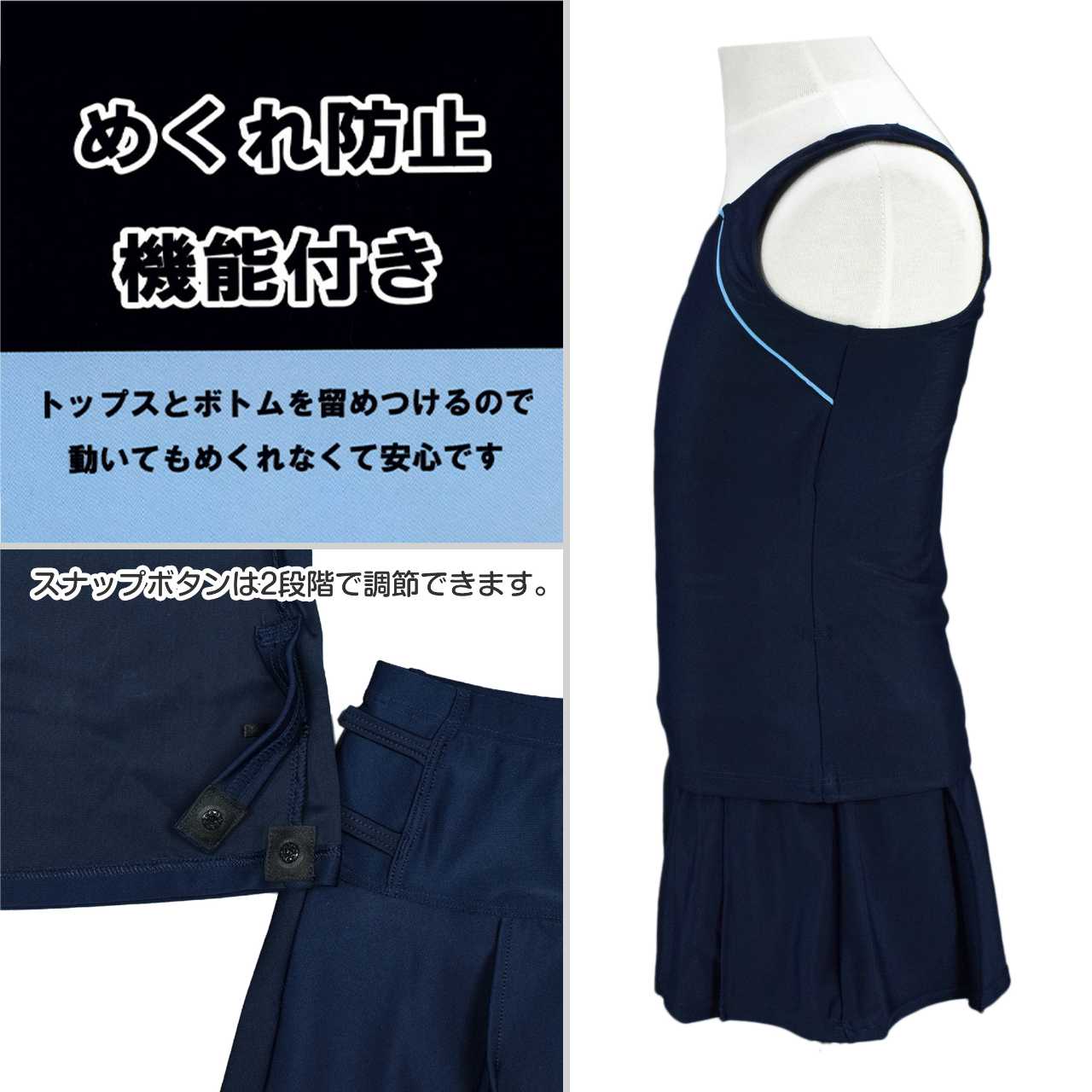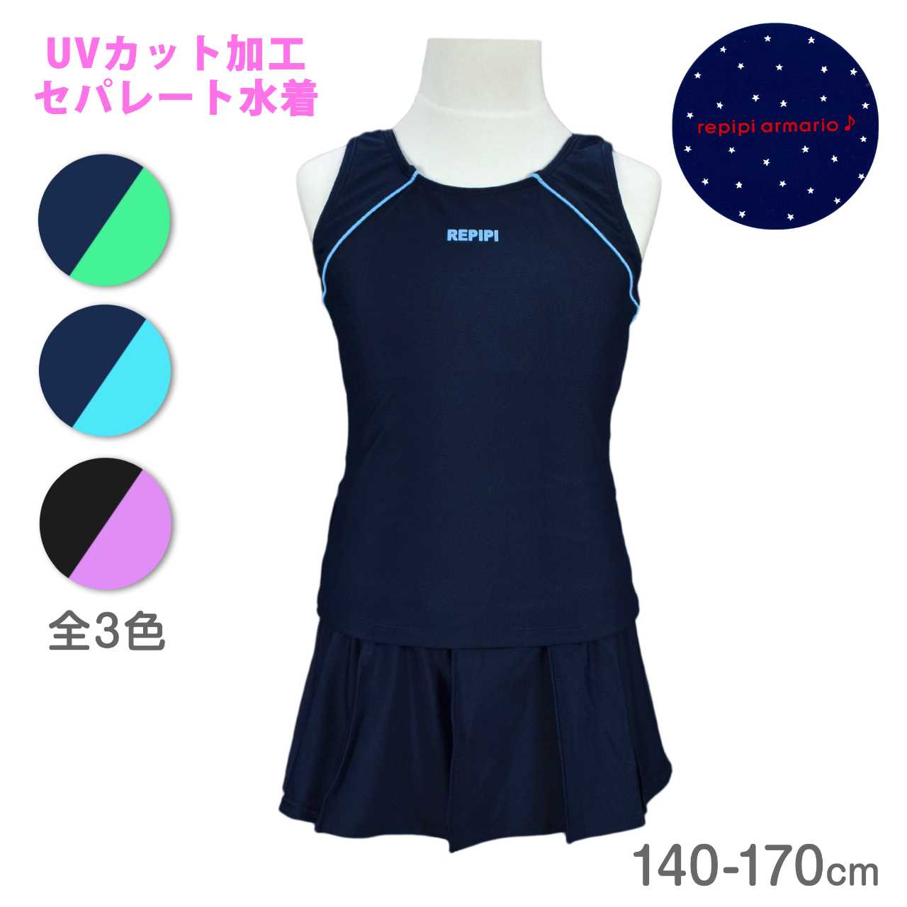 ☆ 商 品 説 明 ☆ repipi armario レピピアルマリオ UVカット スクール水着 。 UVカット率 90以上 紫外線からお肌をガードする セパレート 水着 です。シンプルなデザインで胸元にワンポイントロゴ入り。トップスはカップ取り付け可能(カップは別売り)ボトムスは プリーツスカート に 1分丈スパッツ が縫い合わされた スカパンタイプ。 トップスに付いている 両サイドのスナップボタンは ボトムスのサイドの2段階の留め位置でお好みの長さに留められ 捲れを防止し肌見え を防ぎます。