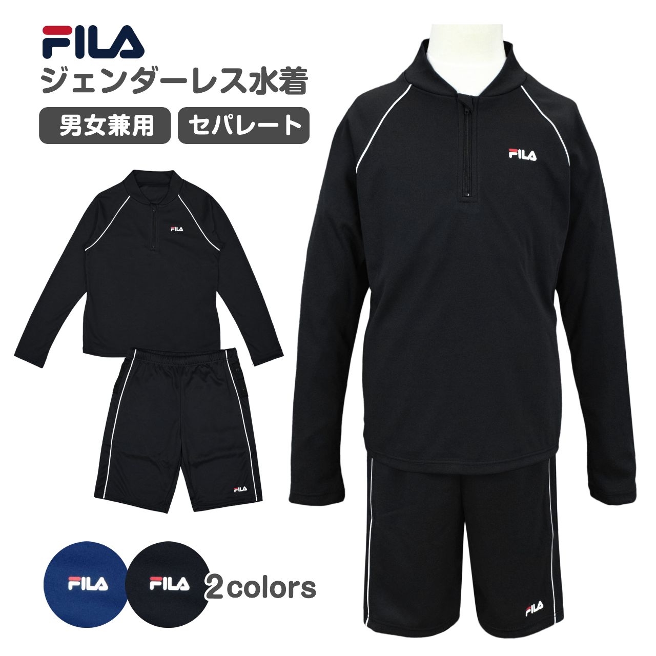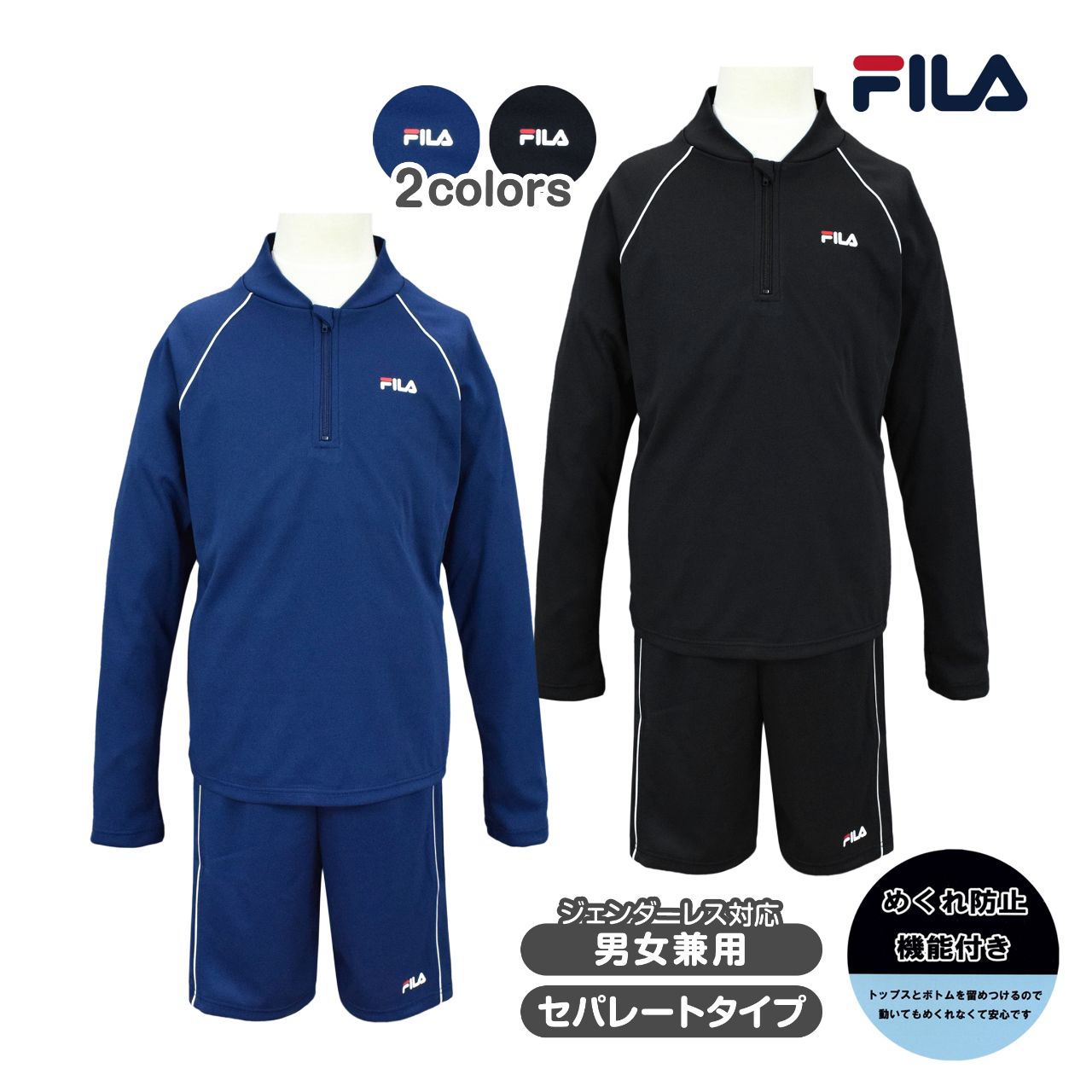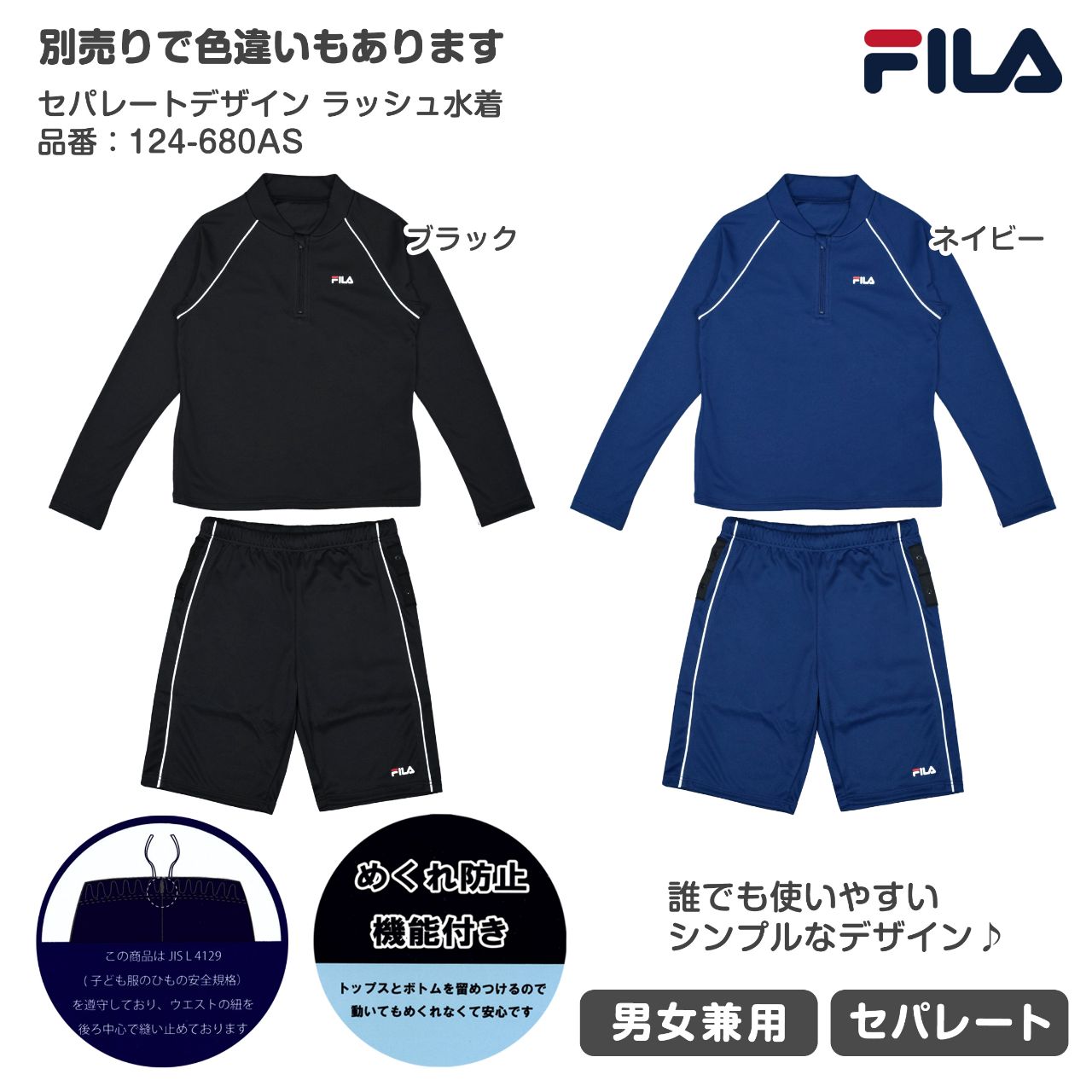 ☆ 商 品 説 明 ☆ FILA フィラ ジェンダーレス 男女兼用 セパレート ラッシュ水着 。 誰でも使いやすいシンプルなデザイン。トップスは長袖 ハーフジップ ラッシュガード 。前見頃は総裏地付き。カップ取り付け口あり(カップは別売り)ボトムスは締め付け感が少ない ルーズスパッツタイプ 。内側にボックスタイプの インナーパンツ付き で安心のフィット感。ウエストはゴム 取り換え口なし ひも付き。両サイドについているスナップボタンを留めると捲れを防止し肌見えを防いでくれます。 この商品は、JISL4129 (子供服の紐の安全規格)を尊守しておりウエストの紐を後ろ中心で縫い留めてあります。
