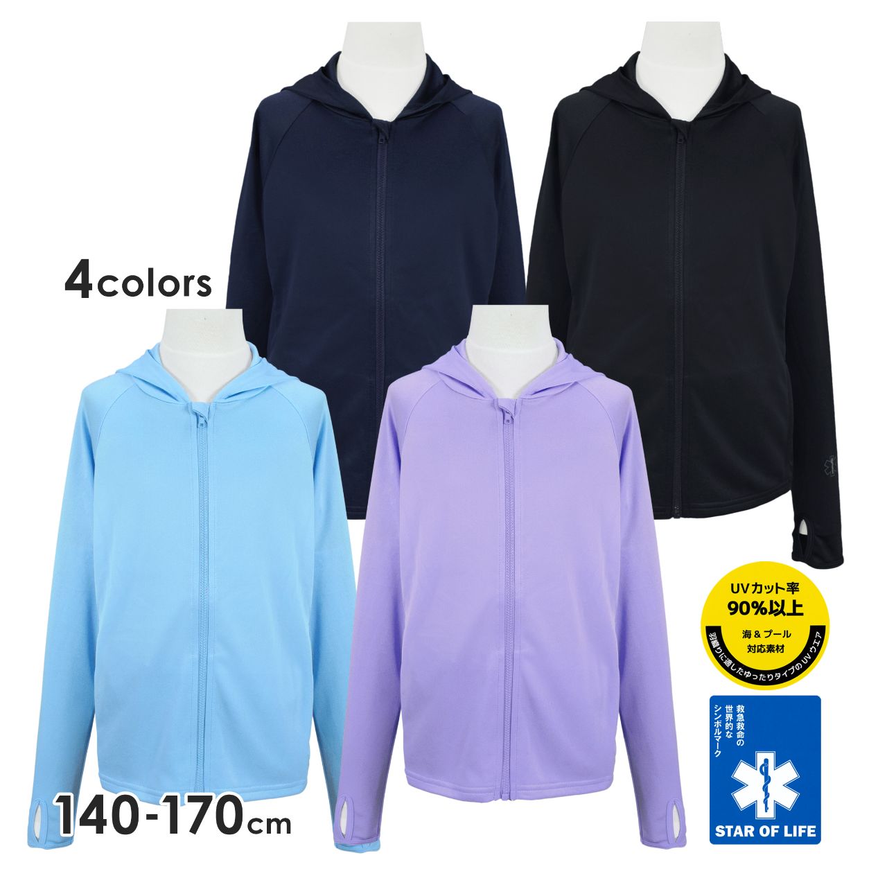 ☆ 商 品 説 明 ☆ STAR OF LIFE スターオブライフ UVカット フード付き 長袖ラッシュガード 。 UVカット率90%以上 海 プール 水陸両用の ラッシュガード です。親指を通せる サムホール付き で手の甲の日焼けを防止します。前立ては フルジップ でさっと羽織るのも簡単。BBQ 潮干狩り 普段着としても着用していただけます。ポケット前2つ。フードは取り外しできません。 ※ STAR OF LIFEとは、救急医療の世界的シンボルマークす。