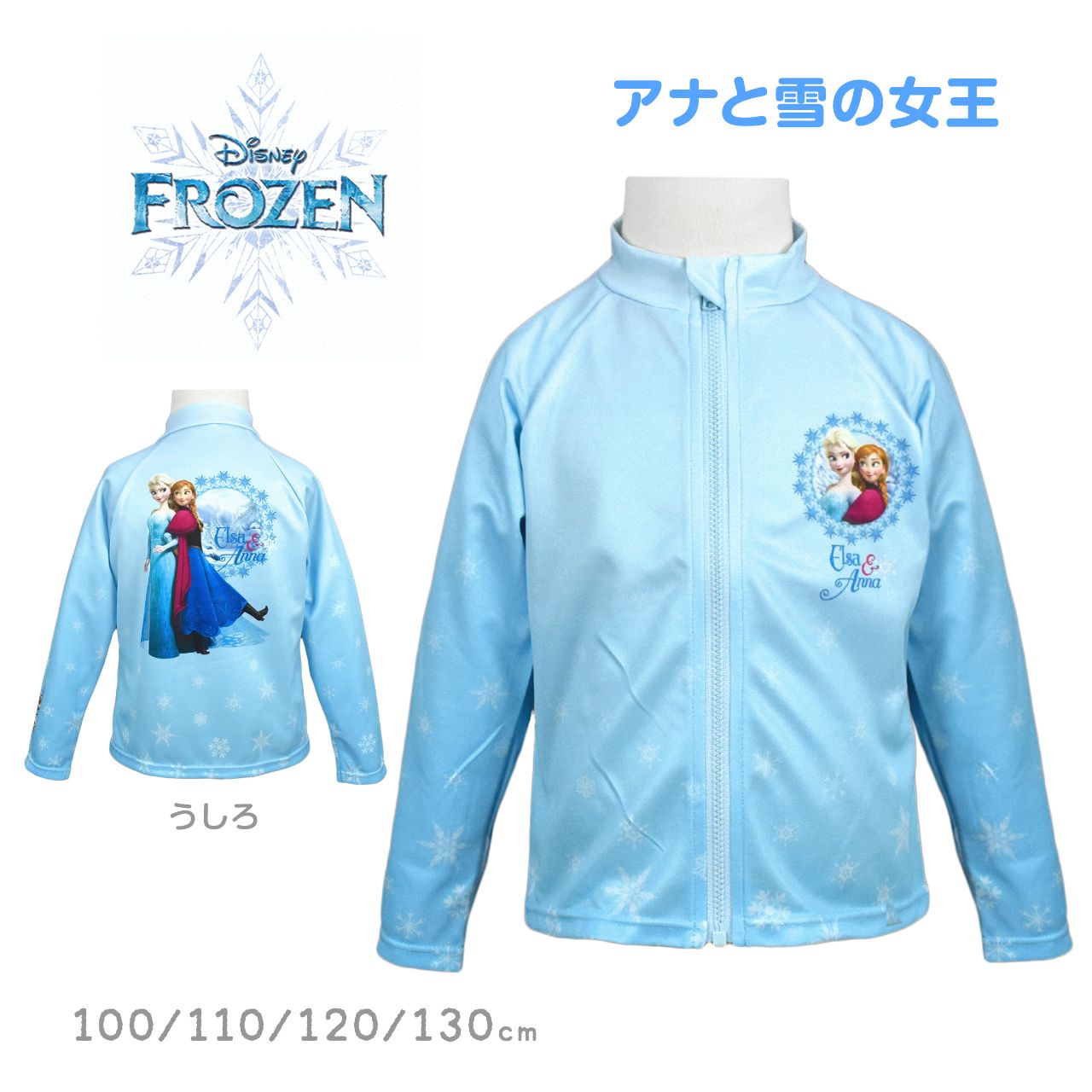 ☆ 商 品 説 明 ☆ Disney ディズニー アナと雪の女王 水陸両用 長袖ラッシュガード 。 耐塩素生地使用 オールラウンド水陸両用 UVウェア 。グラデーション地に アナとエルサ のかわいいプリント入り長袖ラッシュガード。後ろは2人の大きな全身、袖口にはかわいくて愉快な オラフ のプリント入り。紫外線遮蔽率90% 日焼け、擦り傷、虫刺され防止に必須のアイテム 。水辺のレジャーに限らず 普段使いのシーンでも着用できます。 ファスナーガード付き。