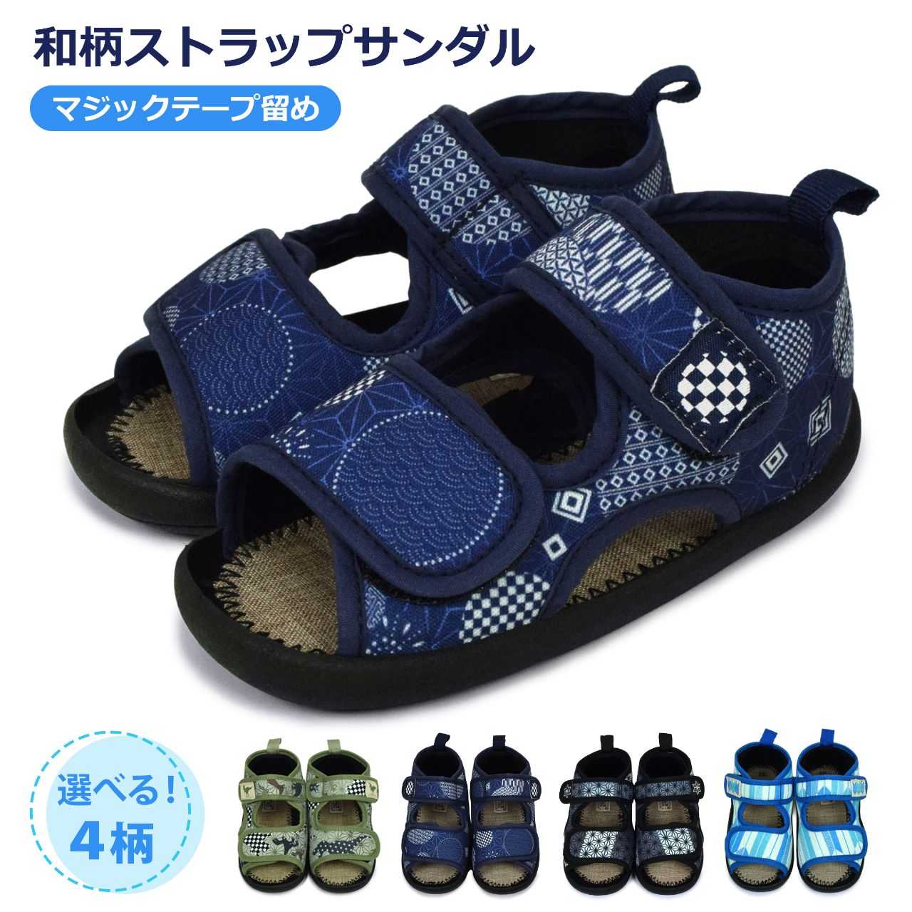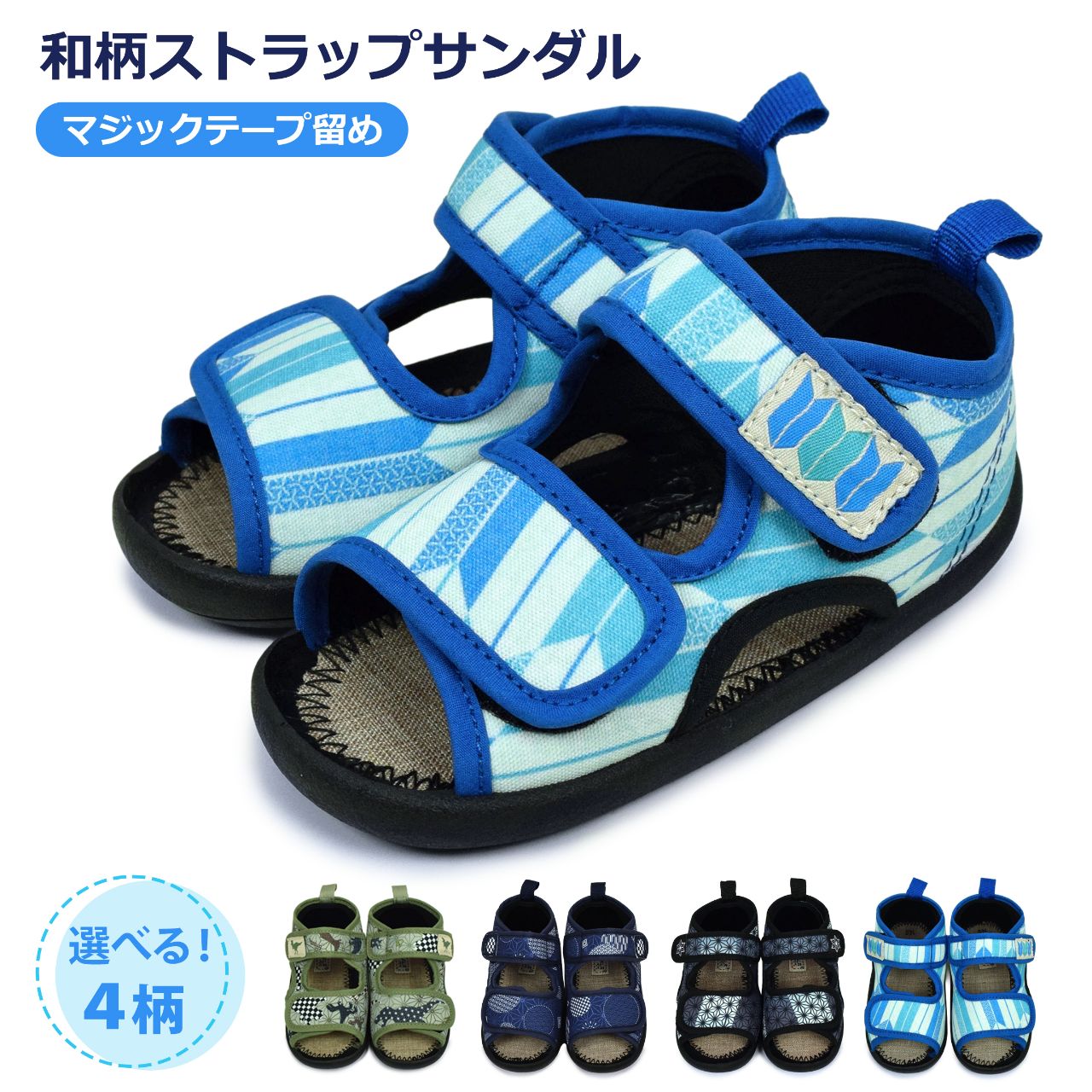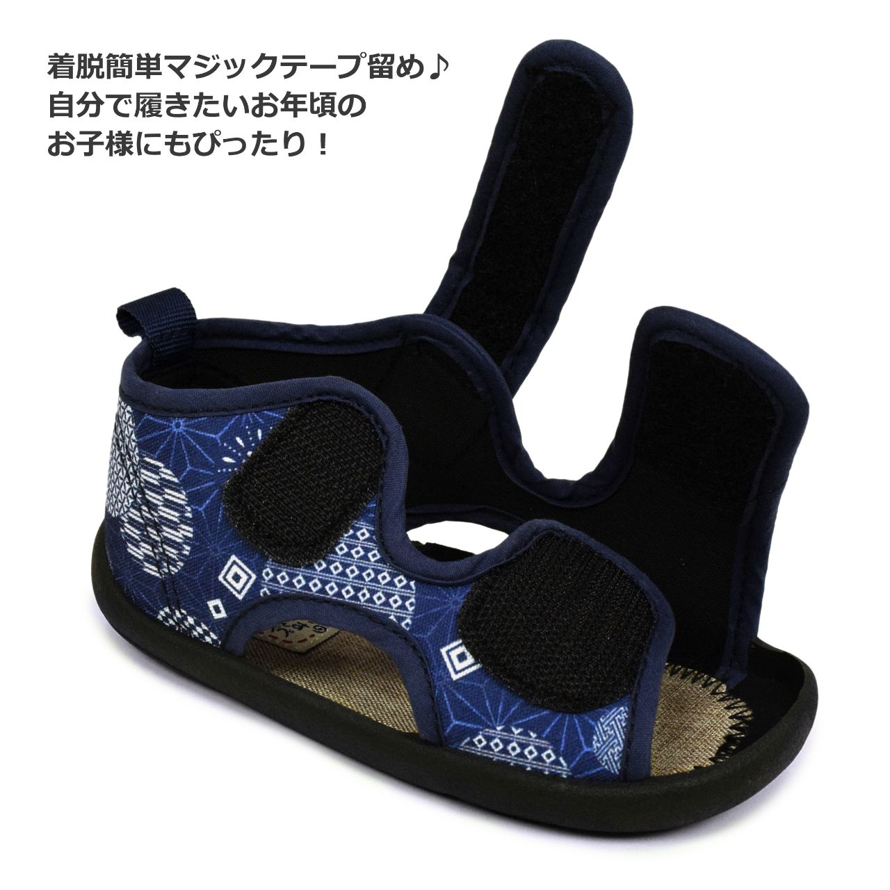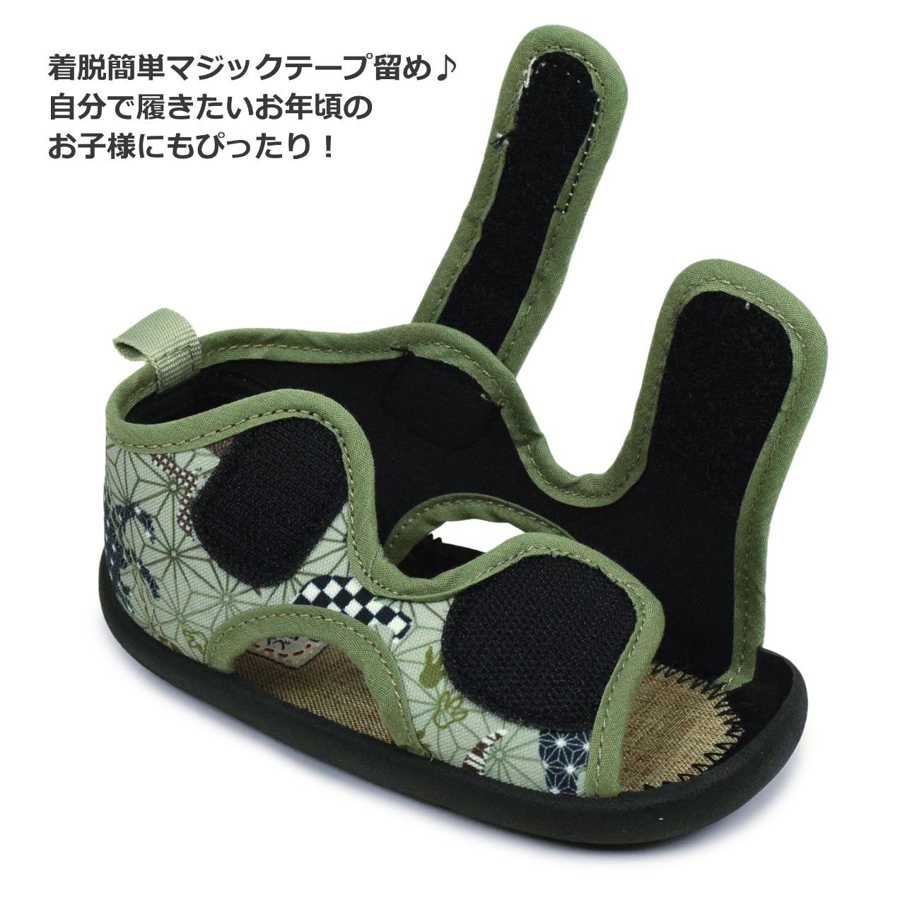 ☆ 商 品 説 明 ☆ くろわっさんすべべ 和柄 マジックテープ式 サンダル 。 浴衣 甚平 に合わせやすい和柄、マジックテープ留め ストラップサンダル です。お祭り イベント 普段使いにもおすすめです。マジックテープ で簡単に着脱。らくらく履けるから自分で履きたい お年頃のお子様にもピッタリ。足底は柔らかく歩きやすくなっています。 *模様や柄の出方は個々の商品によってそれぞれ異なります。