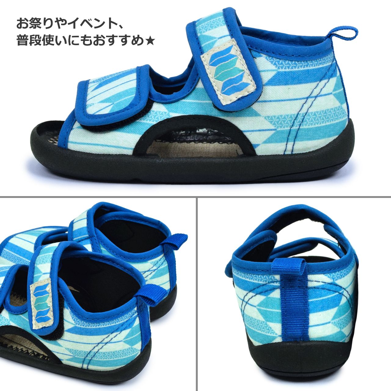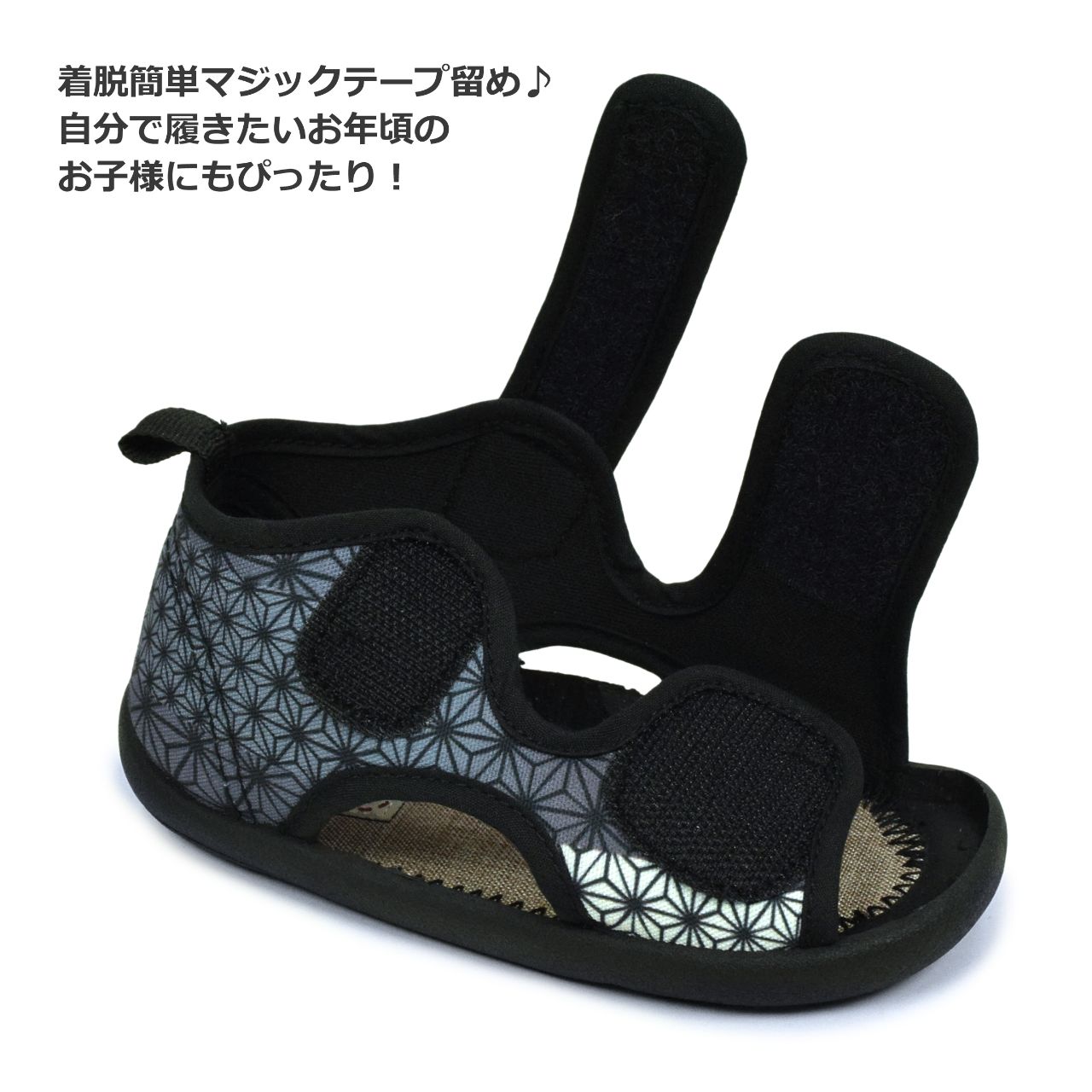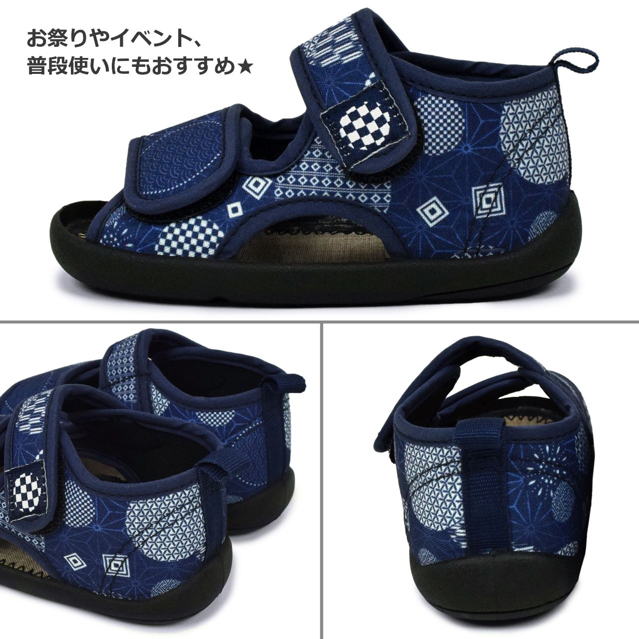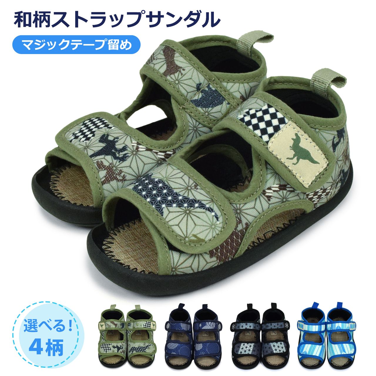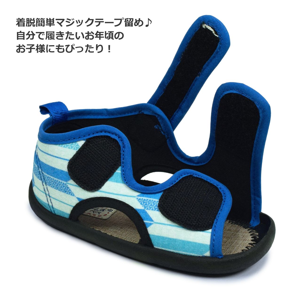 ☆ 商 品 説 明 ☆ くろわっさんすべべ 和柄 マジックテープ式 サンダル 。 浴衣 甚平 に合わせやすい和柄、マジックテープ留め ストラップサンダル です。お祭り イベント 普段使いにもおすすめです。マジックテープ で簡単に着脱。らくらく履けるから自分で履きたい お年頃のお子様にもピッタリ。足底は柔らかく歩きやすくなっています。 *模様や柄の出方は個々の商品によってそれぞれ異なります。