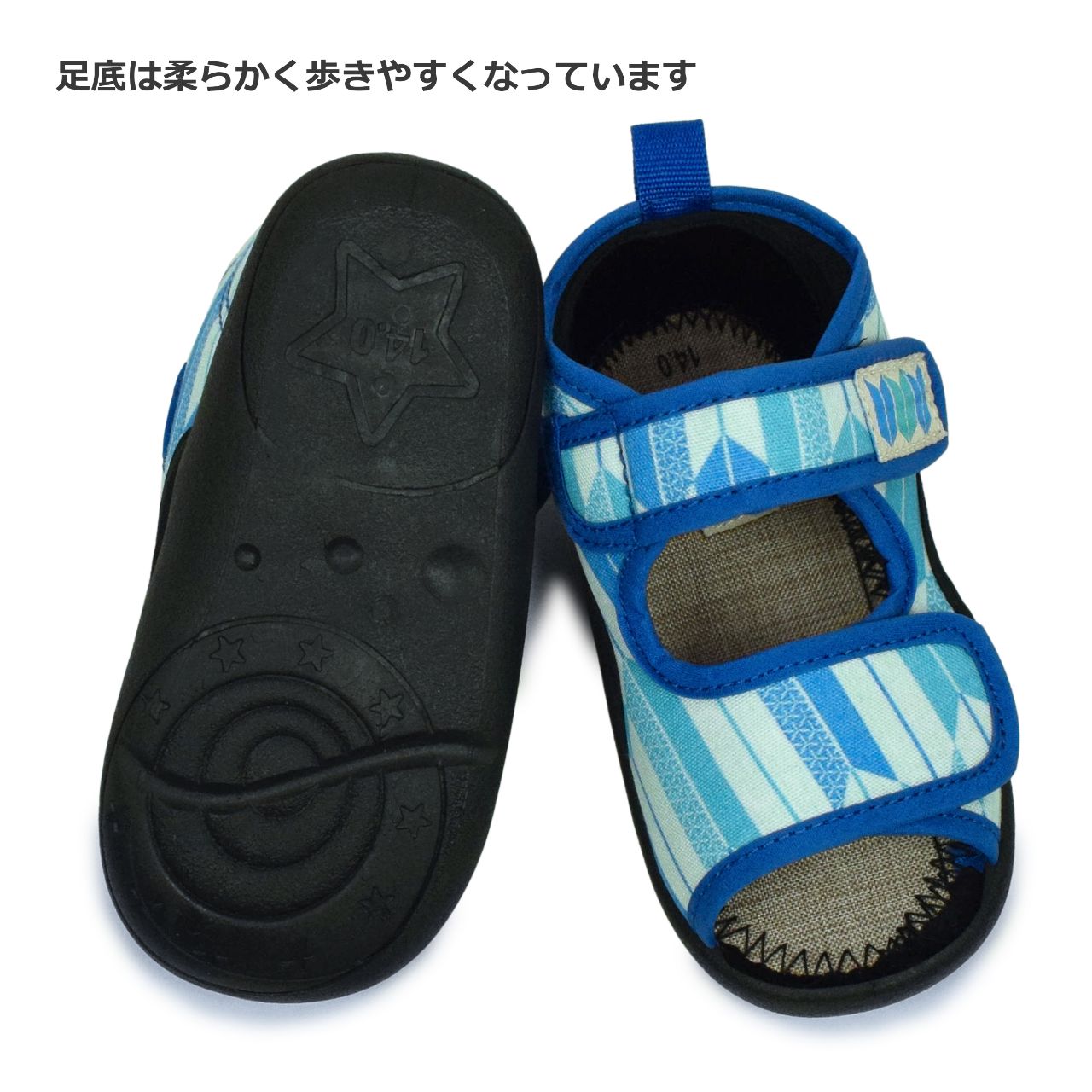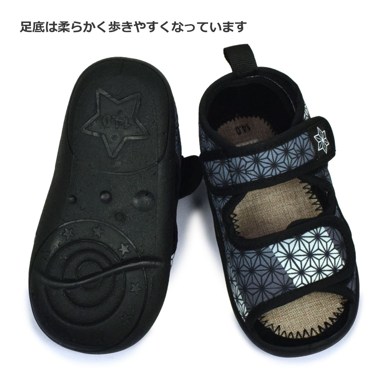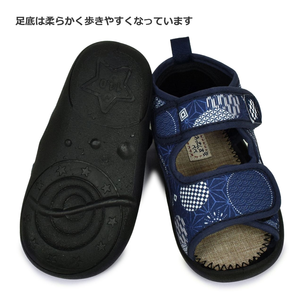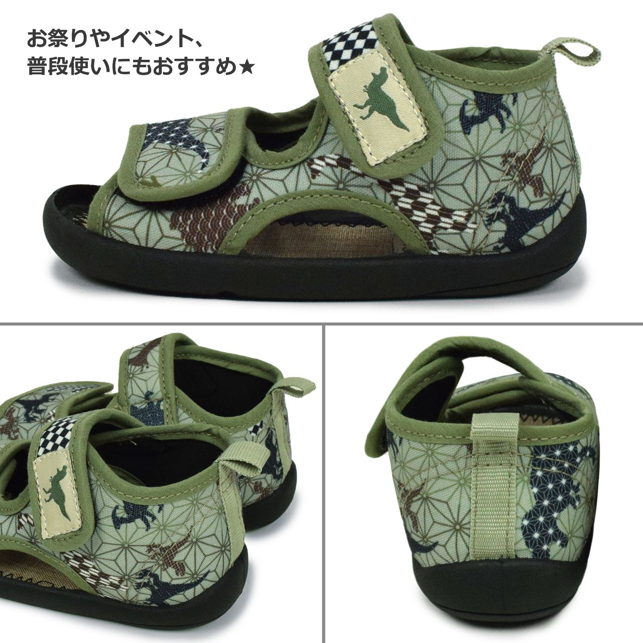 ☆ 商 品 説 明 ☆ くろわっさんすべべ 和柄 マジックテープ式 サンダル 。 浴衣 甚平 に合わせやすい和柄、マジックテープ留め ストラップサンダル です。お祭り イベント 普段使いにもおすすめです。マジックテープ で簡単に着脱。らくらく履けるから自分で履きたい お年頃のお子様にもピッタリ。足底は柔らかく歩きやすくなっています。 *模様や柄の出方は個々の商品によってそれぞれ異なります。