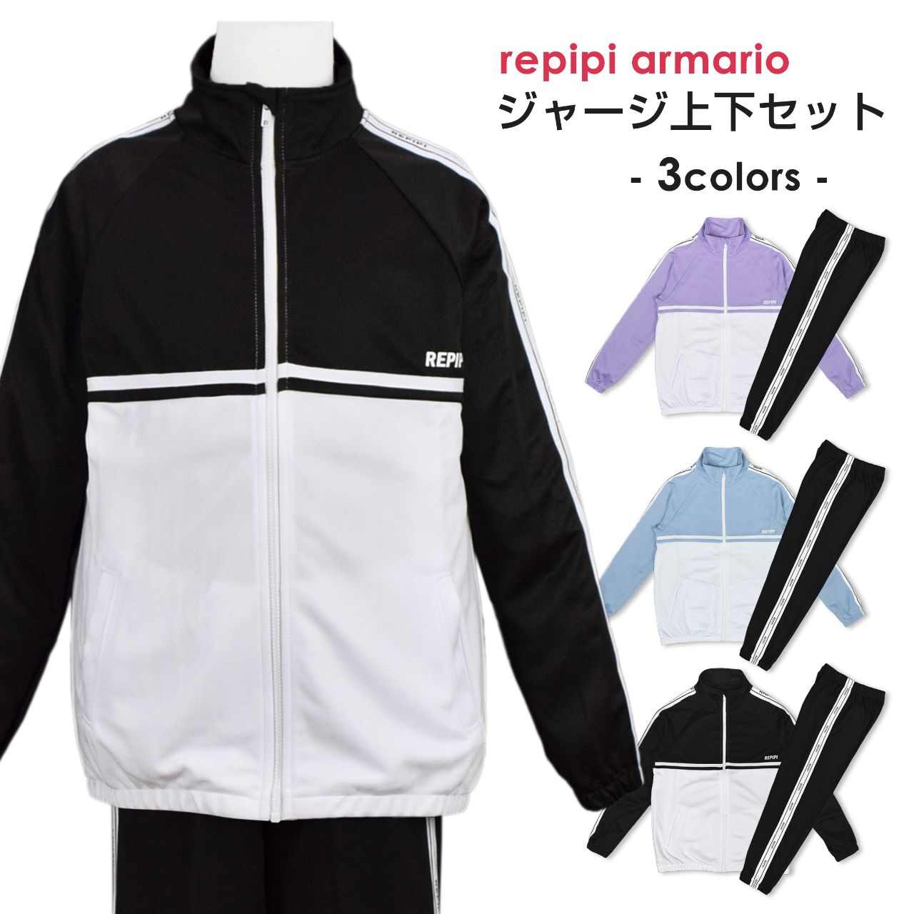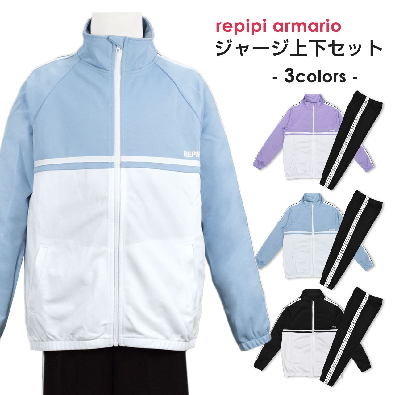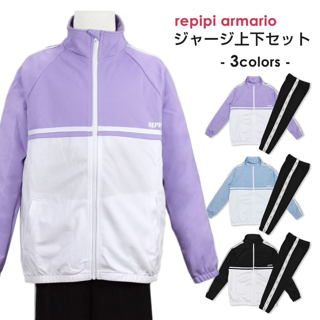 ☆ 商 品 説 明 ☆ repipi armario レピピアルマリオ 切り替え ジャージ 上下セット 。 UVカット率90%以上で 気になる紫外線からお肌をガード。ジャケットは前開きファスナー仕様。パンツはウエストゴム、ゴム取り替え穴なし、紐付き。裾にゴムが入ったジョガーパンツタイプ。ジャケット、ボトムスに各2つポケットあり。サイドロゴテープがアクセントのかわいい トレーニングウェア です。