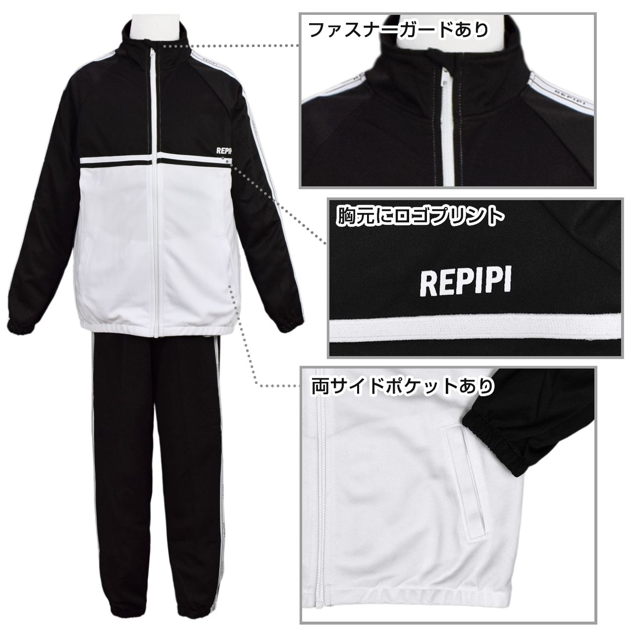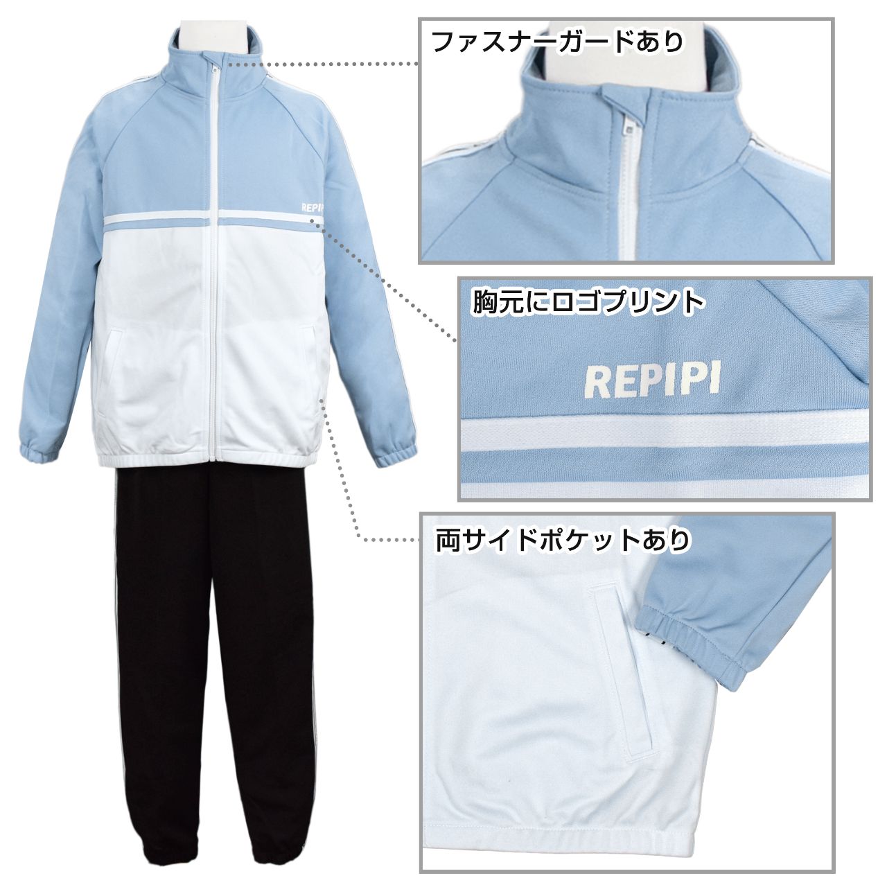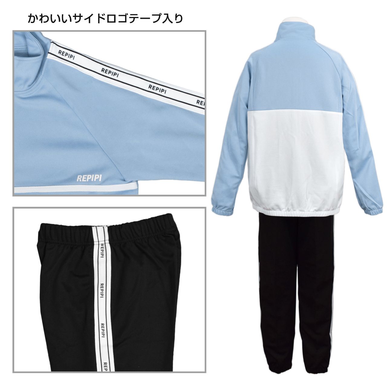 ☆ 商 品 説 明 ☆ repipi armario レピピアルマリオ 切り替え ジャージ 上下セット 。 UVカット率90%以上で 気になる紫外線からお肌をガード。ジャケットは前開きファスナー仕様。パンツはウエストゴム、ゴム取り替え穴なし、紐付き。裾にゴムが入ったジョガーパンツタイプ。ジャケット、ボトムスに各2つポケットあり。サイドロゴテープがアクセントのかわいい トレーニングウェア です。