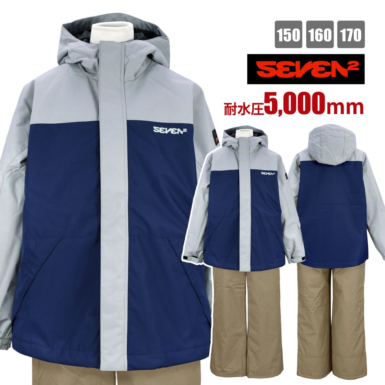 ☆ 商 品 説 明 ☆ SEVEN2 セブンツー 耐水圧5000mm サイズ調整可能 スキーウェア上下セット。 シンプル 無地がおしゃれな スノー ウェア上下セット です。 【ジャケット】 袖口は一部ゴム、マジックテープ留め。フードは取り外し不可。前面にマジックテープ付き ポケット が2つ、大きく開いて出し入れしやすい設計。パスケース あり(左袖)。裾はドローコード。襟元にネームタグ付き。 【パンツ】 サスペンダー 取り外し不可。ウェストは後ろ一部ゴム・サイドマジックテープ。フロントはスナップボタン・ファスナー。マジックテープ付き ポケット2つ。スノーガード あり、エッジカード あり。お尻は縫い目をなくして水の染み込みを軽減する ノーシームヒップ 。