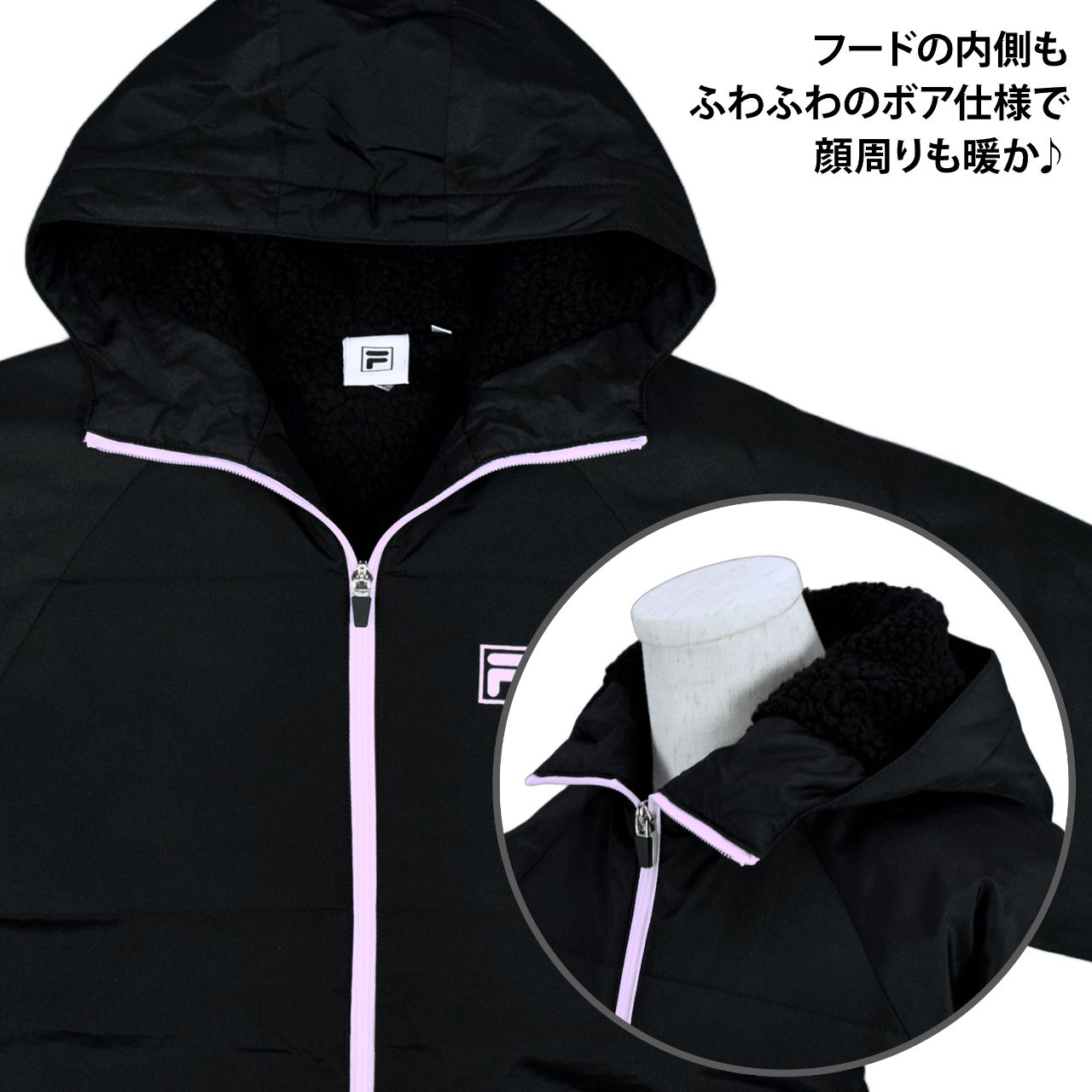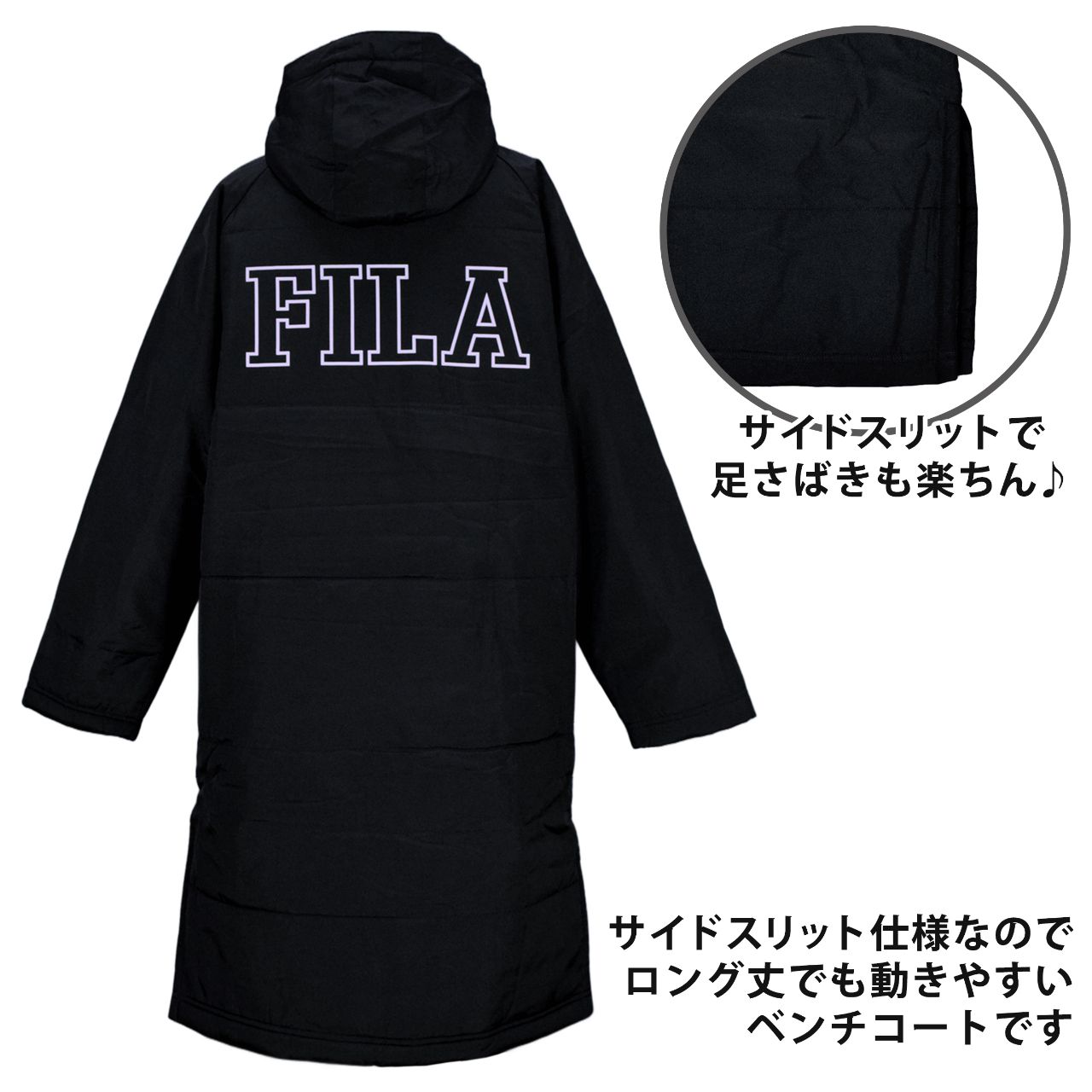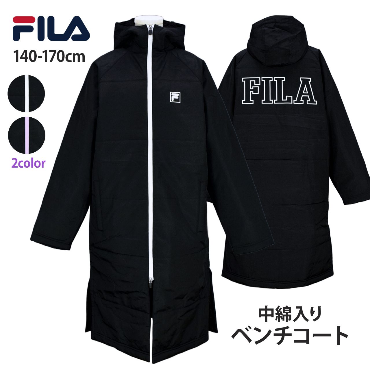 ☆ 商 品 説 明 ☆ FILA フィラ ダブルファスナー 中綿入り ベンチコートです。 Wファスナーとサイドスリットでロング丈でも動きやすい ロングコート です。 フード内側、背中内側部分、袖口にはボアが付いているのでとても暖か。袖の裏地はポリエステル地で滑りがよく袖通しもらくらくです。胸元には ワンポイントのロゴ刺しゅう入り。男女ともに使えるベンチコートです。フード取り外し不可。両サイドにポケット付き。背中にロゴプリント入り。 ※ Wファスナーの取り扱い方にはご注意願います。