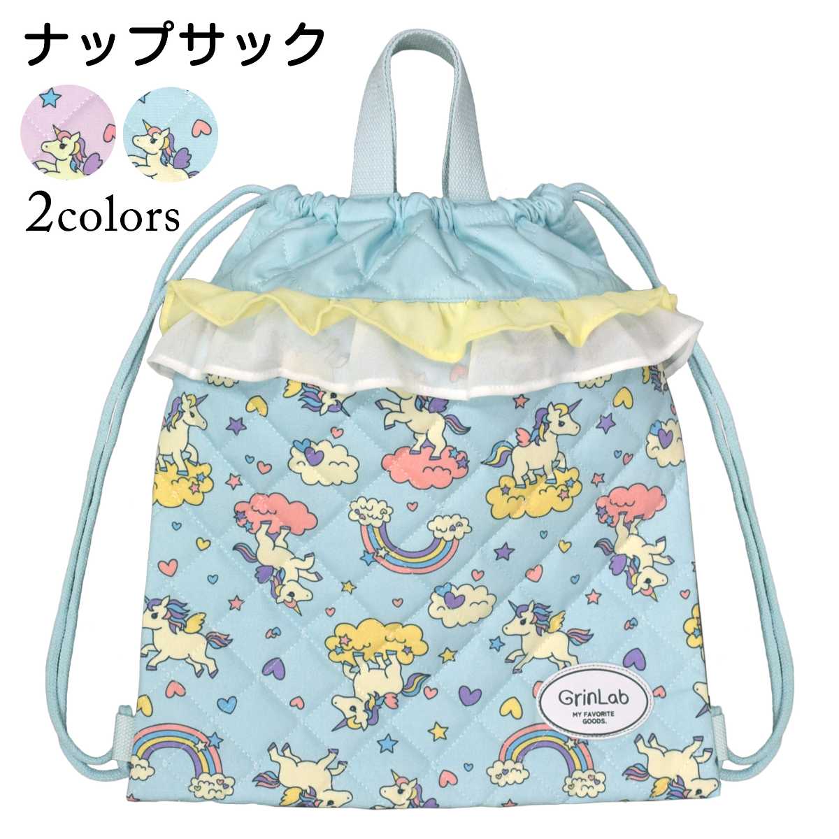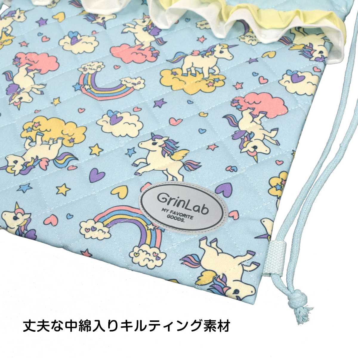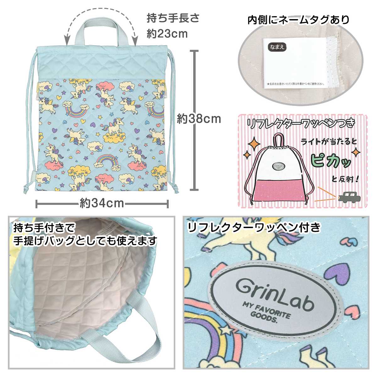 ☆ 商 品 説 明 ☆ 入園入学 ユニコーン プリント入り キルトナップサック。 入園入学にお役立ちアイテムの キルティングナップサック です。持ち手 が付いているので手にも持てるデザインです。ネームタグ付き。キルト仕様。前面に リフレクター 付きで安全面にも配慮しました。入園入学などの お祝い にプレゼントとして おすすめのナップサックです。 ※ 注意事項 ・素材の性質により、摩擦や水濡れなどで色落ち、色移りする恐れがありますのでご注意ください。 ・洗濯・乾燥機の使用はおやめ下さい。 ・付属品のお取り扱いには、ご注意ください。 ※ 園児 幼稚園 小学生 キッズ 女の子 女児 ガールズ 子供用 ※ 入園 入学 新学期 入園準備 入学準備 通園 通学 習い事 ※ 通園バッグ 通学バック 体操服袋 体操着袋 着替え お着替え袋 体育着入れ 巾着