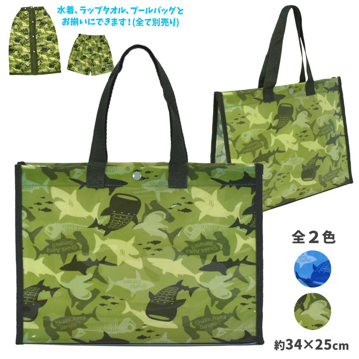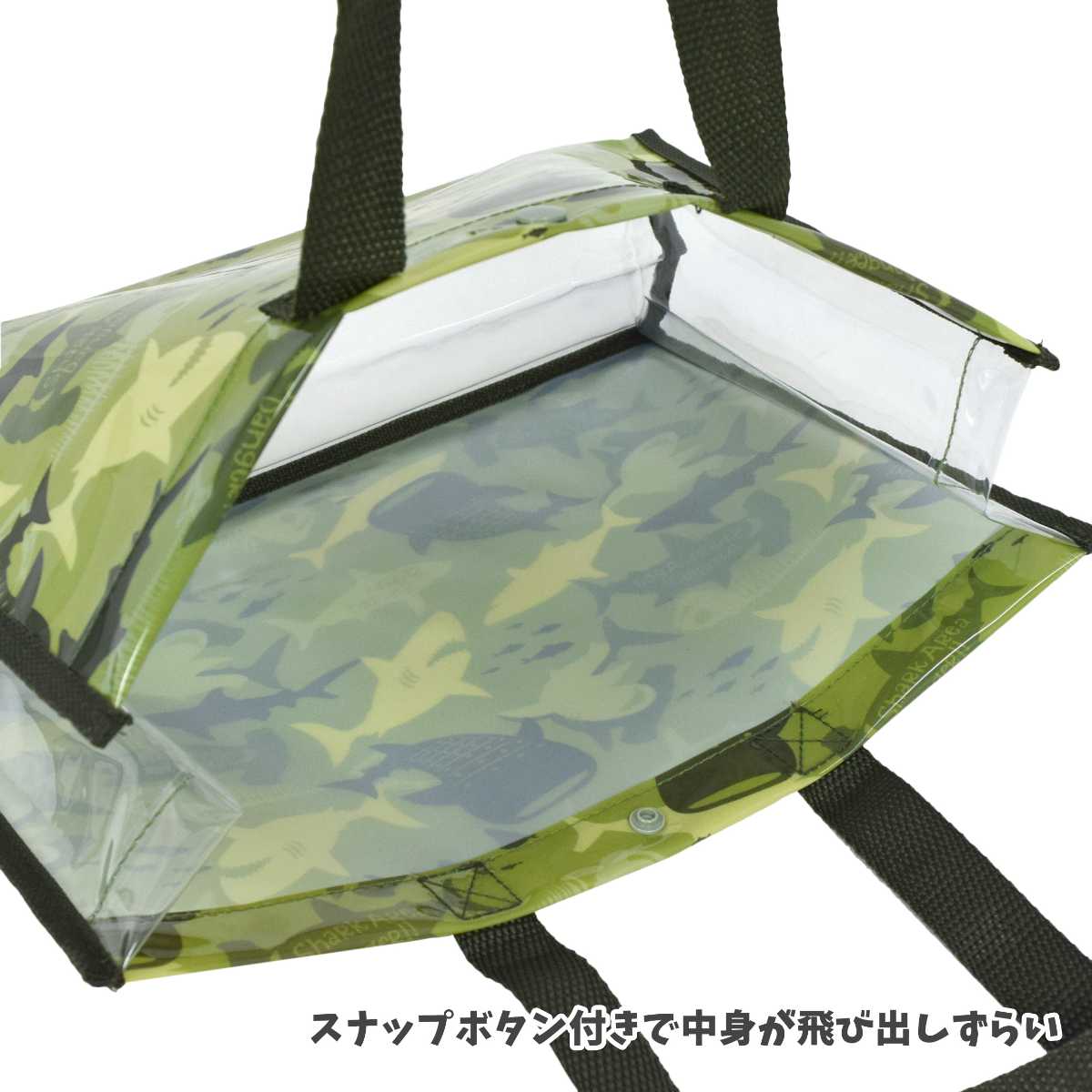 ☆ 商 品 説 明 ☆ シャーク カモフラプリント ビニールバッグ 。 色々なサメのシルエットプリントが おしゃれ プールバッグ です 。プール 海 温泉 など、マチがあるのでタオルや水着 着替え などもたっぷり入ります。上部にはワンボタン付きで中身が飛び出しずらくなっています。