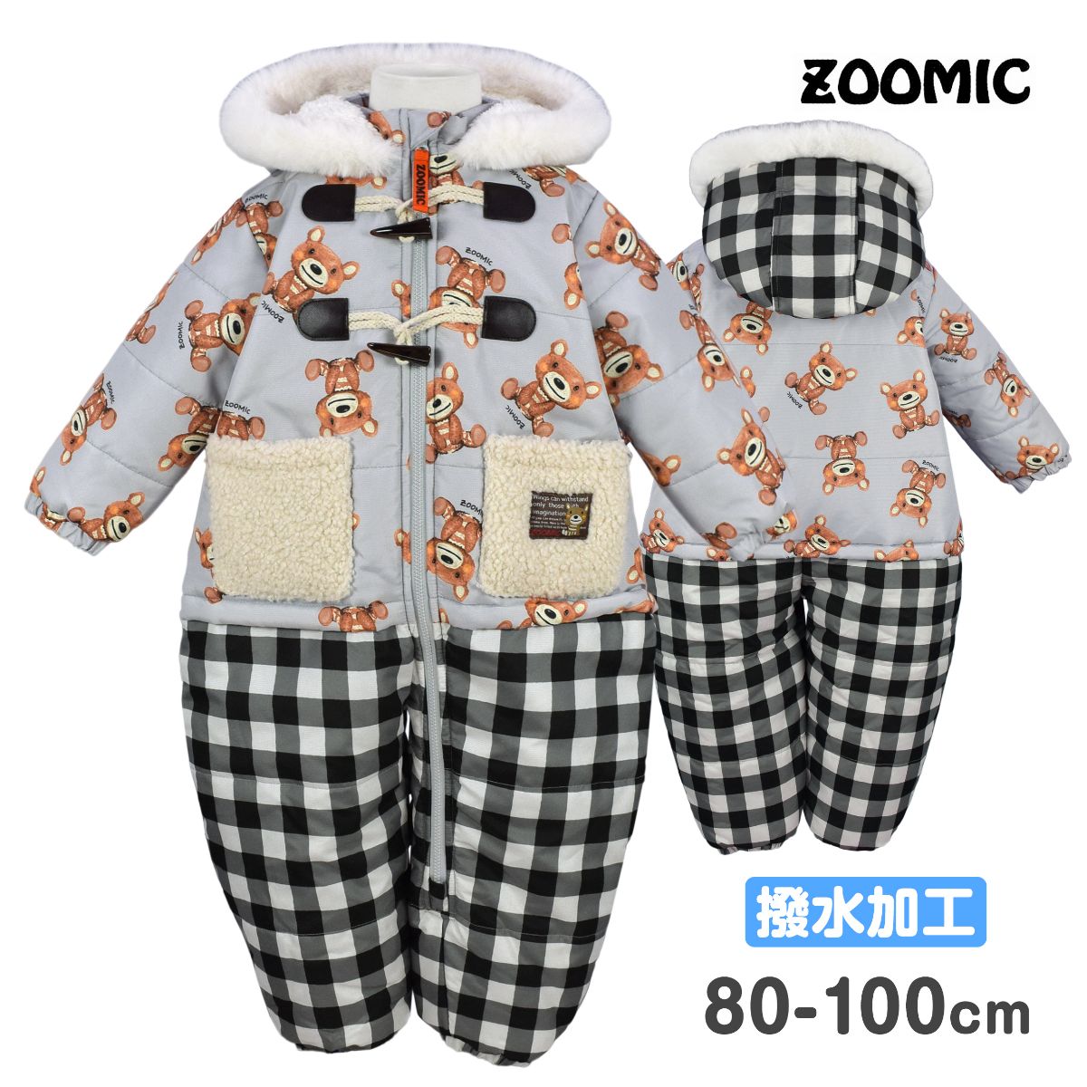 ☆ 商 品 説 明 ☆ ZOOMIC ズーミック 撥水加工 中綿入り ジャンプスーツ 。 可愛い クマプリント入りのスノーウェア です。裏地は袖以外フリース使いであったか 。フロントはトグルボタンで。ダッフル風 のデザイン。ポケットは もこもこボア仕様。フード内側 ボア使い 。ファスナーガード あり。フード取り外し不可。手首・足首ゴム入り。スノーガード あり。着脱が楽にできる膝下までのファスナー付き 。 ※別売りのアイテムとお揃いにできます。 スノーミトン 品番 234027AS ニットキャップ 品番 234009AS 足カバー 品番 234831AS