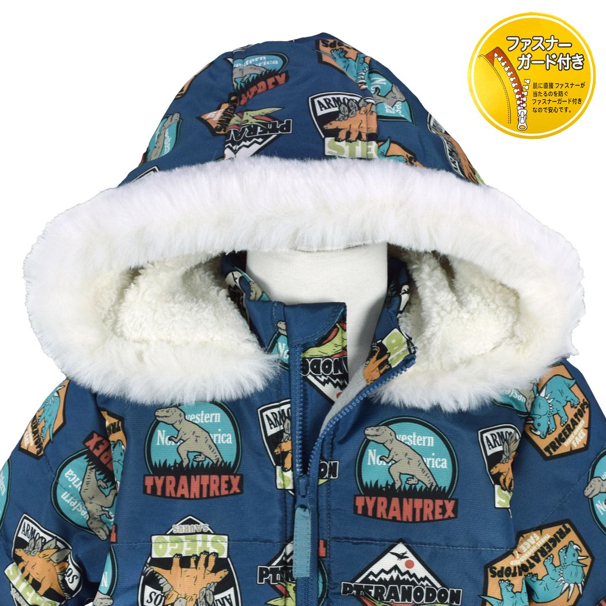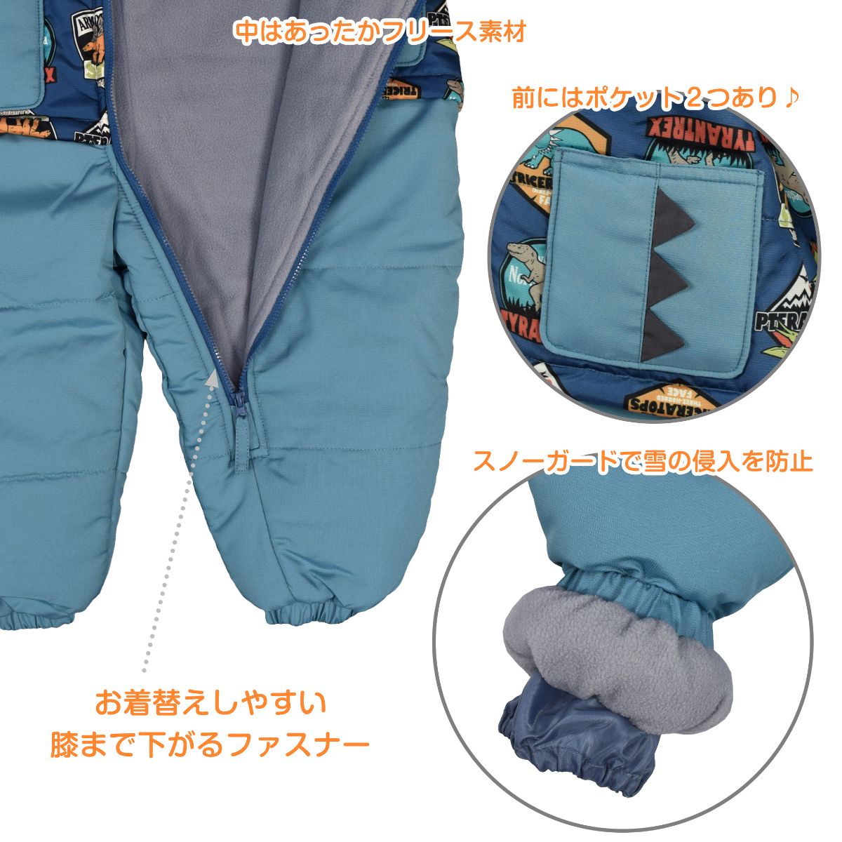 ☆ 商 品 説 明 ☆ corekite コレキテ 撥水加工 中綿入り ジャンプスーツ 。 プテラノドン ティラノサウルス ステゴサウルス トリケラトプス 恐竜 のプリント入り スノーウェア です。裏地は袖以外フリース使いであったか 。かわいい背びれ付きポケット。フード内側 ボア使い。ファスナーガード あり。フード取り外し不可。手首リブ・足首ゴム入り。スノーガード あり。着脱が楽にできる膝下までのファスナー付き 。 ※ 柄の出方は個々の商品によってそれぞれ異なります。 ※別売りのアイテムとお揃いにできます。 スノーミトン 品番 234022AS ニットキャップ 品番 234004AS 足カバー 品番 234826AS