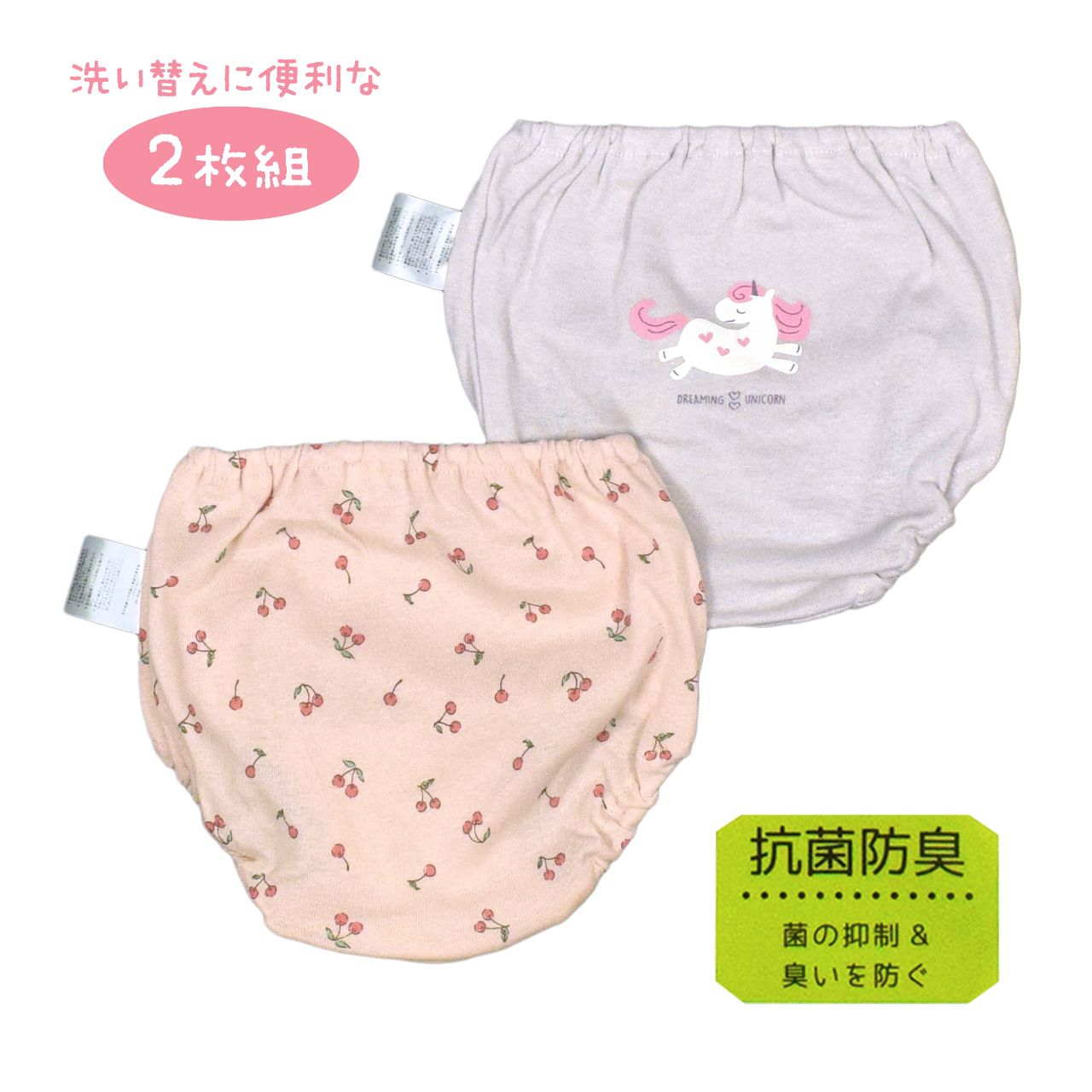 ☆ 商 品 説 明 ☆ 抗菌防臭 綿100% 柄違い ショーツ 2枚組 。 ユニコーン さくらんぼ 2柄 2枚セット のショーツです。菌の抑制、臭いを防ぐ抗菌防臭。綿100%素材でお肌にやさしく、やわらかな肌触りでいつでも快適な着心地。洗濯表示のタグはお肌に触れない外付け仕様。毎日の 洗い替え に嬉しい 2枚組セット です。 ※別売りの半袖スリーマー 品番 235201AS