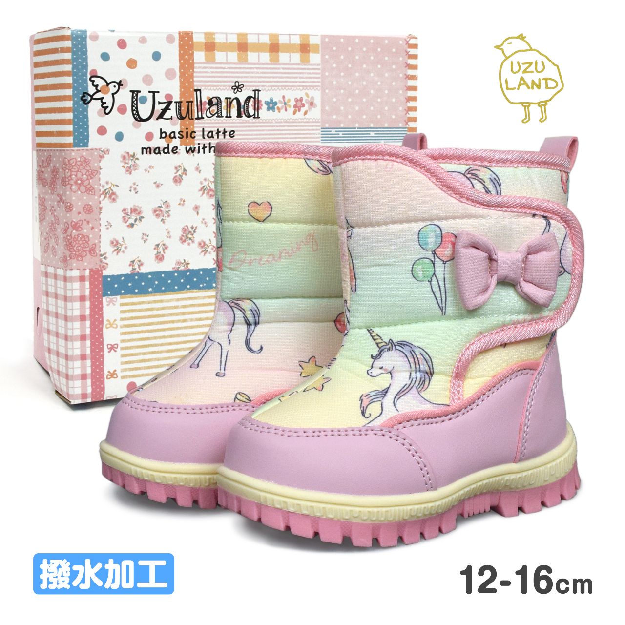 ☆ 商 品 説 明 ☆ UZULAND ウズランド はっ水加工 スノーブーツ 。 かわいい ユニコーンプリントの ウィンターブーツ です。撥水加工で雨や雪を弾きます。中敷きはボアであたたか 。サイド マジックテープ留め、プルストラップも付いているので着脱もらくちん。 ※ 柄の出方は個々の商品によってそれぞれ異なります。