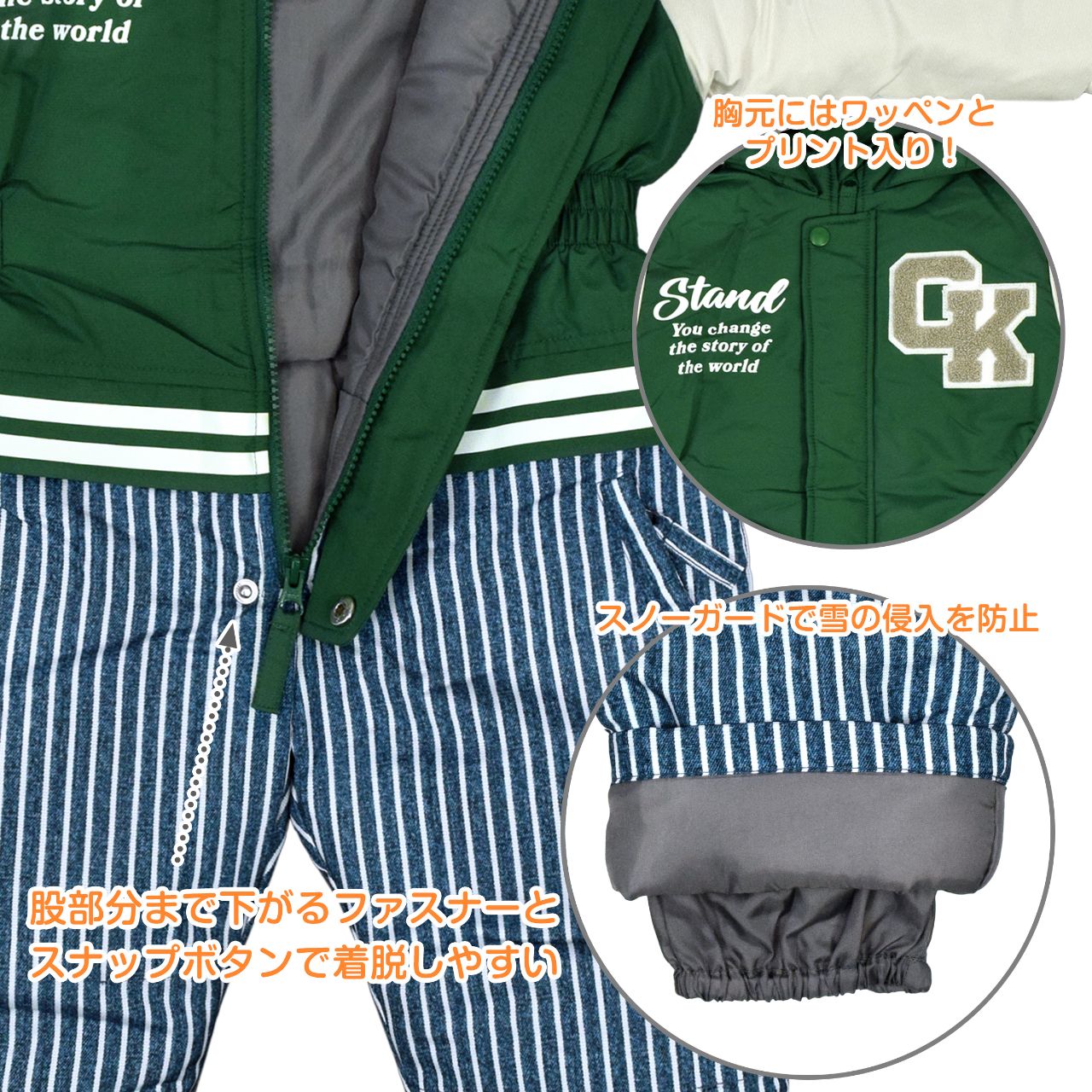 スタジャン風デザイン スノーウェア です。ウエストはサイドに シャーリングが入ったデザイン。裏地は着脱のしやすいポリエステル地。ファスナーガード あり。フード 取り外し不可。手首ゴム入り。前立てのファスナーは股部分まで。スノーガード あり。