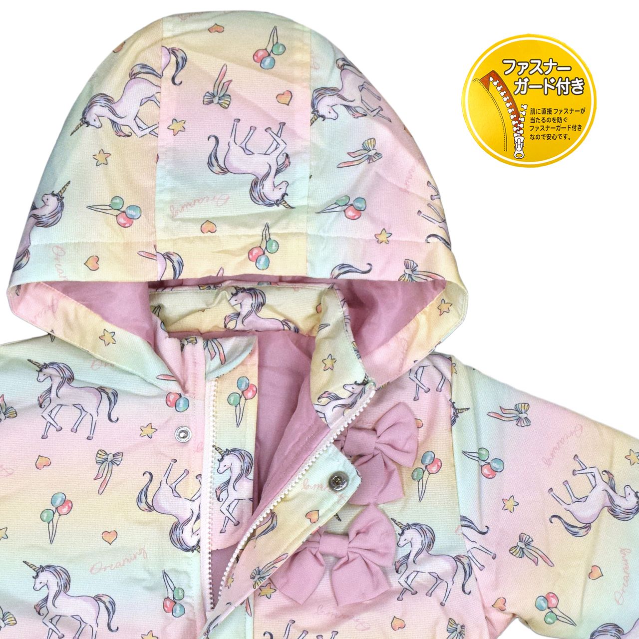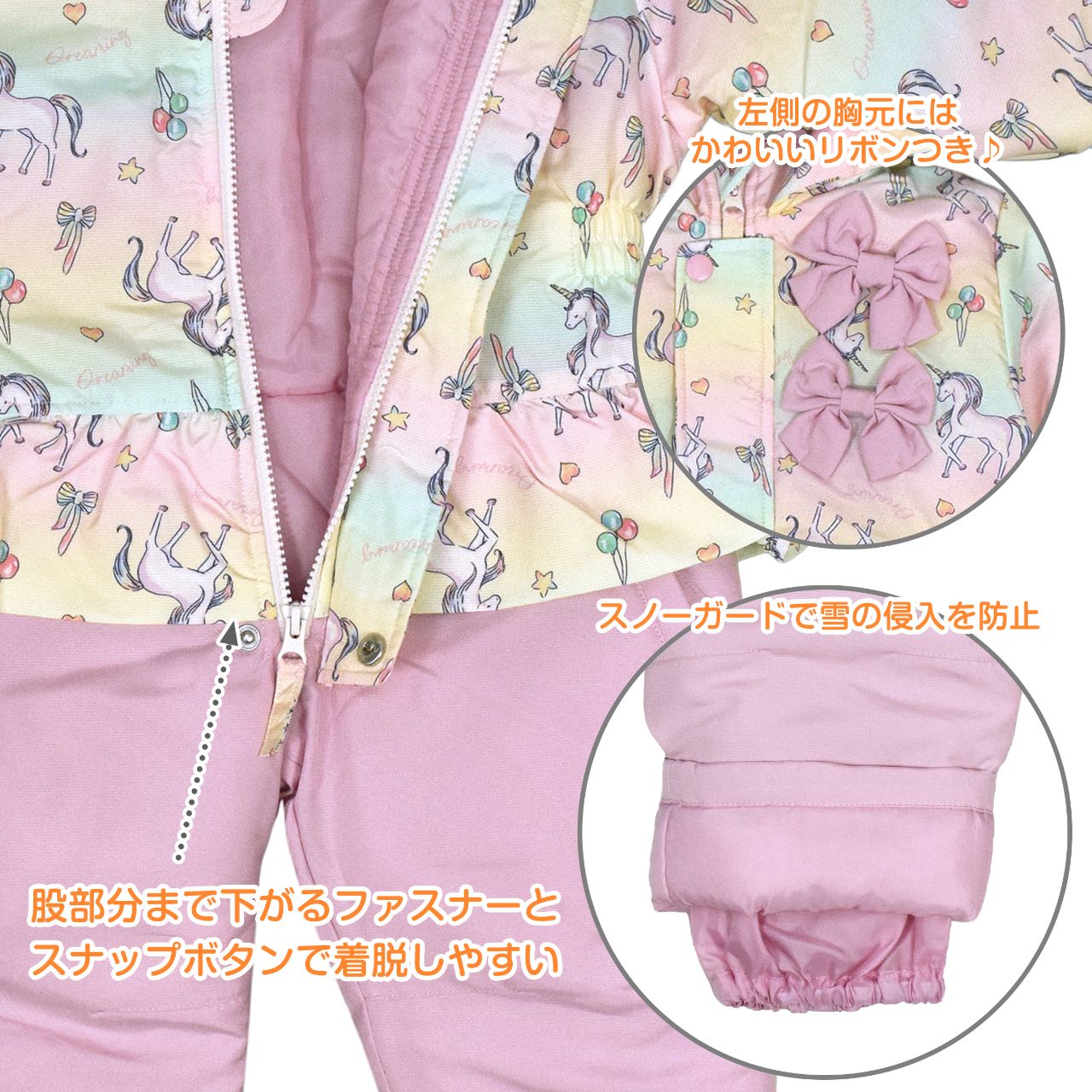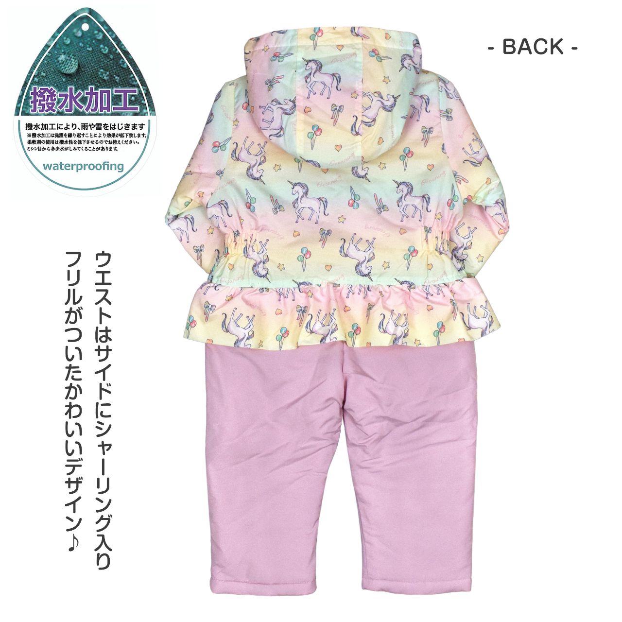 ☆ 商 品 説 明 ☆ corekite コレキテ はっ水加工 中綿入り ジャンプスーツ 。 ユニコーン プリントの スノーウェア です。ウエストはサイドに シャーリング入り ペプラム風のフリルがかわいいデザインです。裏地は着脱のしやすいポリエステル地。ファスナーガード あり。フード 取り外し不可。手首ゴム入り。前立てのファスナーは股部分まで。スノーガード あり。 ※ 柄の出方は個々の商品によってそれぞれ異なります。
