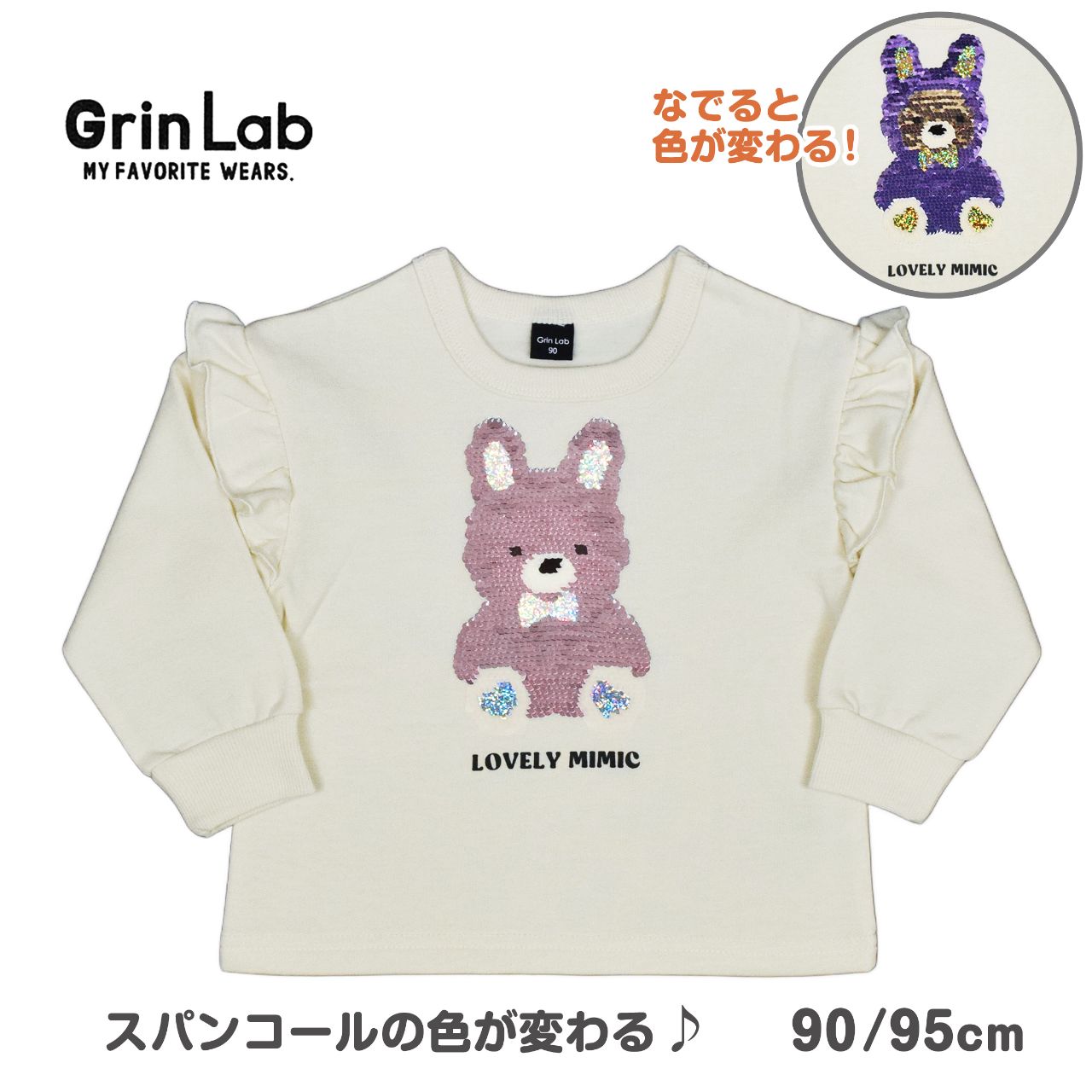 ☆ 商 品 説 明 ☆ GrinLab グリンラボ 変わる回転スパンコール うさぎ柄 裏起毛 長袖トレーナー 。 スパンコールのうさぎは裏と表で柄が変わる 楽しいトレーナーです。表面はピンクのウサギ、スパンコールをなでてひっくり返すと 紫の着ぐるみを着たうさぎに大変身。1枚で2つの柄が楽しめるかわいい スウェットシャツ です。 肩に フリル をあしらったお子様を可愛らしく見せてくれるデザイン。裏起毛で暖かなので通園などにもおすすめです。襟と袖口はリブ使い。 ※スパンコールのお取り扱いにご注意ください。