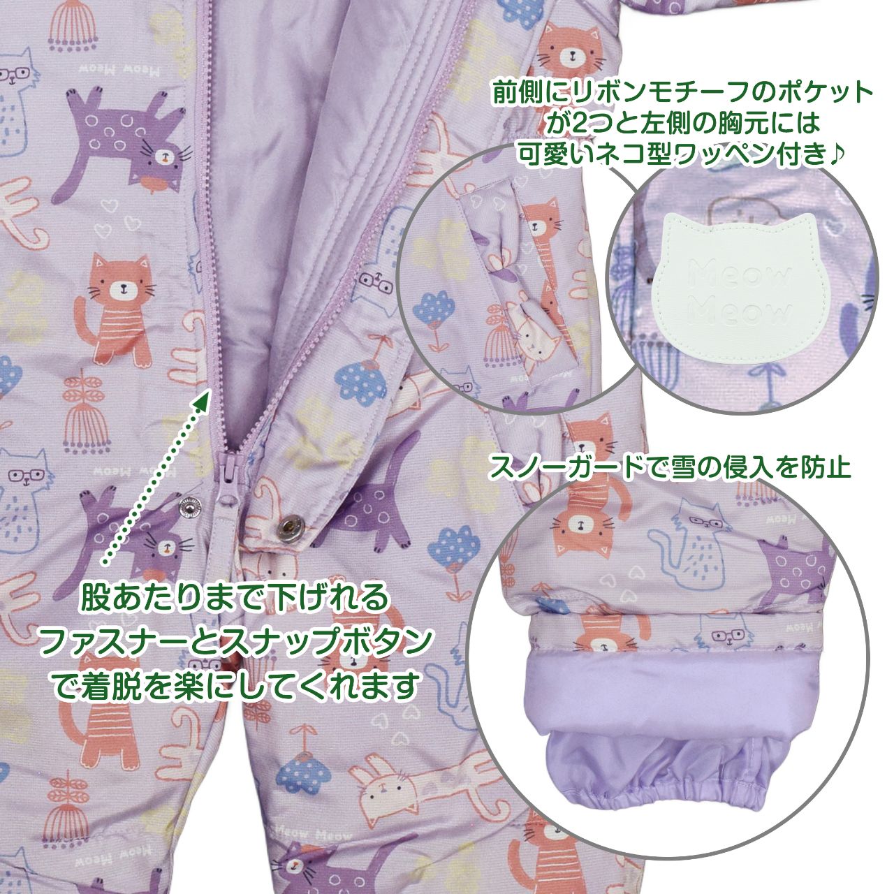 かわいい ネコの総柄プリント スノーウェア です。裏地は着脱がしやすいポリエステル地。ウエストはサイドにゴムシャーリング入りでフィット感もアップ。フード取り外し不可。ファスナーガード あり。手首はゴム入り。スノーガード あり。前立てのファスナーは股あたりまであるので着脱もらくらく。リボンモチーフ付きのポケットが前に2つ。胸元には可愛いネコ型ロゴ入りのワッペン付き。
