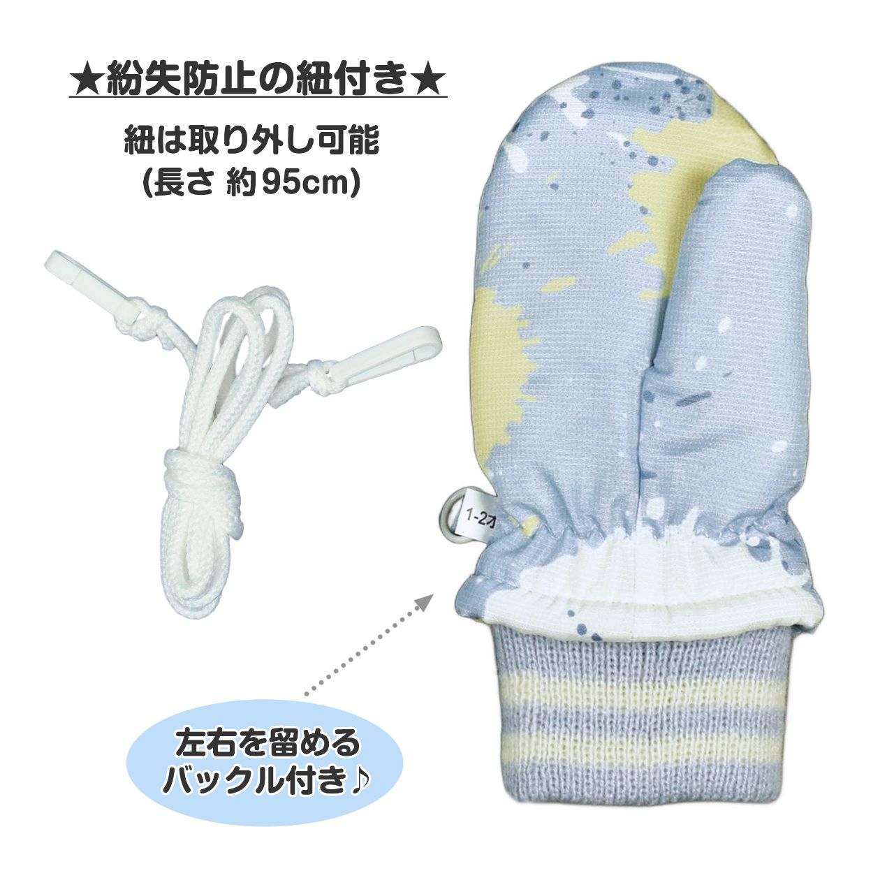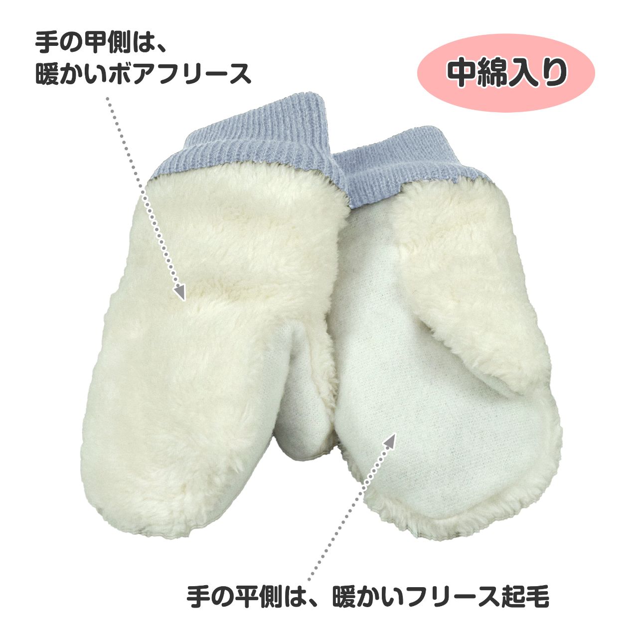 カフスはリブ・内側はフリースと裏ボアで あったか です。紐付きだから紛失防止で安心。