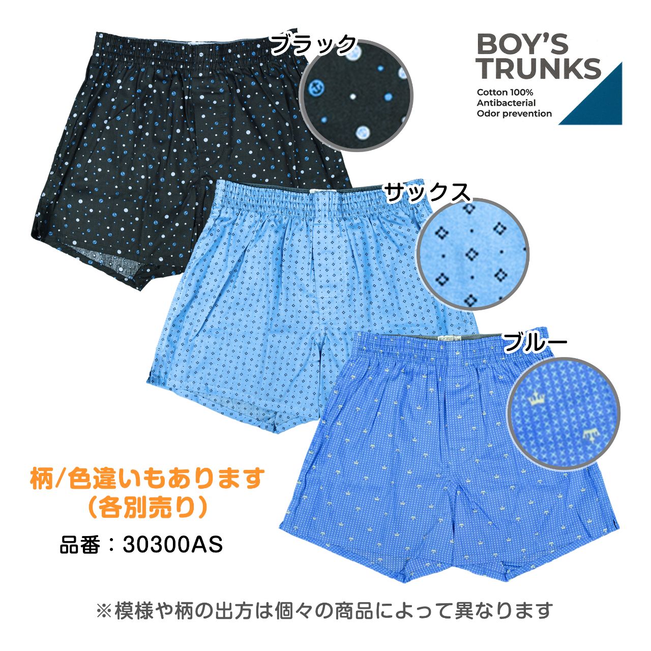 トランクス キッズ ジュニア 男の子 抗菌 防臭 前開き 前ボタン 綿100% ○ 商品型番:30300AS
