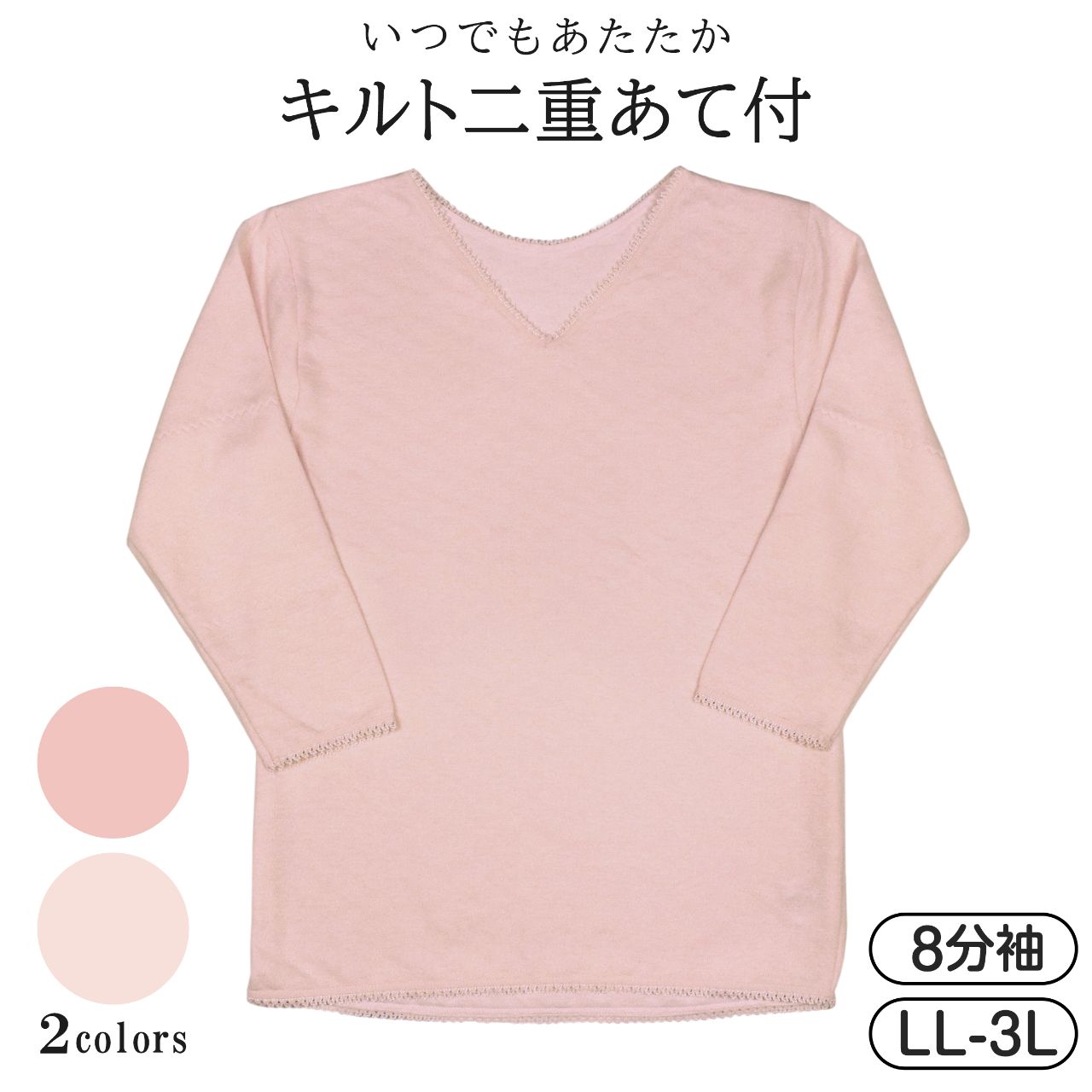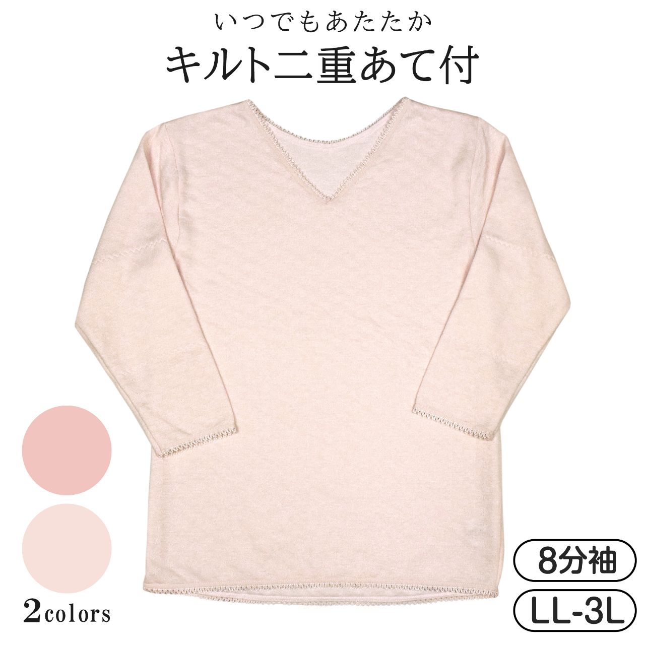 ☆ 商 品 説 明 ☆ 大きいサイズ レディース 綿混 キルト 二重あて付き 8分袖スリーマー 。 綿混素材 キルト8分袖シャツです。キルトのふんわりした肌触りが気持ちよく 背中全体とヒジ部分が二重になっているので 保温効果 があり寒い季節にはピッタリな肌着です。襟まわりは Vネック でトップスにも響きにくいデザイン。襟まわりと袖口には レース を使い女性らしく仕上げました。