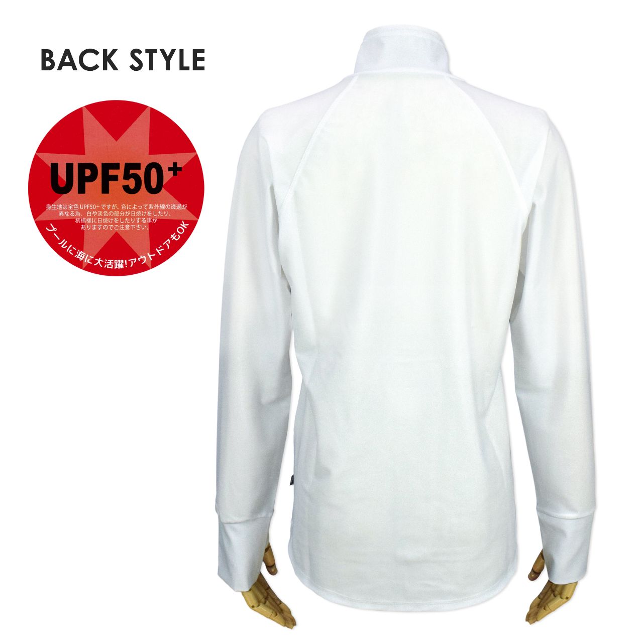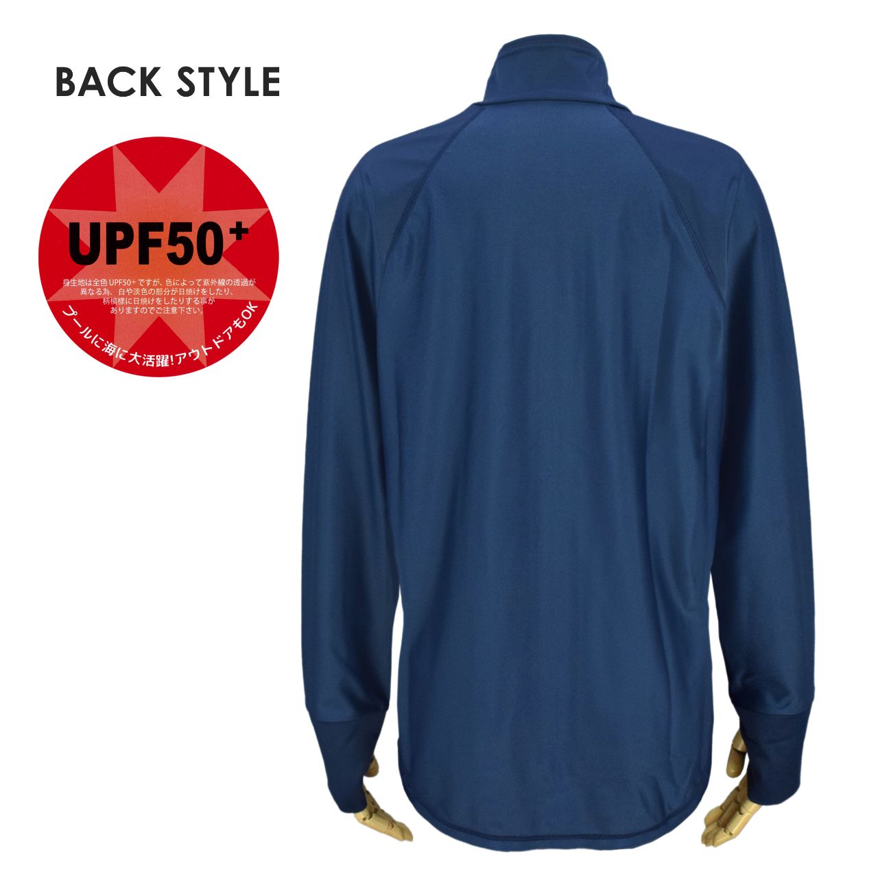UPF50+ UVカット加工付き。水陸両用なので水辺にかぎらず いろいろなシーンで活躍してくれる フルジップ ラッシュガード。後ろ裾は ラウンドカット に ヒップが隠れるくらいの 程よい丈感 。襟はスタンドカラーで首回りの日焼けもガード。袖口は 指穴 が付いているので日焼けしたくない手の甲も 紫外線 から守ってくれます。