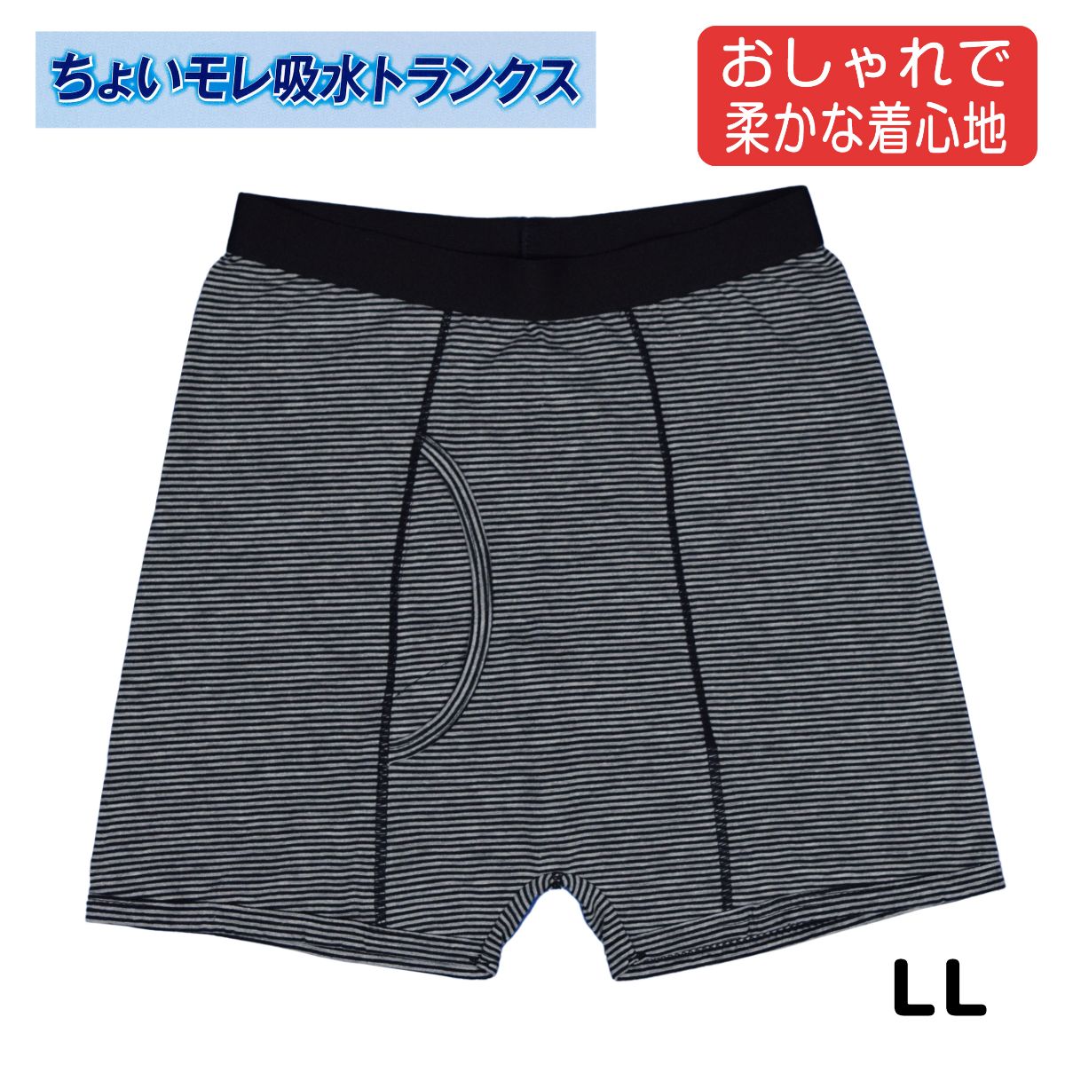 ☆ 商 品 説 明 ☆ 日本製 紳士 綿混 大きいサイズ 軽失禁用ちょいモレ 吸水トランクス 。 前部分はキルト加工で 漏れない ムレない 消臭抗菌 の吸水パッド付きで、外出時も安心の軽失禁用トランクス です。フィット生地を使用した オシャレな ボーダー 柄。周りにも見えずらいデザインです。 こんな方におススメです。ちょい漏れが気になる、尿のキレが悪い、我慢出来ずに漏れてしまう、くしゃみで漏れてしまう、立ち上がる時漏れてしまう、ズボンによくシミが付く。