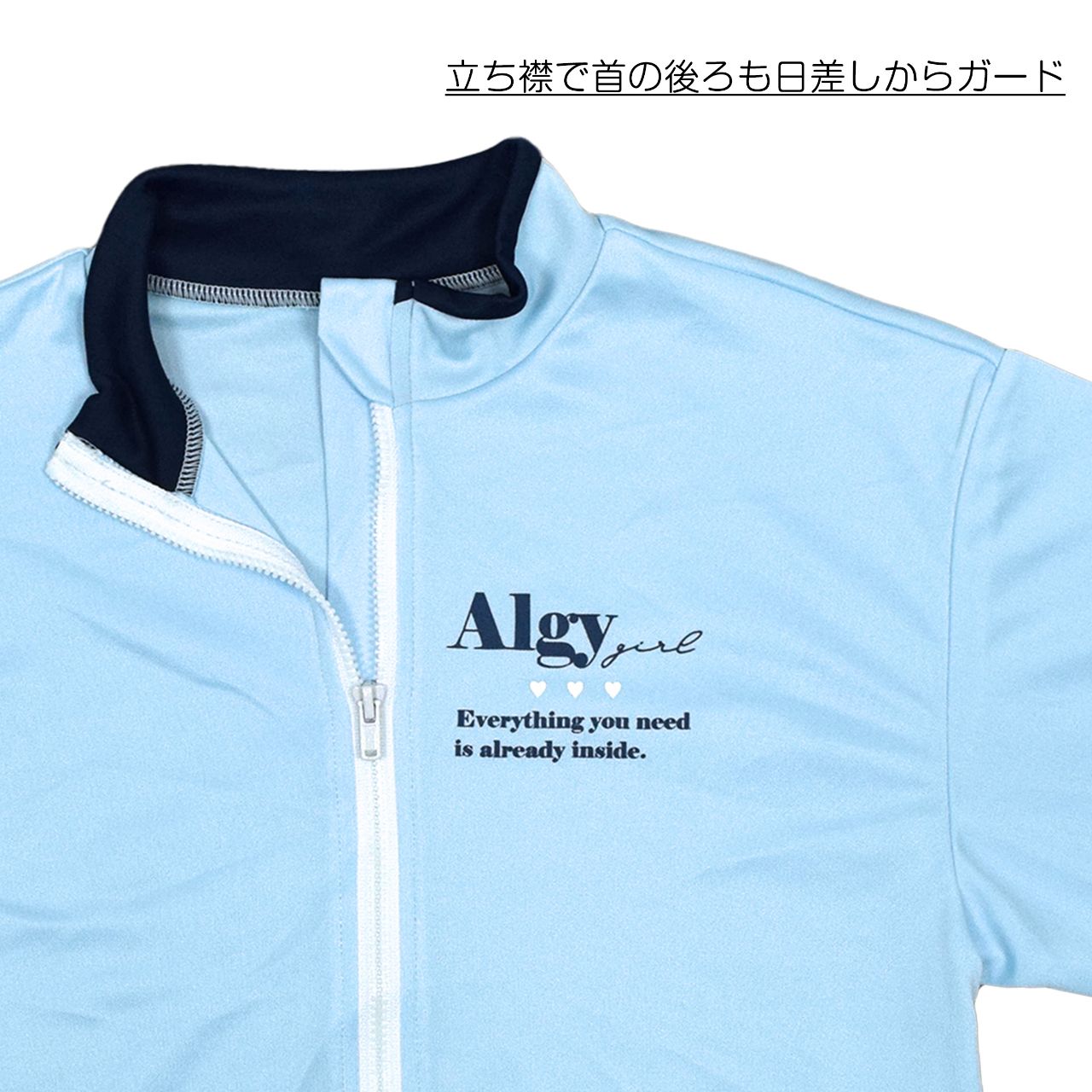 ☆ 商 品 説 明 ☆ ALGY アルジー スタンドカラー 吸水速乾 UVケア 長袖ラッシュガード 。 ALGYのロゴプリント入り 長袖 ラッシュガード です。袖口は親指を通す穴があるので手の甲の 日焼け防止 になります。立ち襟で首の後ろも日差しからガード。紫外線遮蔽加工はしていませんが、紫外線遮蔽率は90%以上の試験数値が得られています。ファスナーガードなし。両サイドポケット付き。