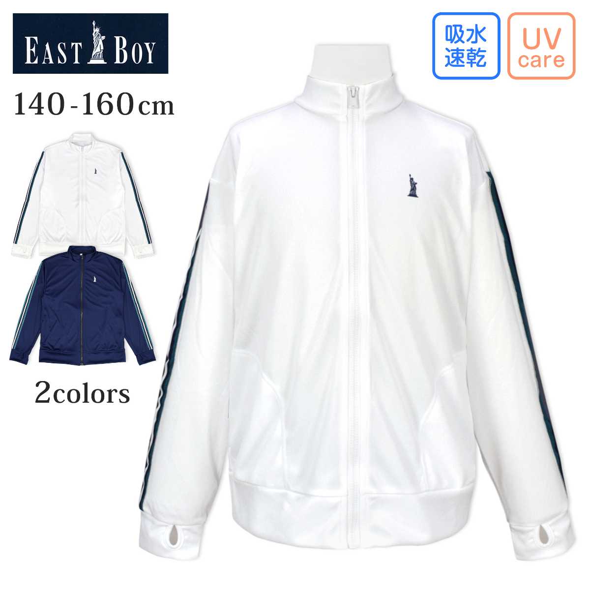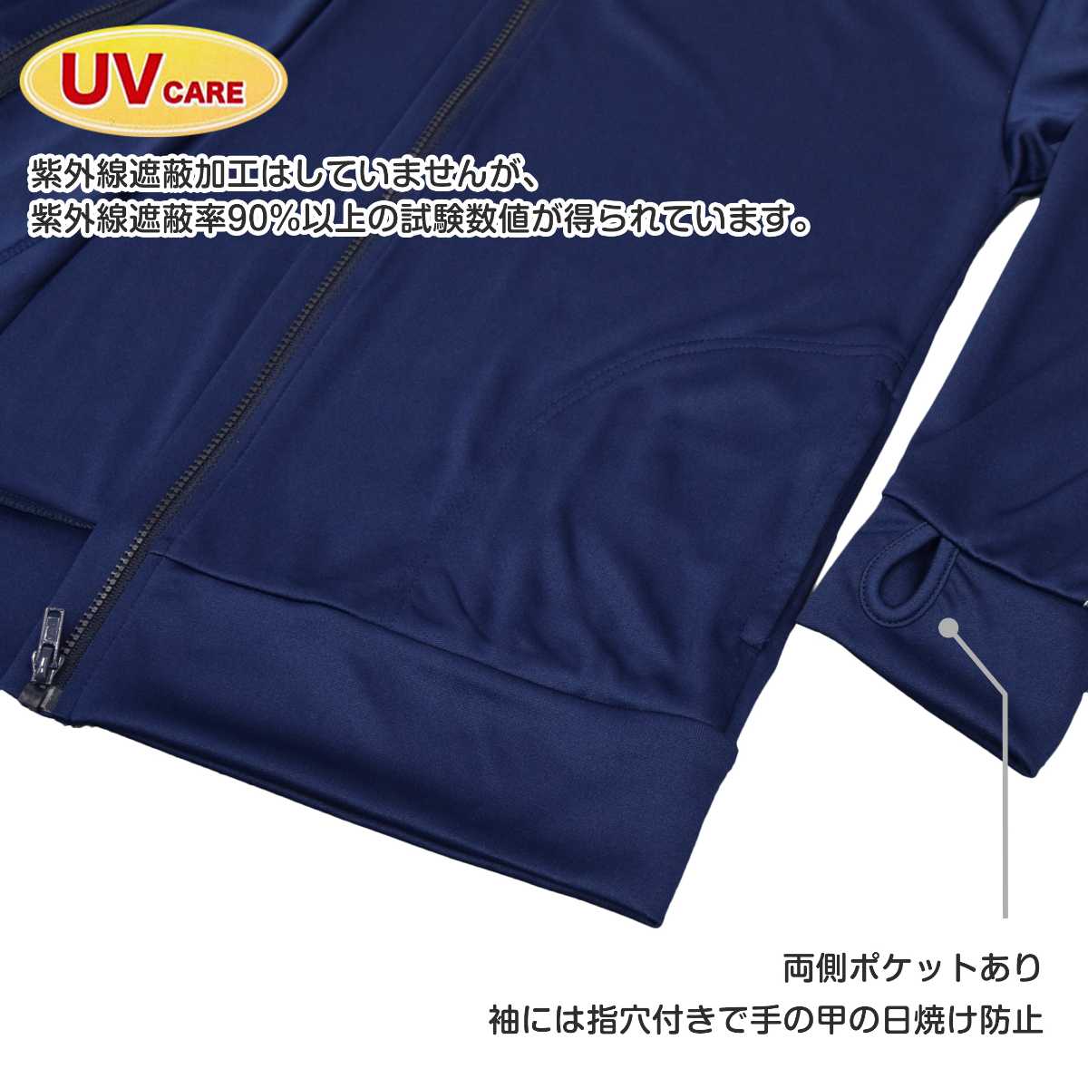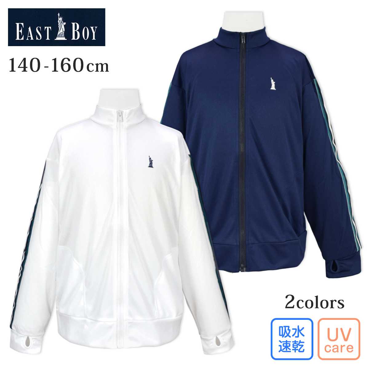 ☆ 商 品 説 明 ☆ EAST BOY イーストボーイ 吸水速乾 UVケア フルジップ 長袖ラッシュガード 。 袖のラインテープや胸元のロゴが大人っぽく おしゃれ ラッシュガード です。前開き なので、サッと羽織れて着脱もらくらく。袖口は 親指を通す穴 があるので 手の甲の 日焼け防止 になります。紫外線遮蔽加工はしていませんが、紫外線遮蔽率は90%以上の試験数値が得られています。吸水速乾で着心地も良いです。ポケット2つ。