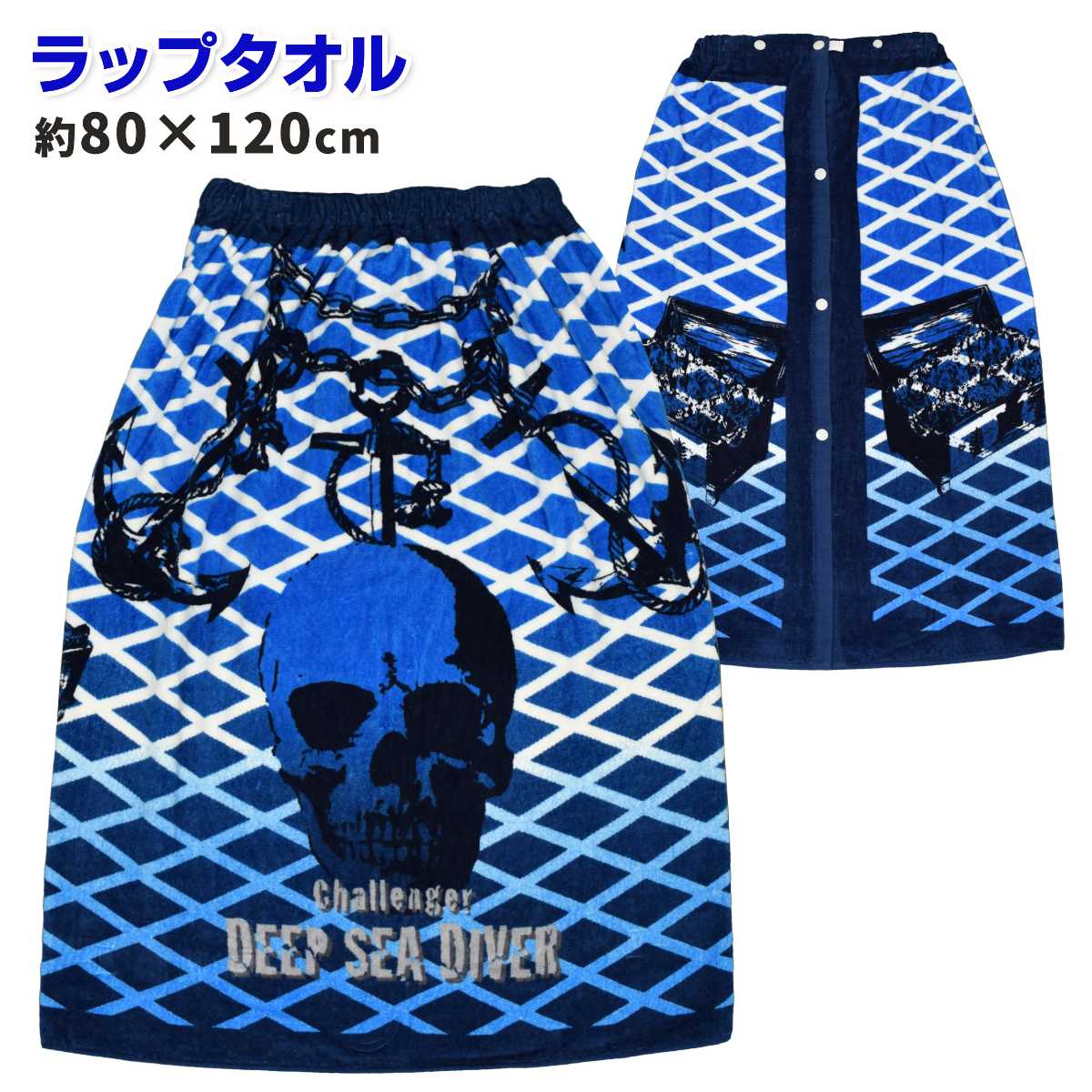 ☆ 商 品 説 明 ☆ キッズ 男の子 スナップボタン付き ドクロ 巻きタオル 。 大きくプリントされたドクロや宝箱がカッコいいラップタオルです。 上部はゴム入りで2段階調節できるボタンと外しやすいつまみ付き。 お肌に優しい綿100%。冷え対策や日焼け防止、プールや海水浴などの必需品。 吸水性もよく海やプール、お風呂上がり などにも大活躍します。 前立てはスナップボタン留め。内側にお名前タグ付き。