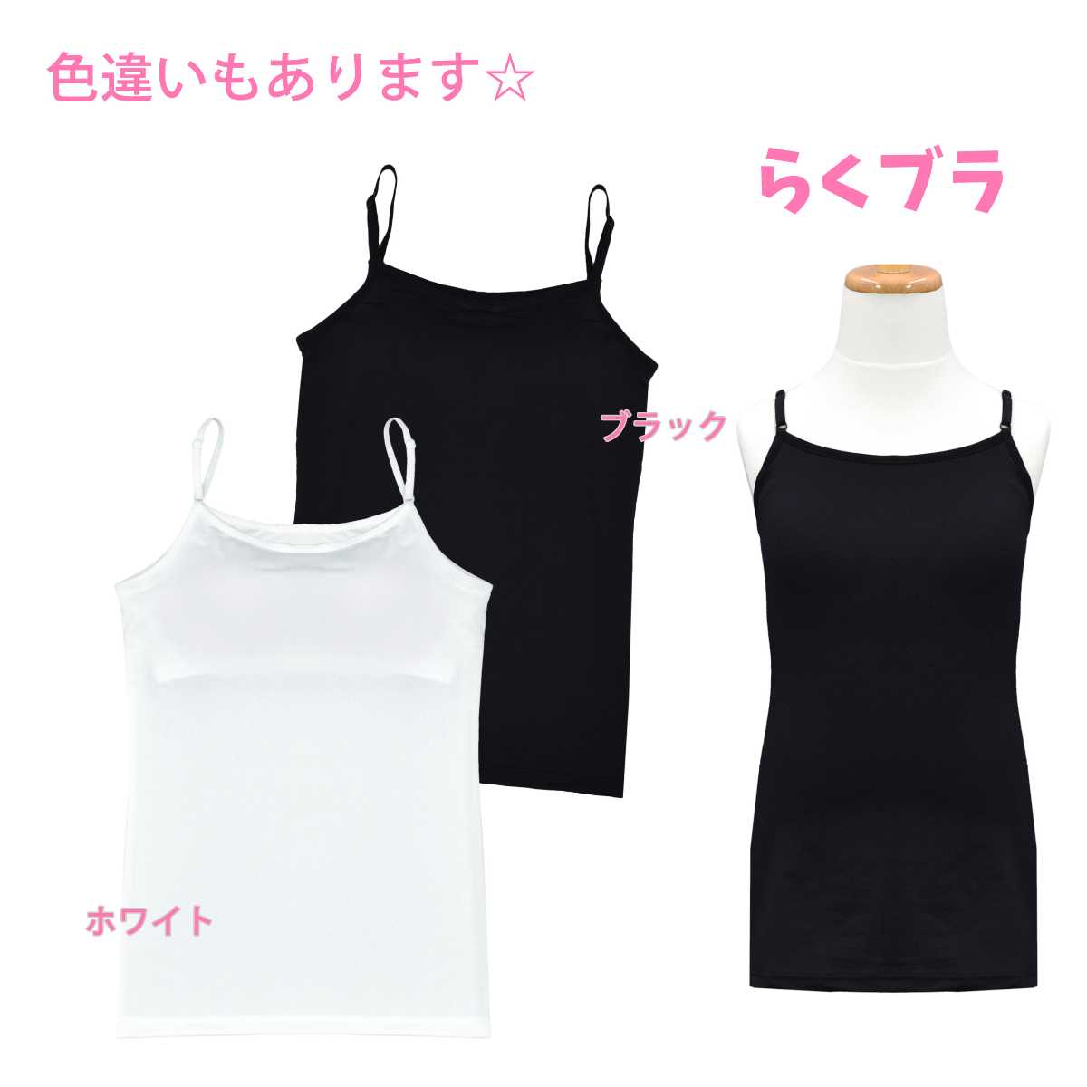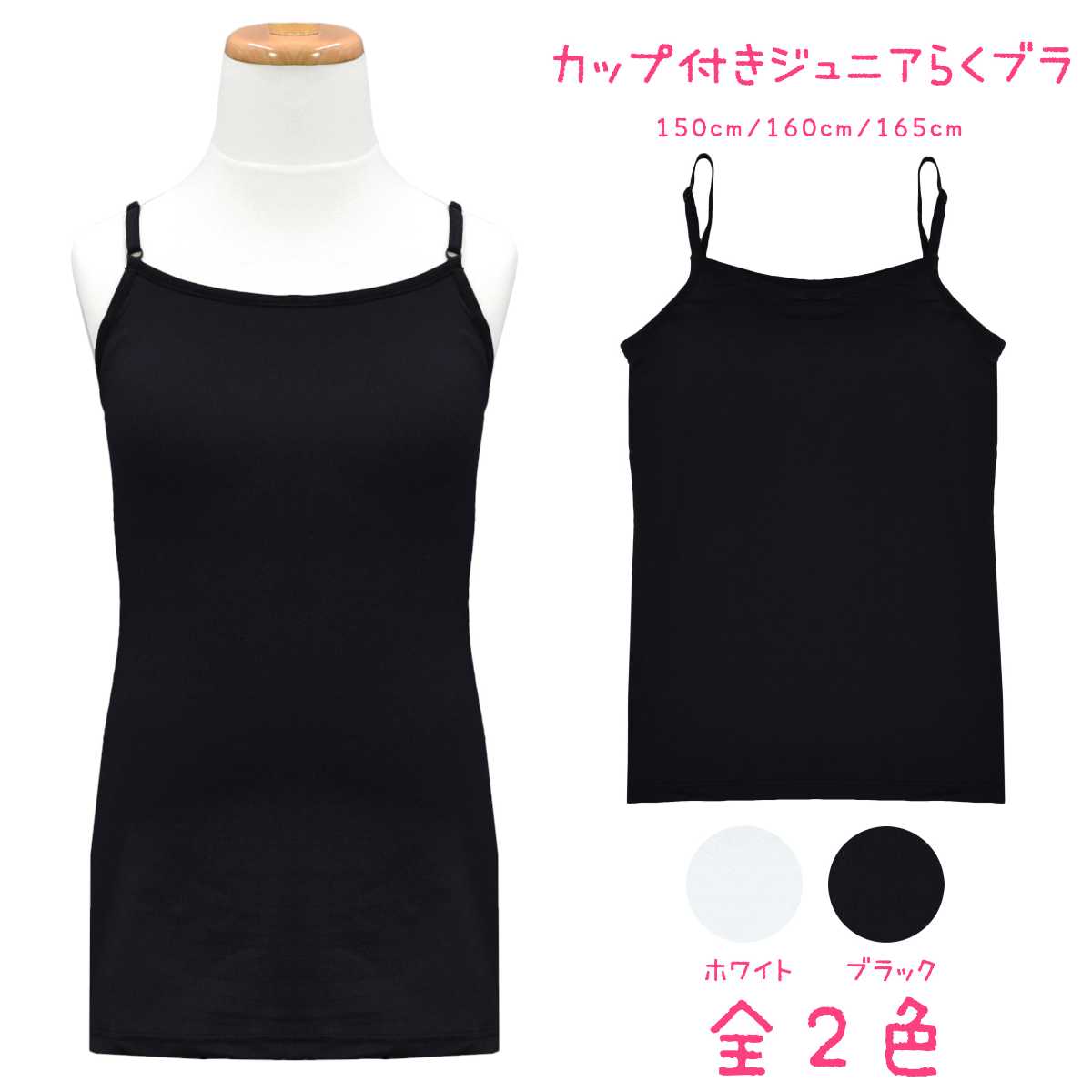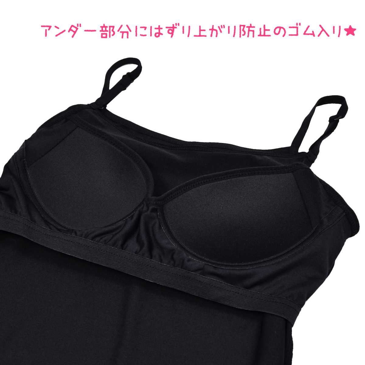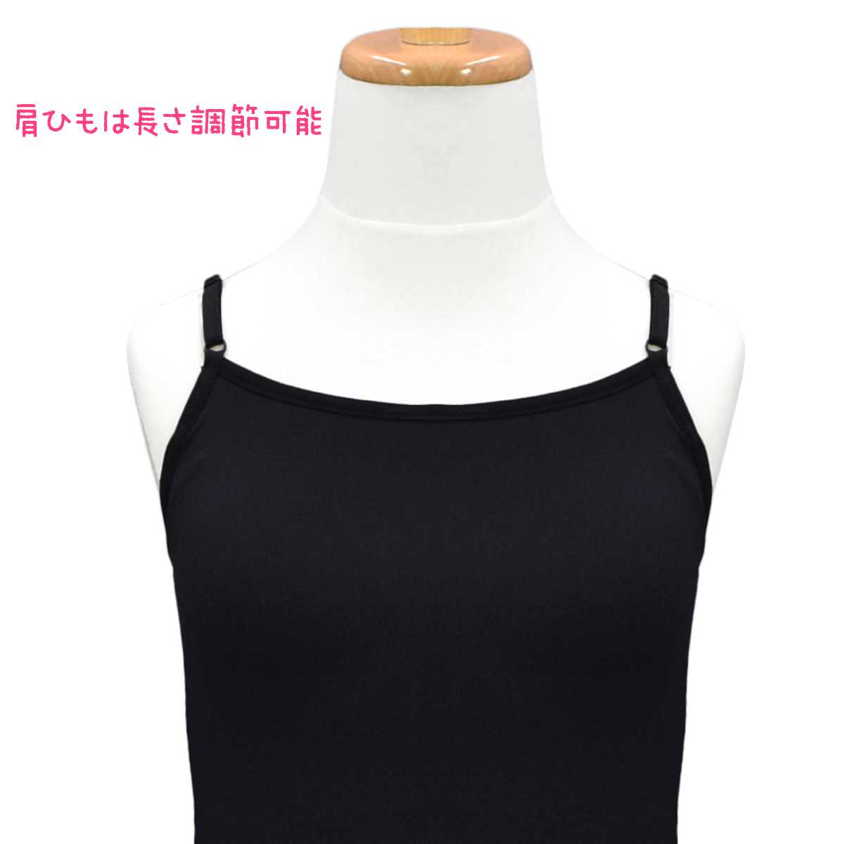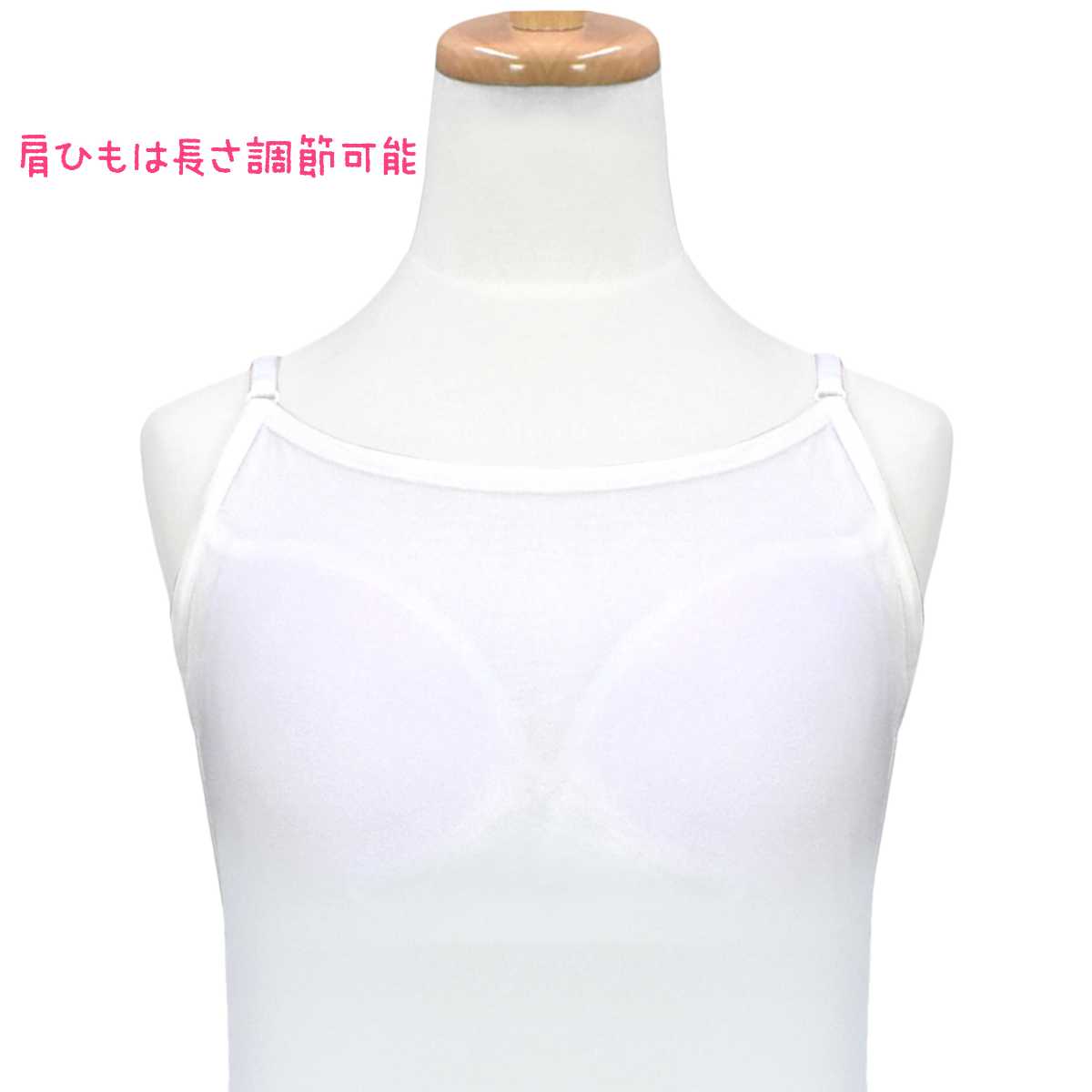 ブラカップ付きでブラの締め付けが苦手なお子様にオススメです。アンダー部分にはずり上がり防止のゴムが入っています。ストラップ調節可能。カップは取り外しできません。