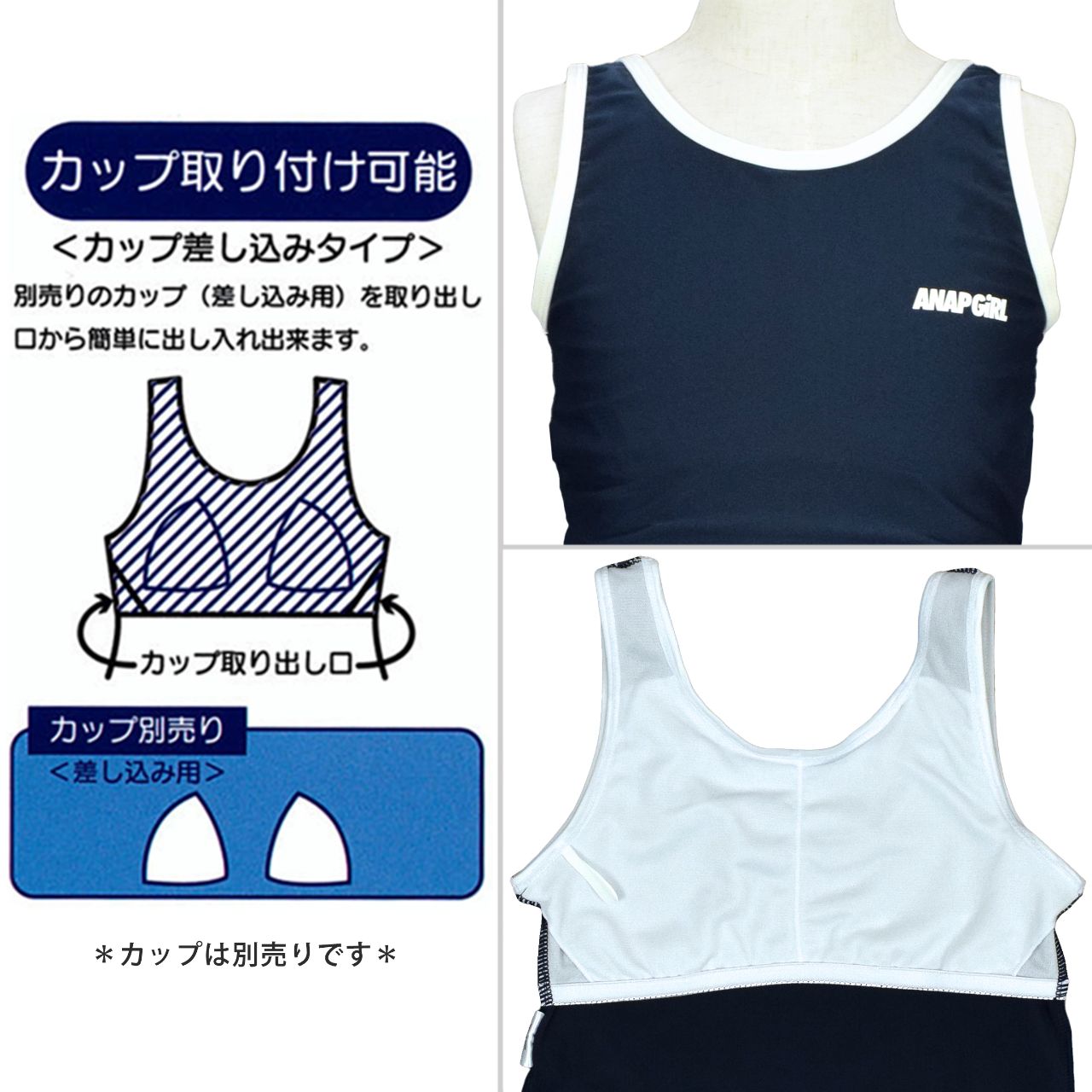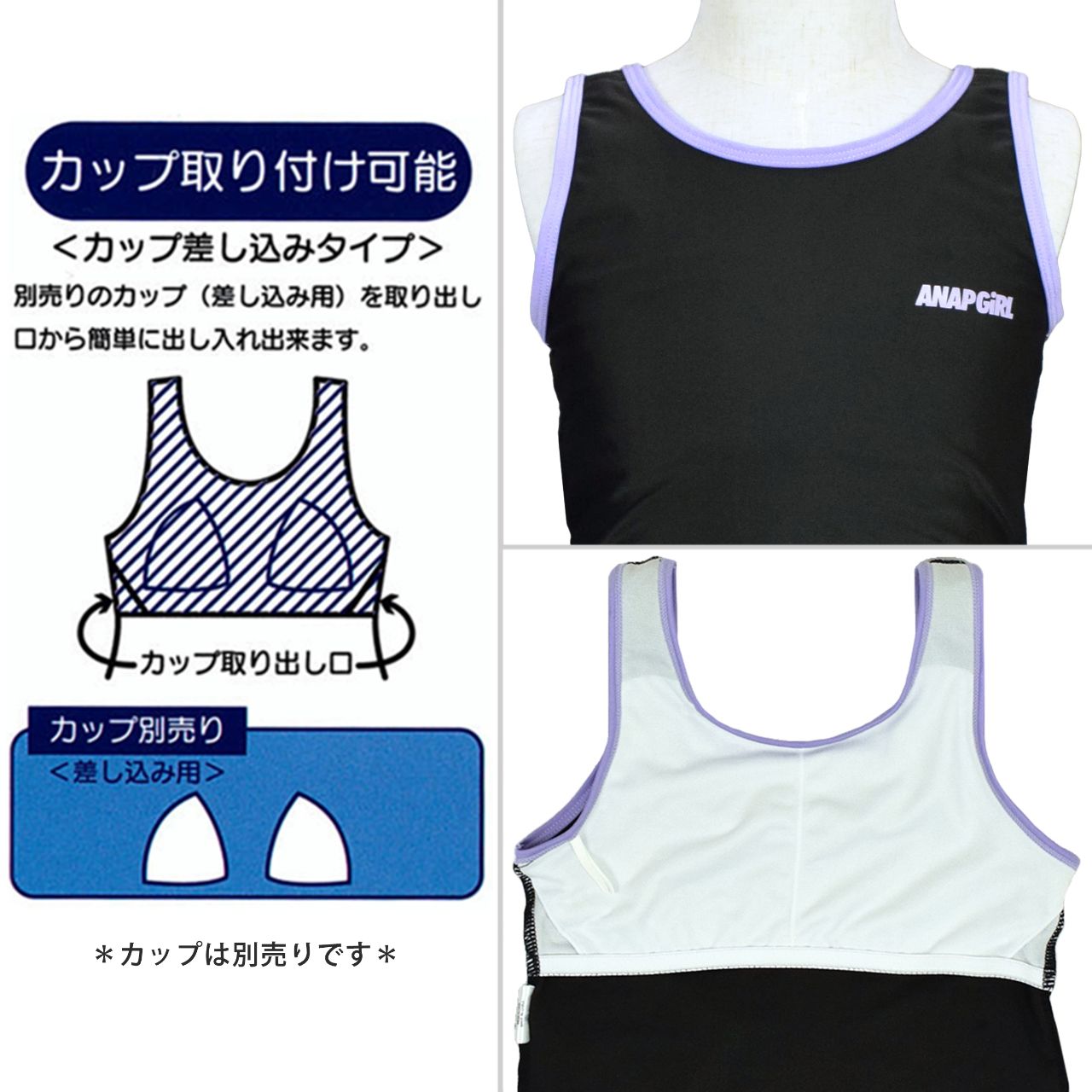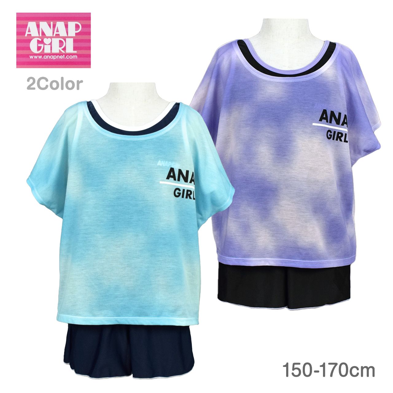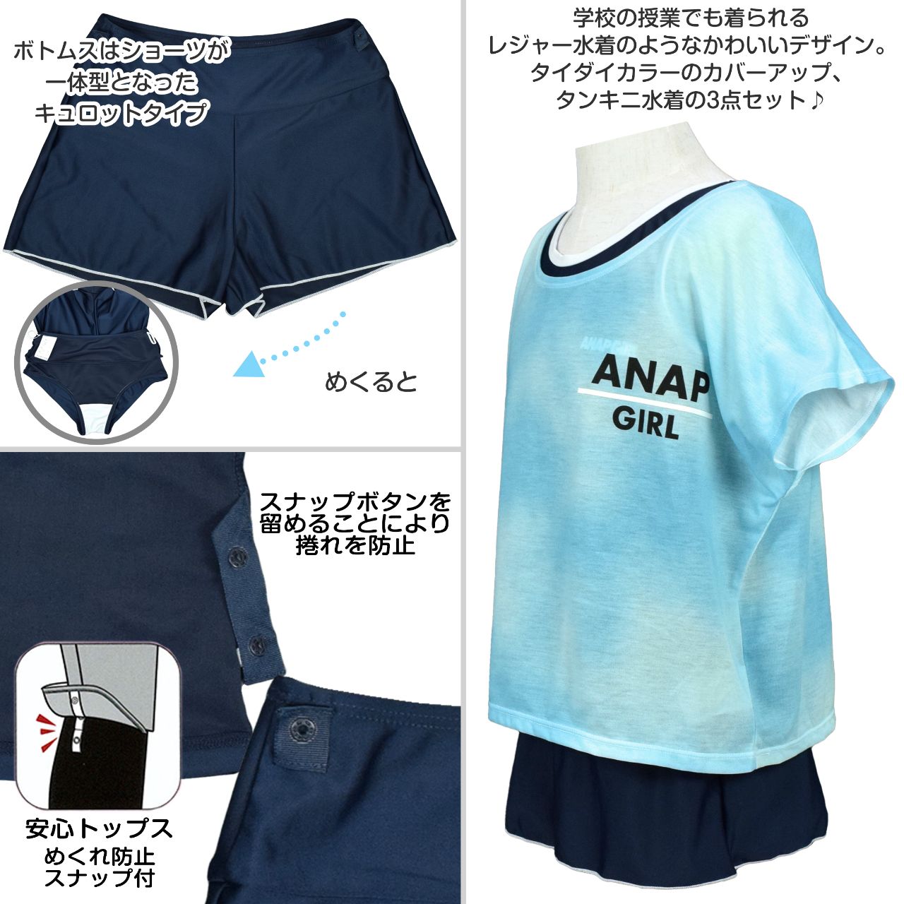 ☆ 商 品 説 明 ☆ ANAP GIRL アナップガール UPF50+ 紫外線カット オンスクール 水着 3点セット 。 学校の授業でも着られる レジャー水着のようなかわいいデザイン。タイダイカラーのカバーアップ、タンキニ水着の 3点セットです 。 水着本体は黒、紺ベースだから授業にも使え、露出控えめで体型もカバー。Tシャツ型のカバーアップ付きで プライベートでのシーンでも可愛く着られます。 水着はタンクトップ型のタンキニ、カラーパイピング。上下両サイドについているスナップボタンを留めることにより 捲れを防止し肌見えを防いでくれます。 胸元にはロゴプリント入り。肩ひも調節不可。ボトムはショーツ一体型の キュロットタイプ で気になるヒップラインもカバー。胸元裏地にカップ差し込み口あり(カップは別売りです)取外しも可能です。