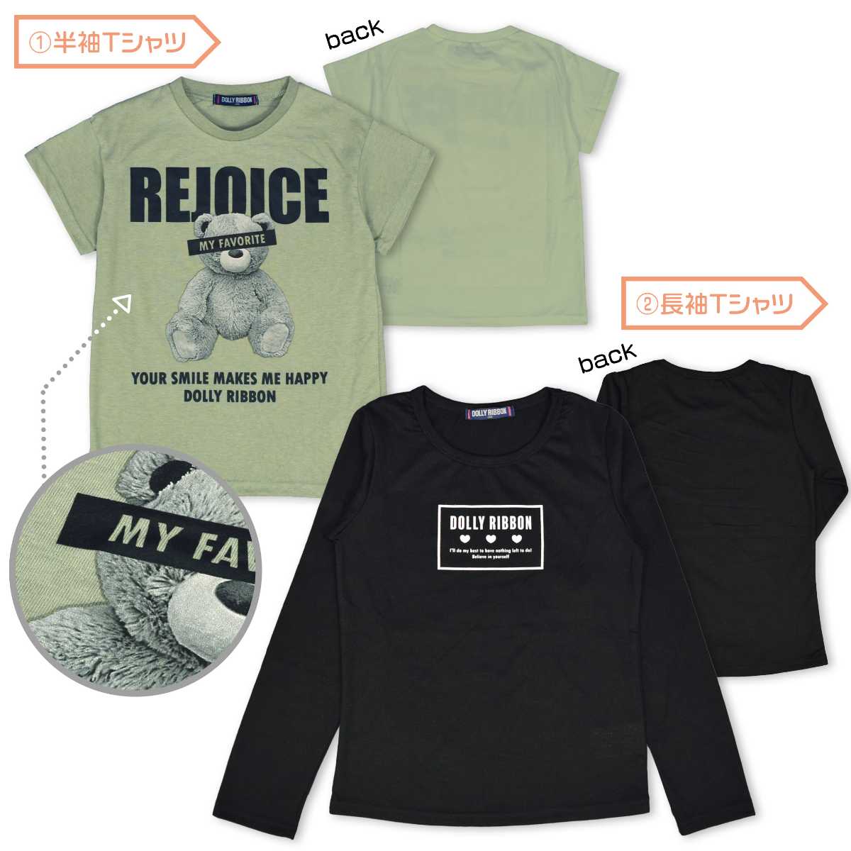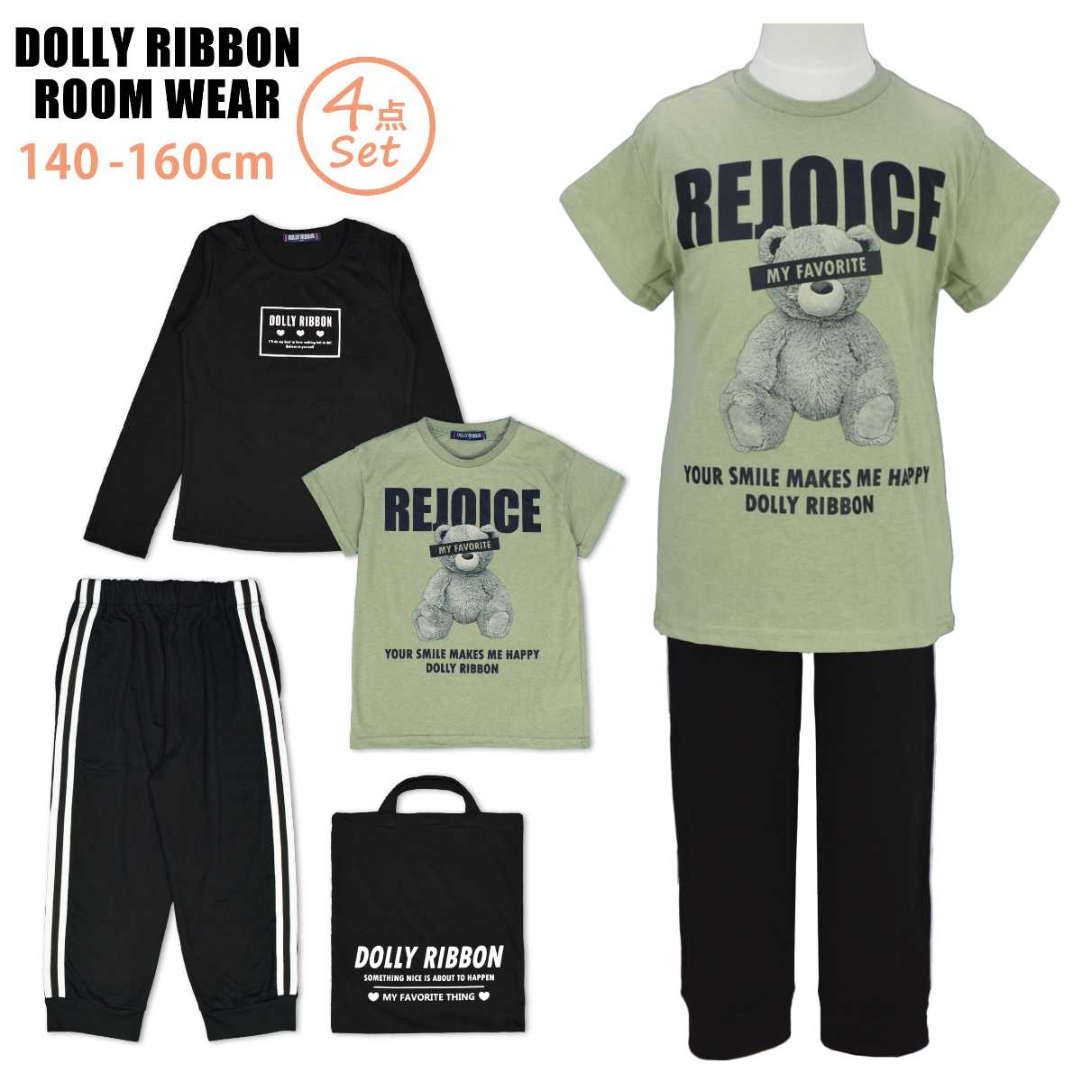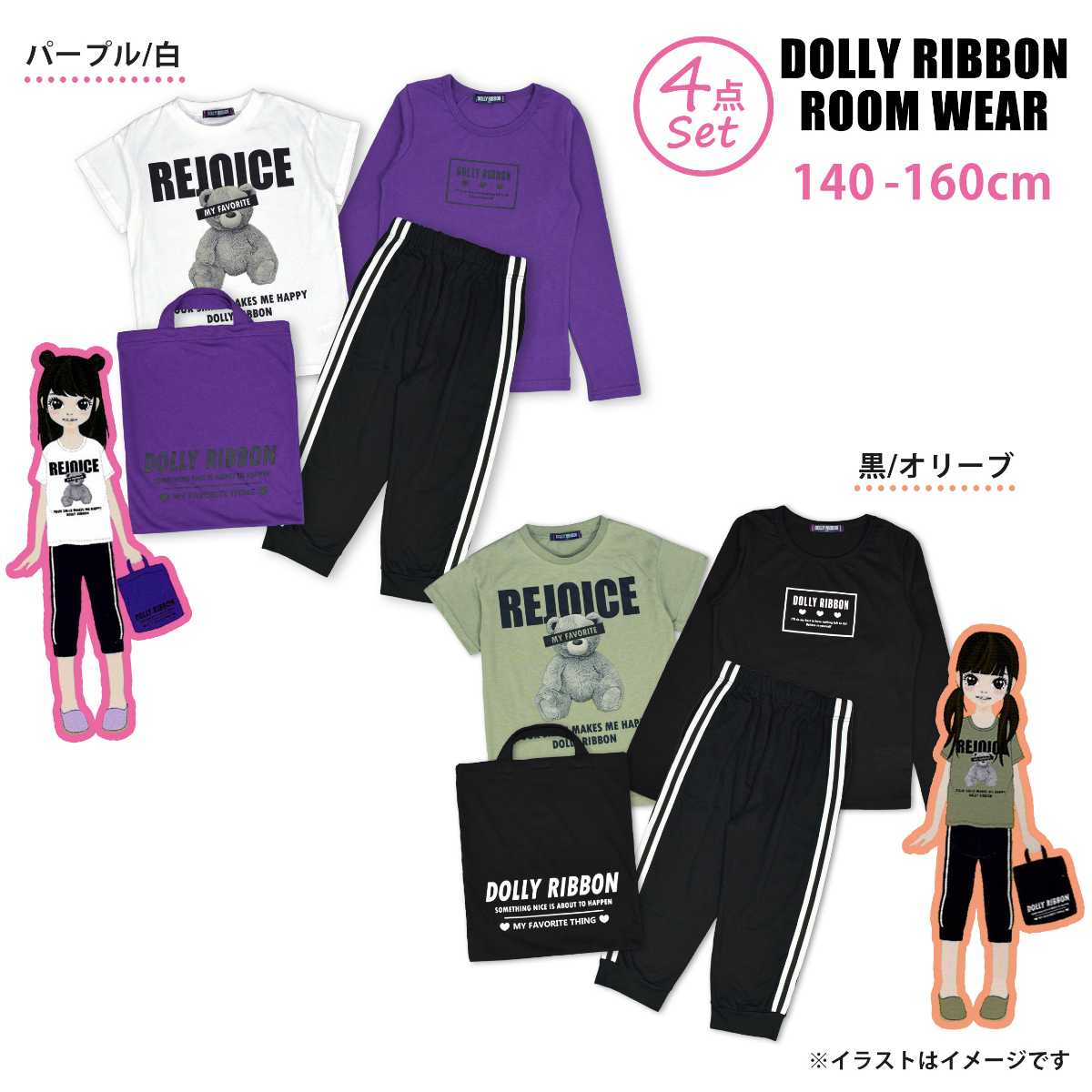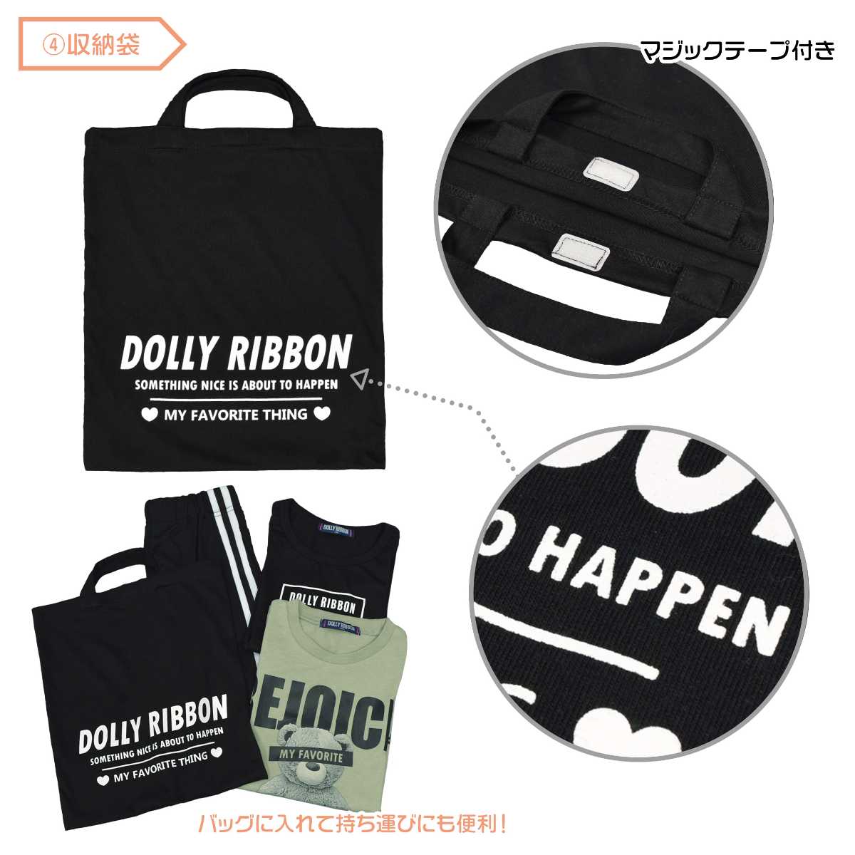 ☆ 商 品 説 明 ☆ DollyRibbon ドーリーリボン ルームウェア4点セットです。 長T、半T、裾リブタイプのパンツに収納袋がついた4点セット。 長袖Tシャツは、シンプルなロゴプリント入り。 少し細身なデザインです。 半袖Tシャツは、モノクロの転写プリント入り。 パンツはサイドライン 7分丈パンツ。 両サイドポケット付き。ウエストゴム、紐なし。 収納袋は縦約32cm、横約29cm