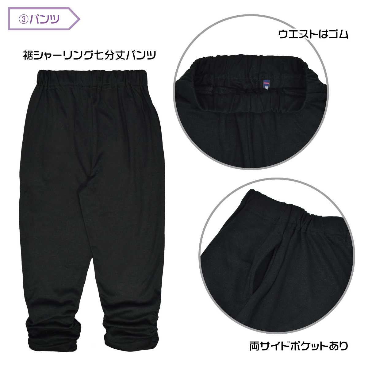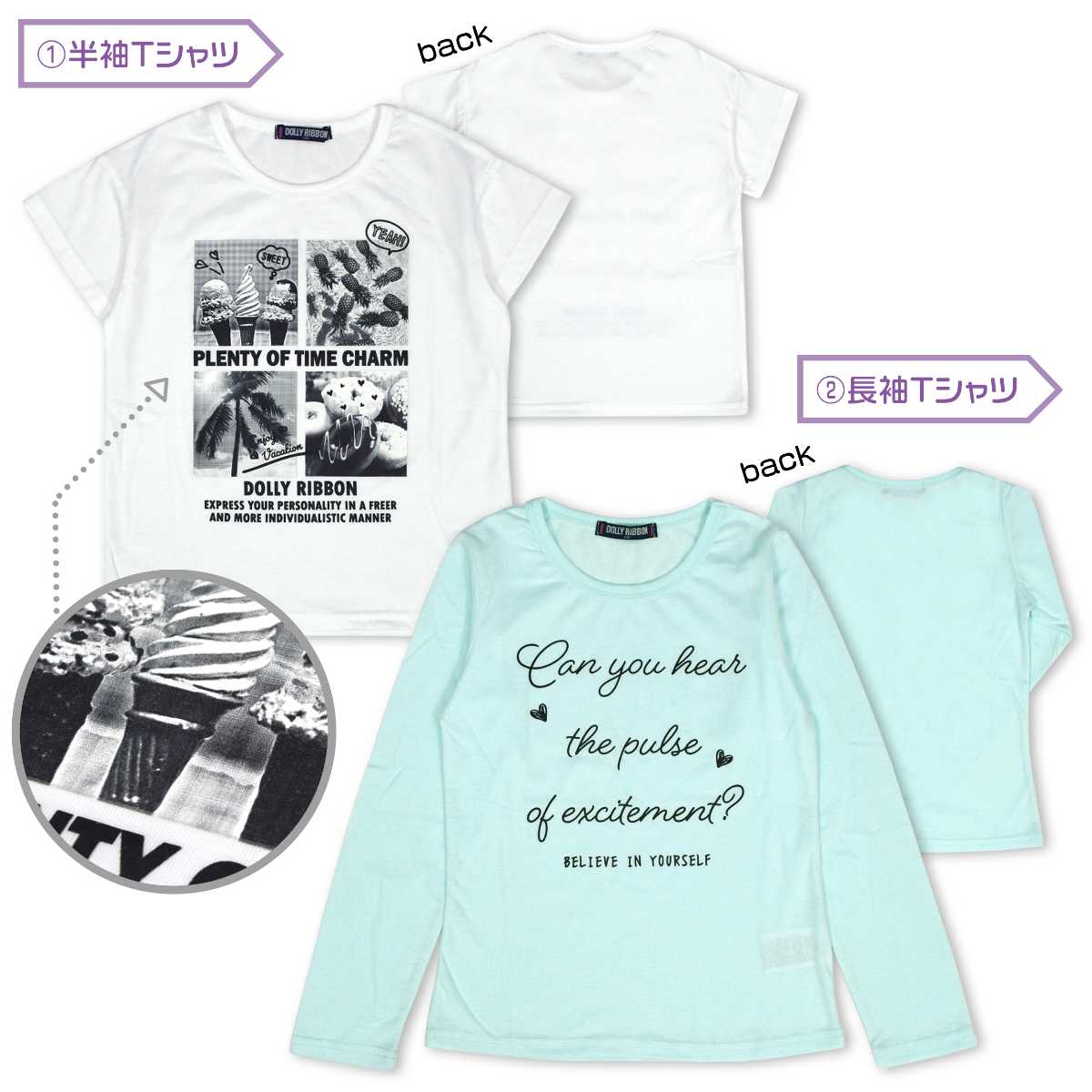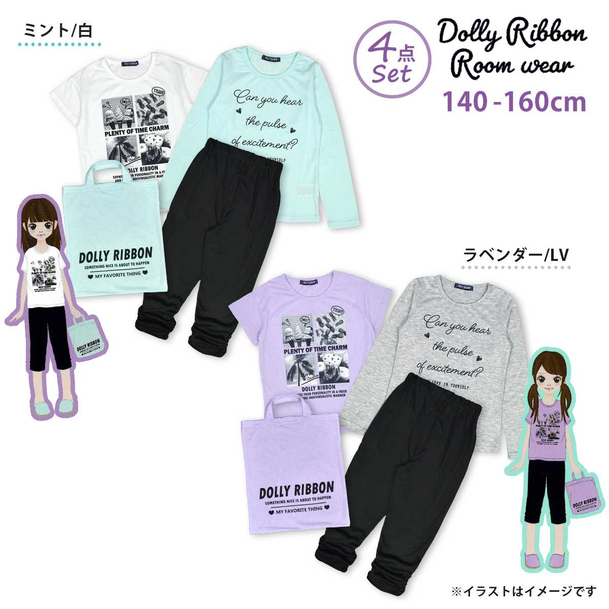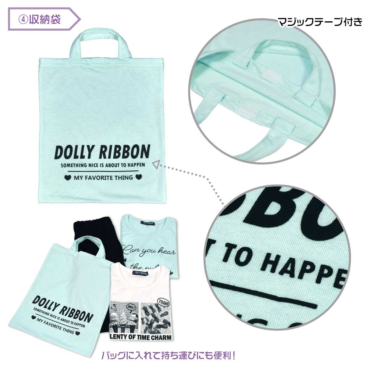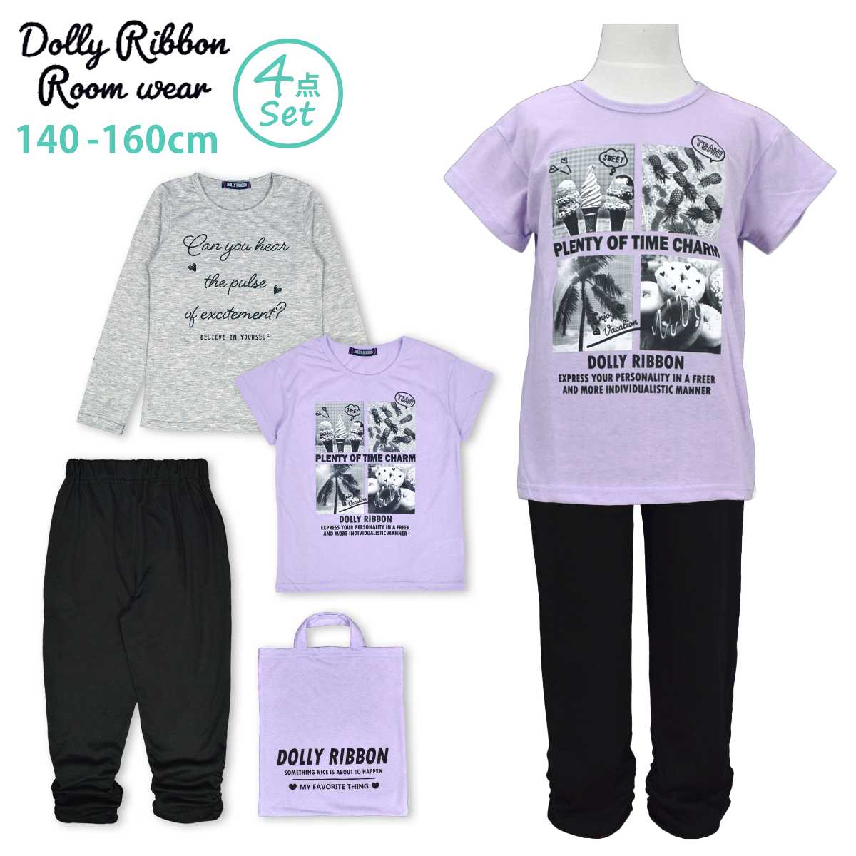 ☆ 商 品 説 明 ☆ DollyRibbon ドーリーリボンルームウェア4点セットです。 長T、半T、シャーリングパンツに収納袋がついた4点セット。 長袖Tシャツは、シンプルなロゴプリント入り。 少し細身なデザインです。 半袖Tシャツは、モノクロの転写プリント入り。 パンツは裾シャーリングの7分丈パンツ。 両サイドポケット付き。ウエストゴム、紐なし。 収納袋は縦約32cm、横約29cm