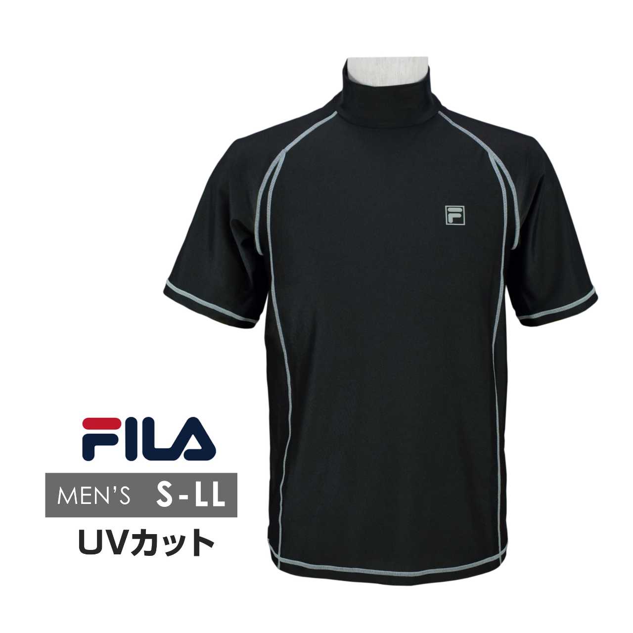 ☆ 商 品 説 明 ☆ FILA フィラ UVカット加工 メンズ 半袖ラッシュガード 。 UV遮蔽率90%以上で紫外線をカット。すぽっと被る プルオーバータイプ ゆったりシルエット。スタンドカラーで首回りの日焼けもガード。プールで着用しても変色しにくい。