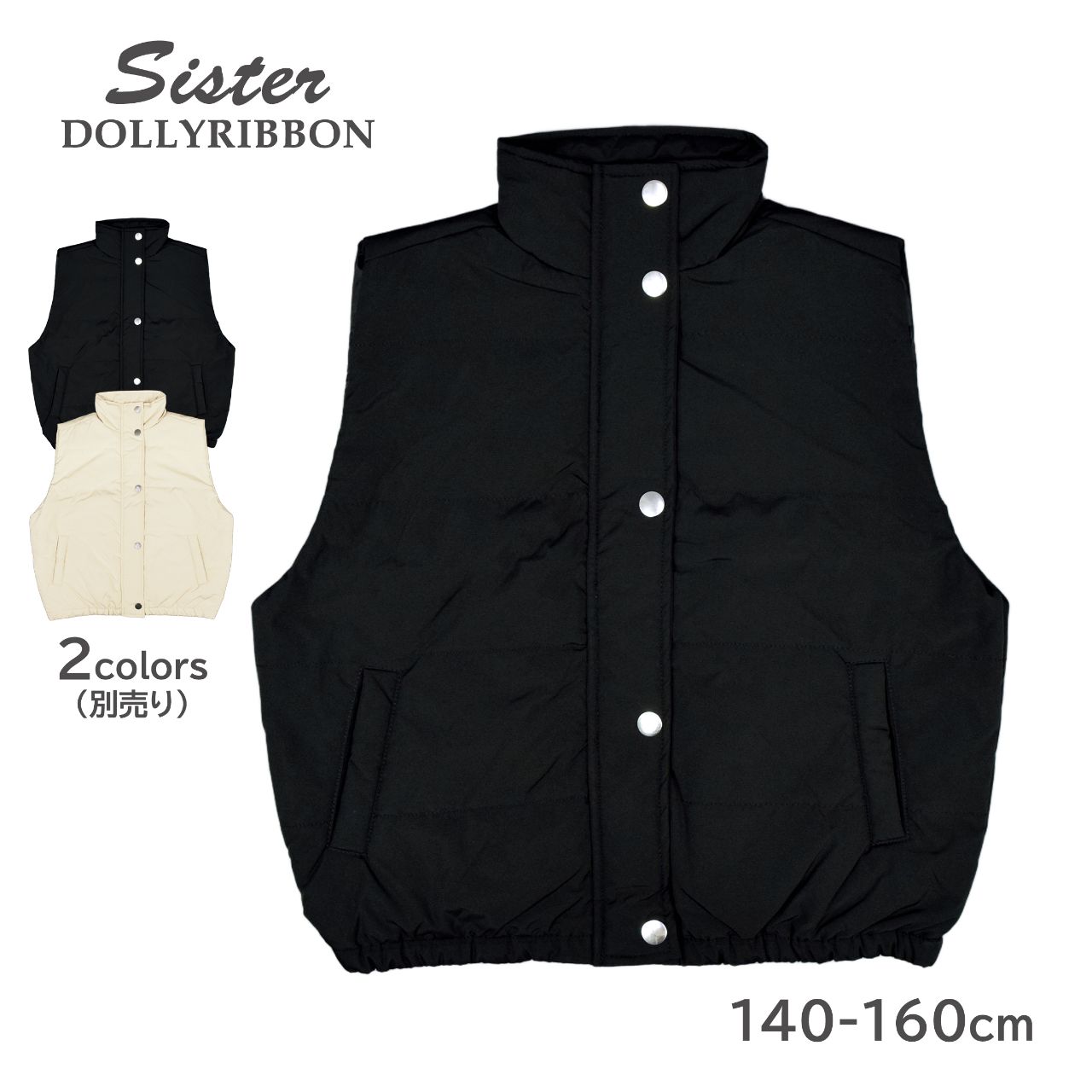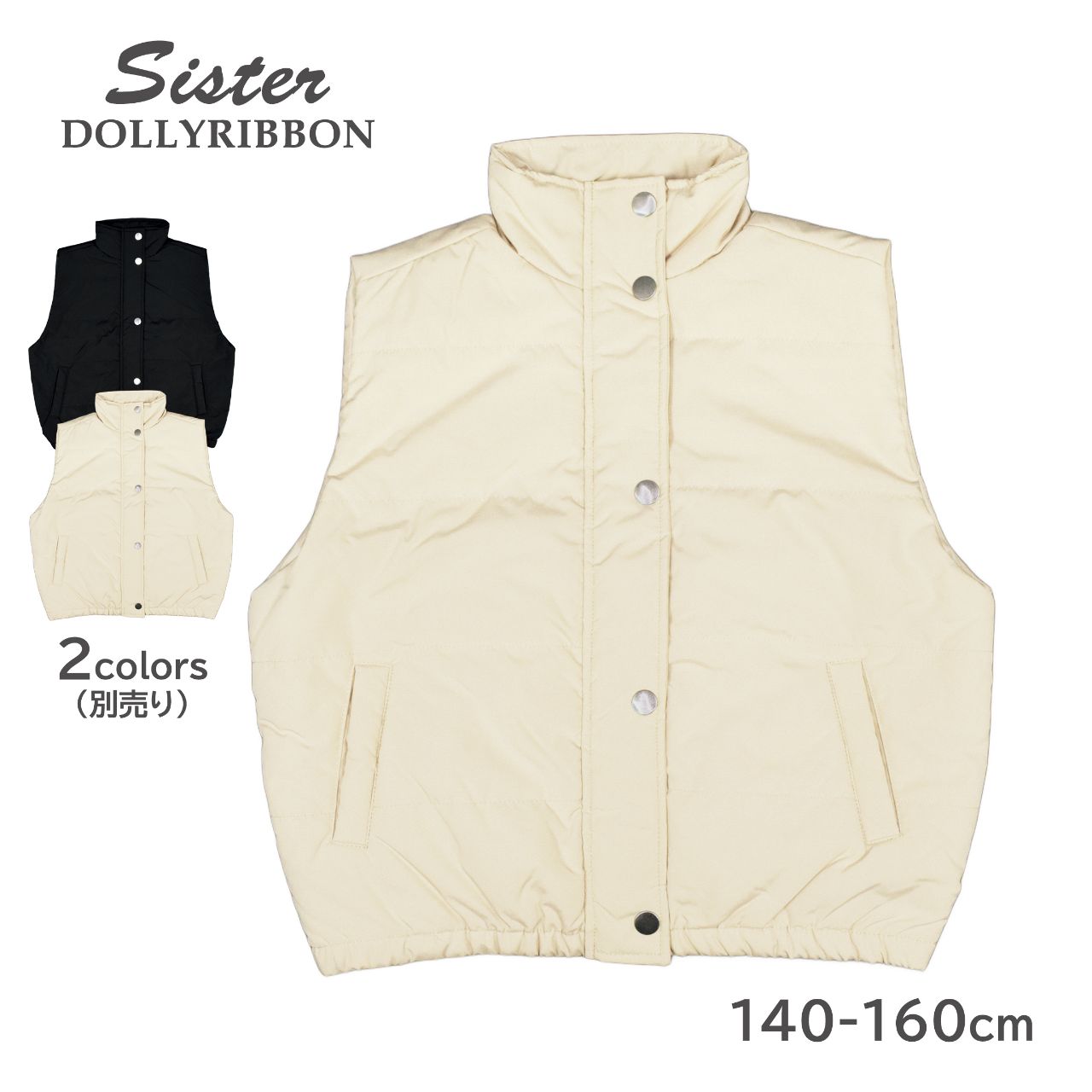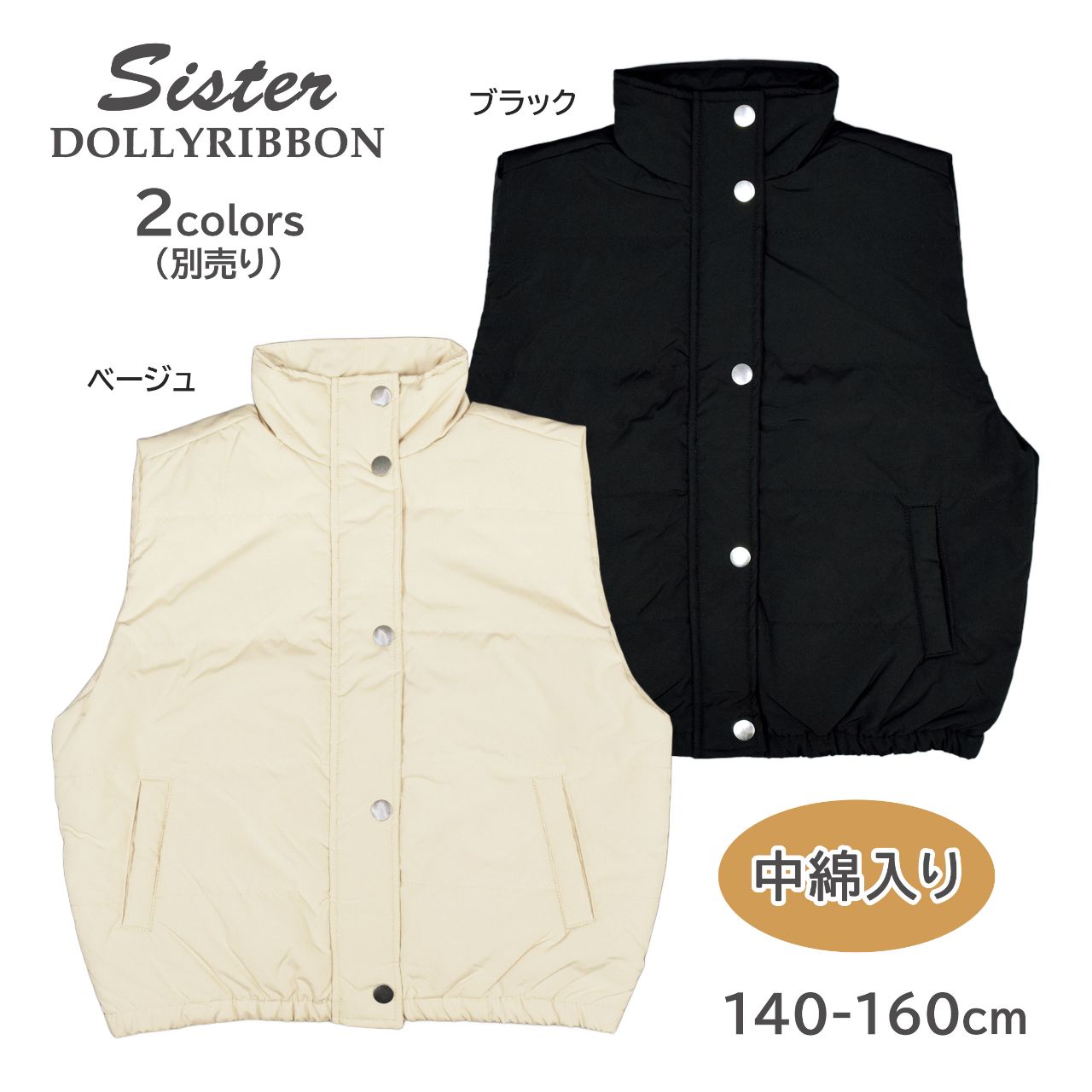 ☆ 商 品 説 明 ☆ DOLLY RIBBON ドーリーリボン 中綿入り ハイネック ベスト 。 季節の変わり目に活躍する シンプル なデザインの中綿入りベストです。前立ては冷たい風の侵入を防ぐファスナーとスナップボタン仕様。 首回りはスタンドカラーでしっかり温か。ポケットは前に2つ。裾はゴム入り。後ろ襟部分にロゴチケット付き。コーデしやすいカラーとデザインなのでセーター、ネルシャツなどインナーでコーデを楽しめます。
