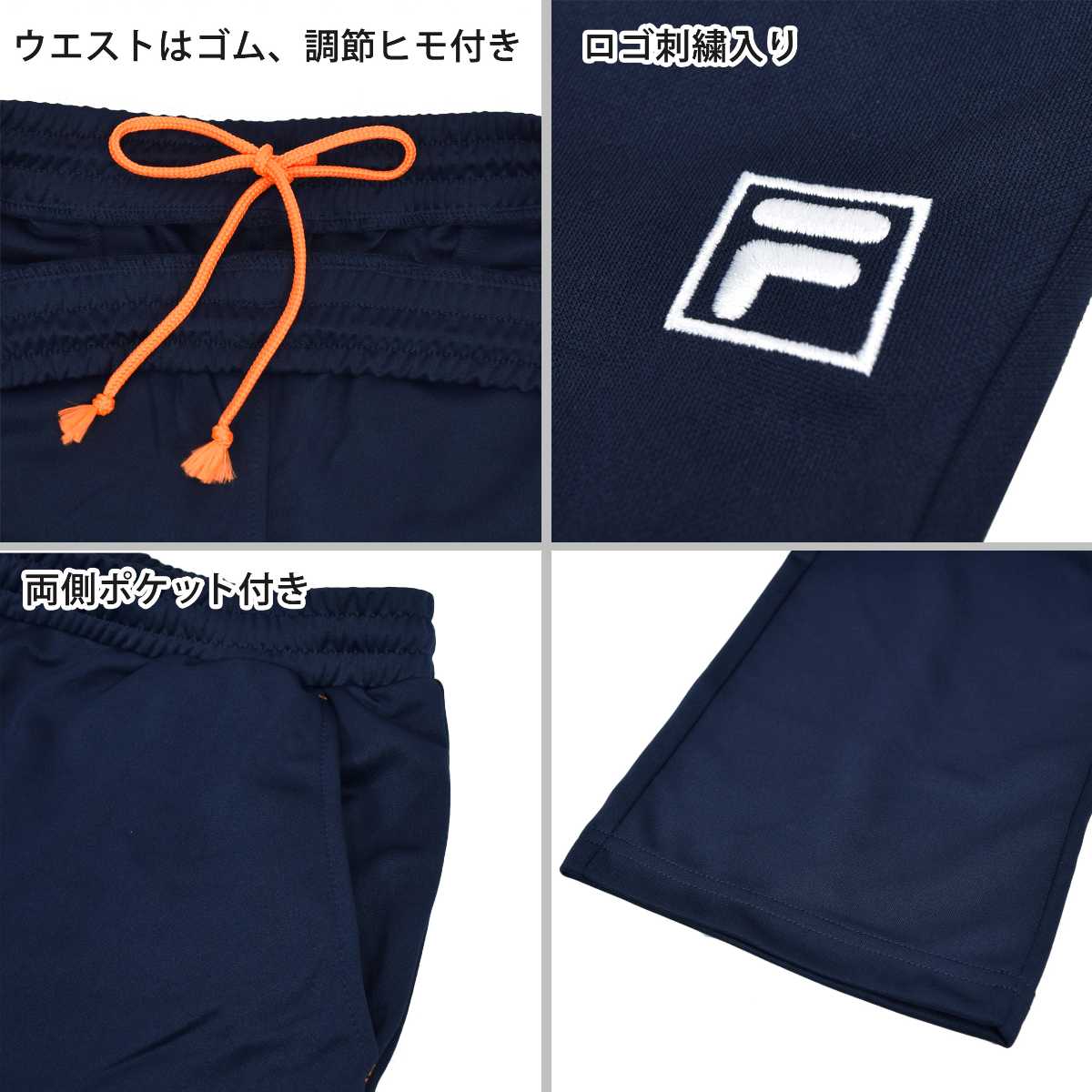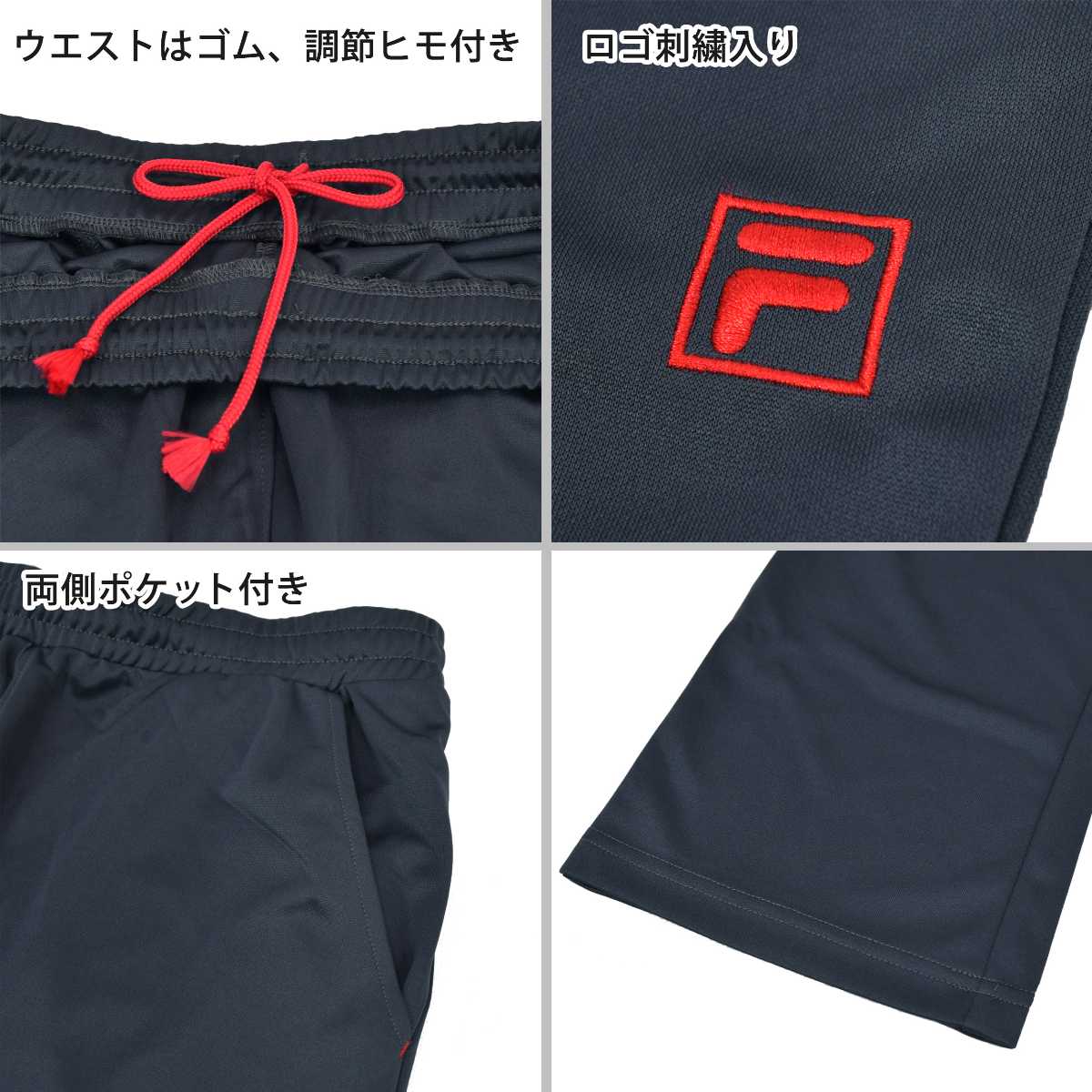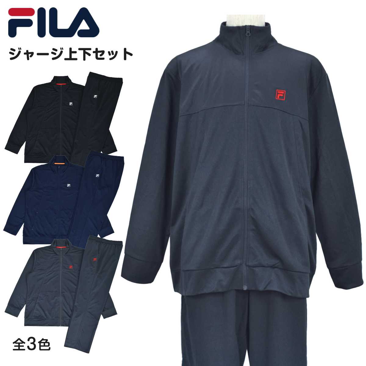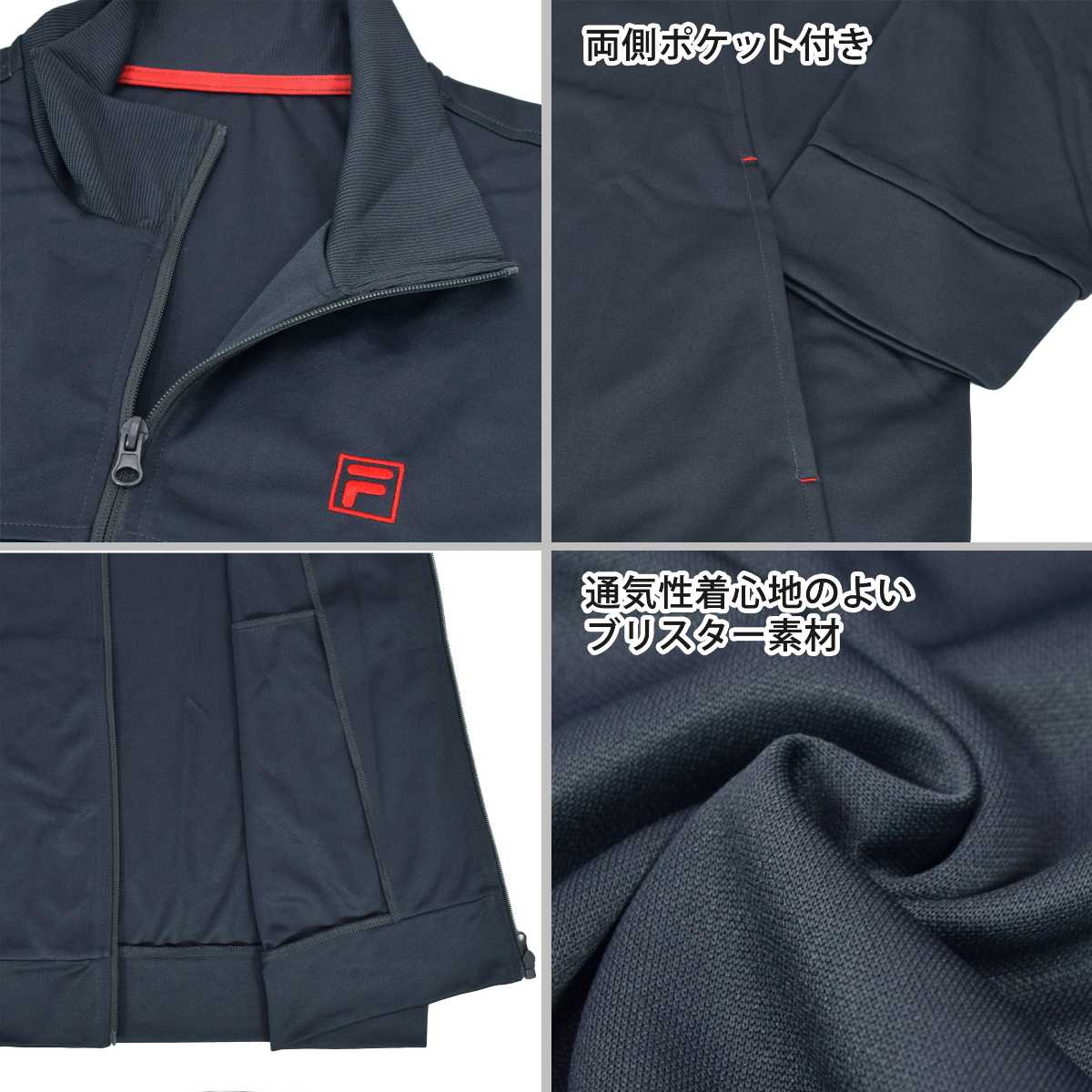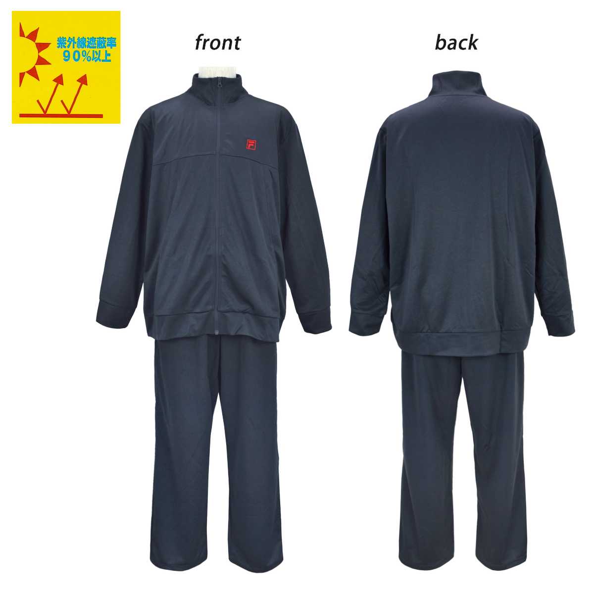 ☆ 商 品 説 明 ☆ FILA フィラ ロゴ入り UVカット ジャージ 上下セットです。 フィラの刺繍ロゴがワンポイントなシンプルカラーのトレニングウェア。 紫外線遮蔽率90%以上のUVカット生地。 通気性、着心地の良いブリスター素材なのでスポーツや普段使いにもオススメです。 ポケットはトップス・ボトムスに各2つ付き。 パンツはウエストゴム。紐あり。ゴム取り替え穴なし。