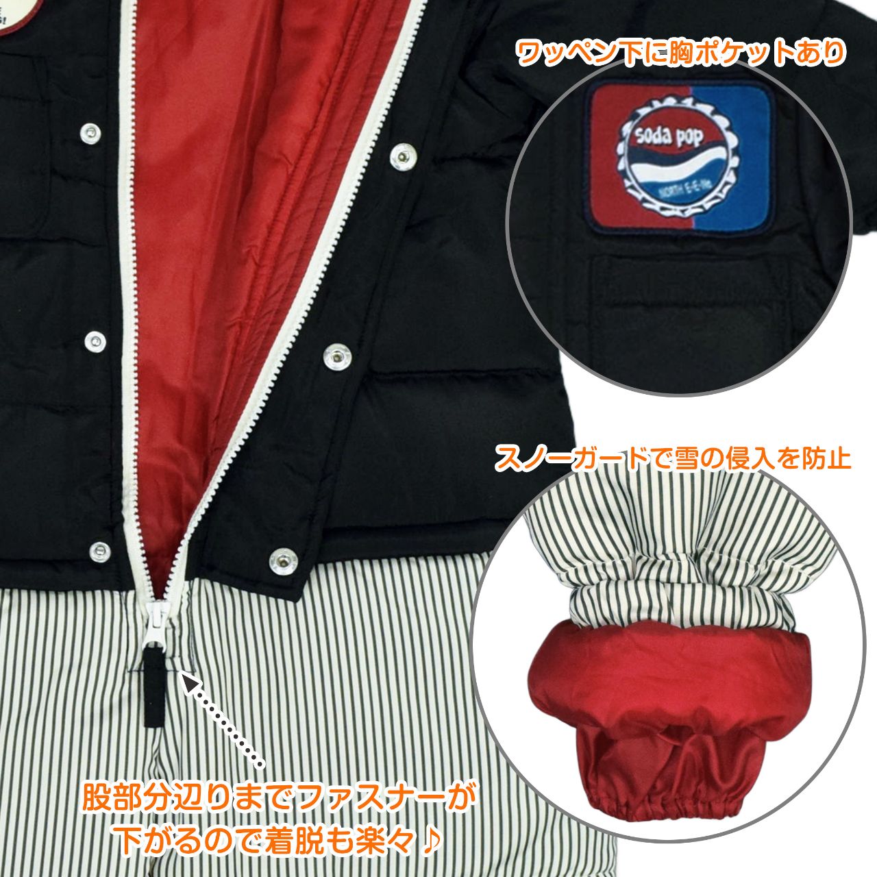 ☆ 商 品 説 明 ☆ 撥水加工 ワッペン付き 中綿入り ジャンプスーツ 。 無地にストライプ柄パンツのスノーコンビ です。 胸元と袖にはかっこいいワッペン付き。はっ水加工が施されているので雨や雪を弾きます。首回りにはシャーリングが入っているので程よいフィット感。前立てのファスナーは股部分辺りまであり着脱もらくらく。ファスナーガード あり。フードは取り外し不可。手首と足首にはゴムが入っているので風の侵入を防いでくれます。胸ポケット2つ。スノーガード あり。お名前タグあり。