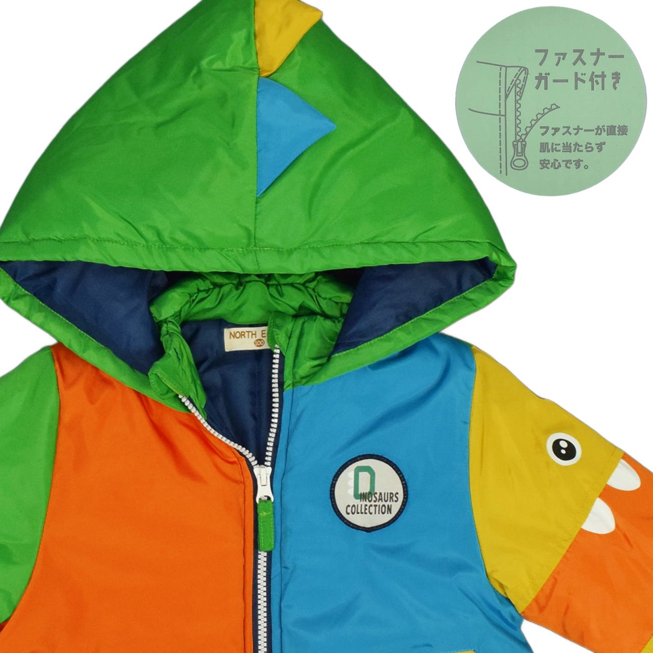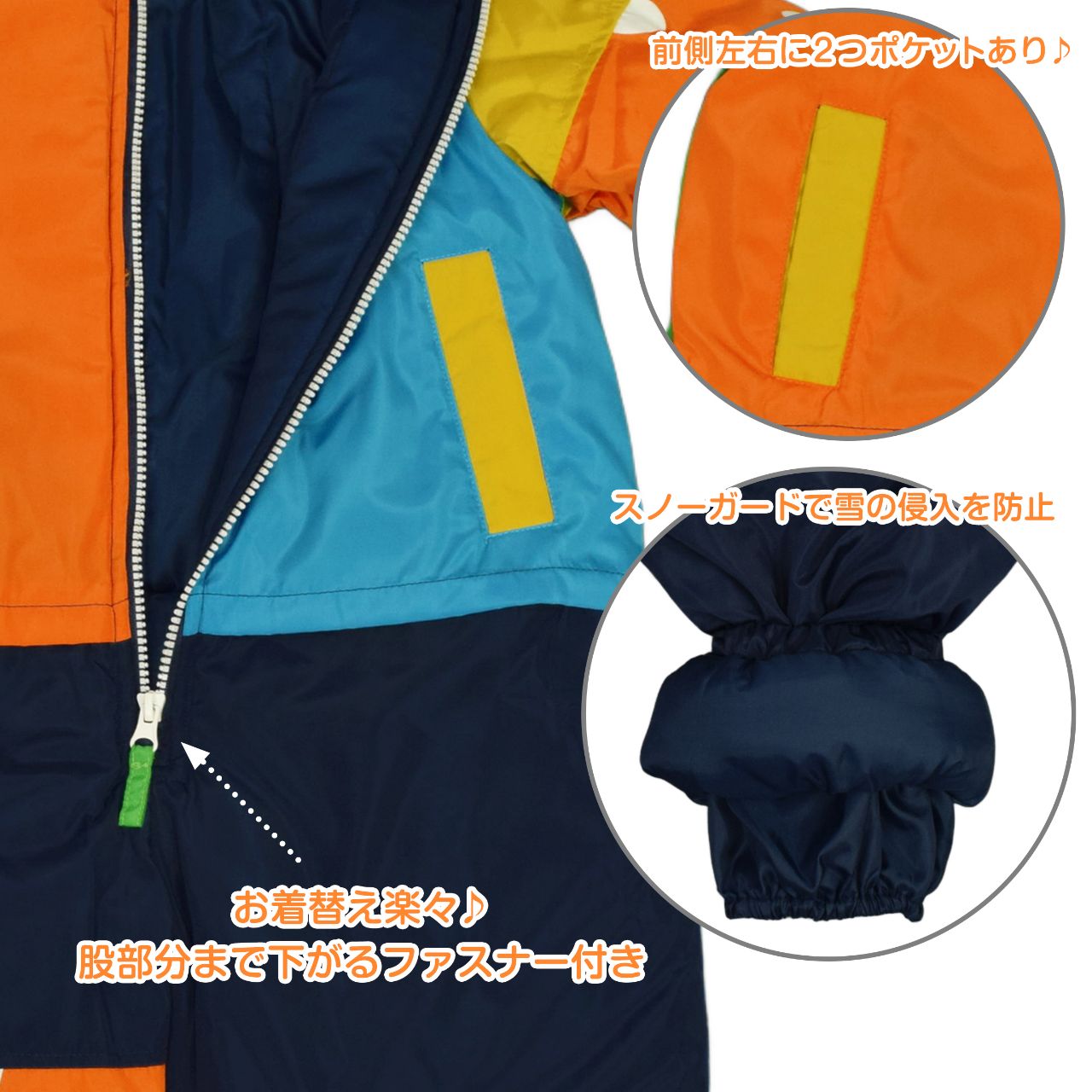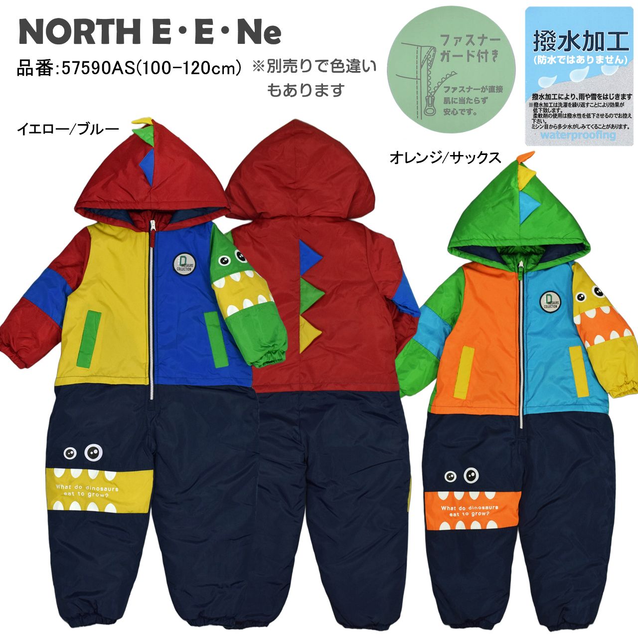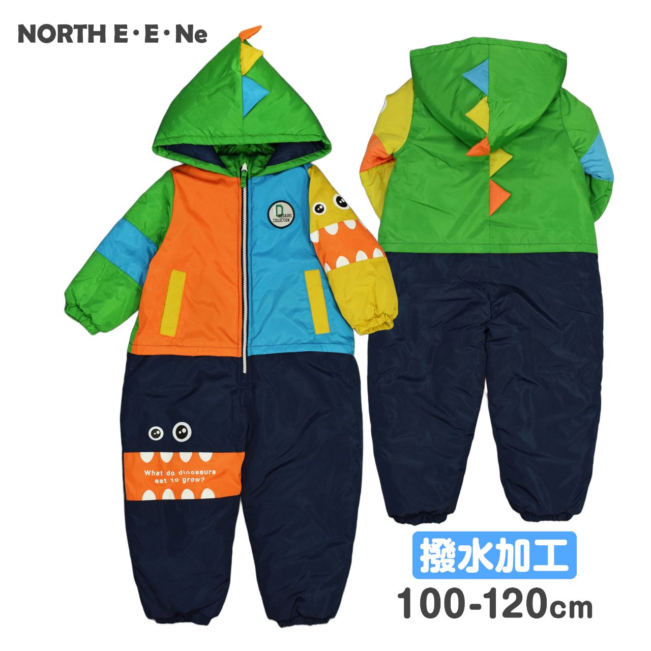 ☆ 商 品 説 明 ☆ 撥水加工 モンスター 切替 中綿入り ジャンプスーツ 。 ビビッドカラーと切替配色が かわいい スノーコンビ です。はっ水加工が施されているので雨や雪を弾きます。首回りにはシャーリングが入っているので程よいフィット感。袖とパンツ部分にモンスターのお顔がプリントされ、背中とフードにはモンスターのトサカが付いた可愛いデザイン。前立てのファスナーは股部分まであり着脱もらくらく。ファスナーガード あり。フードは取り外し不可。手首と足首にはゴムが入っているので風の侵入を防いでくれます。ポケットは前に2つ。スノーガード あり。お名前タグあり。 ※ 防水ではありません。