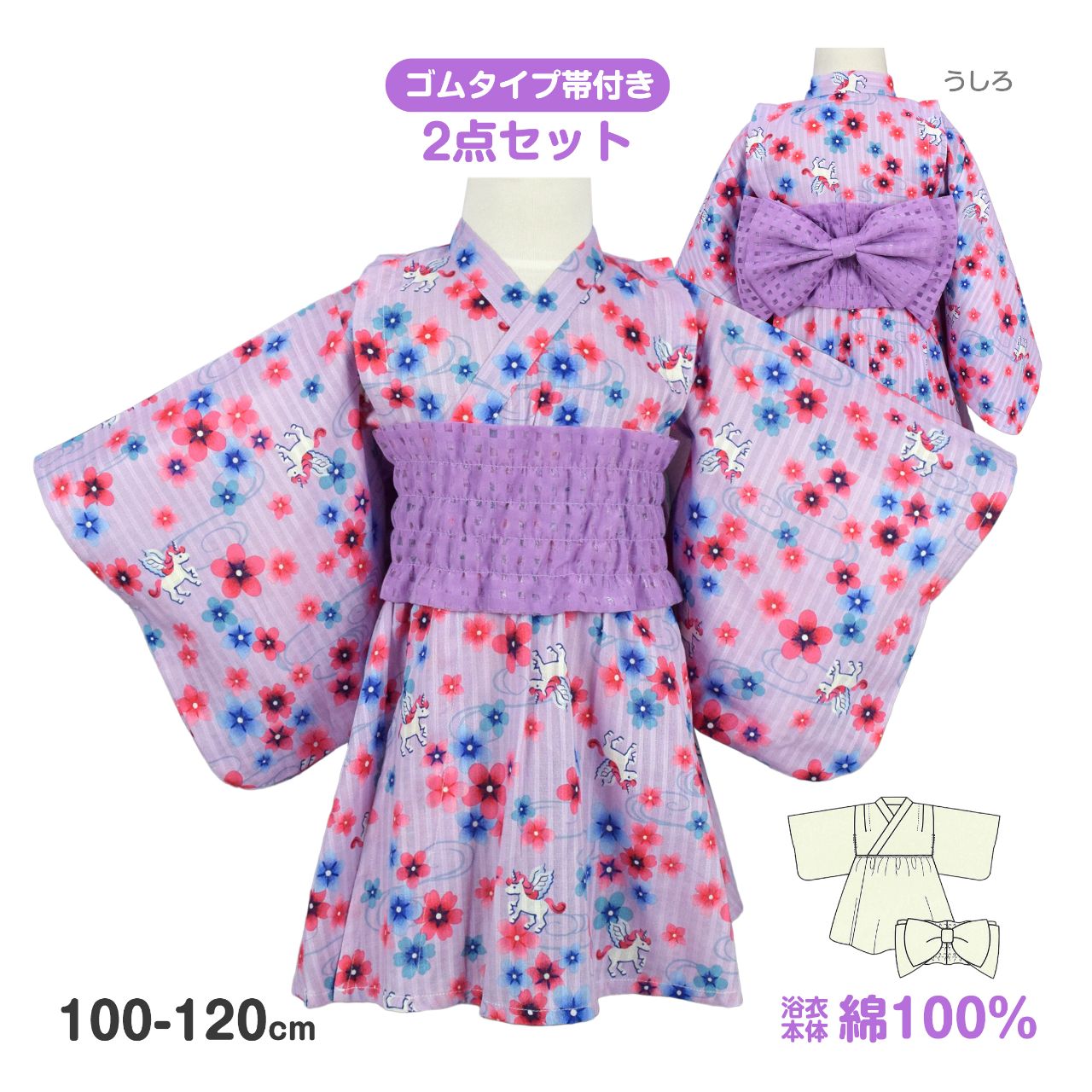 ☆ 商 品 説 明 ☆ ユニコーン プリント 帯付き 浴衣ドレス 2点セット 。 かぶって着せるだけ 面倒な着付けや衿合わせの必要がない ユニコーン総柄 浴衣ワンピース です。動き回る元気なお子様でも着崩れの心配もなく、お肌に優しい 綿100% なので蒸し暑い夏も快適。付属の帯は結ぶ手間の要らない ゴムタイプ仕様で簡単に付けられます。ウエスト部分は軽くゴムが入っていて、帯を締めなくてもはだけることがないので、ワンピースのみの着用も可能 普段着としてもお使いいただけます。 *模様や柄の出方は個々の商品によってそれぞれ異なります。