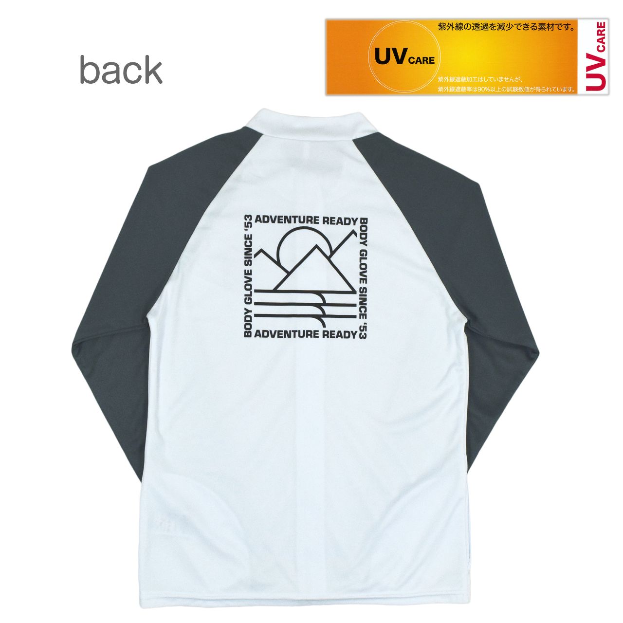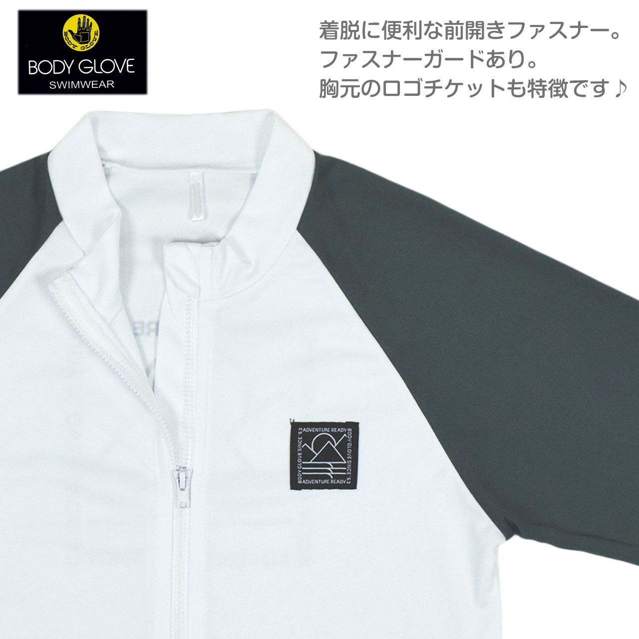 ☆ 商 品 説 明 ☆ BODY GLOVE ボディグローブ UVケア 長袖ラッシュガード 。 胸元にはロゴチケット、バックはBODY GLOVEの ロゴプリント入り ラッシュガード です。着脱に便利な前開きファスナー。紫外線遮蔽加工はしておりませんが、紫外線遮蔽率は90%以上の試験数値が得られています。ファスナーガードあり。両サイド ポケット付き。