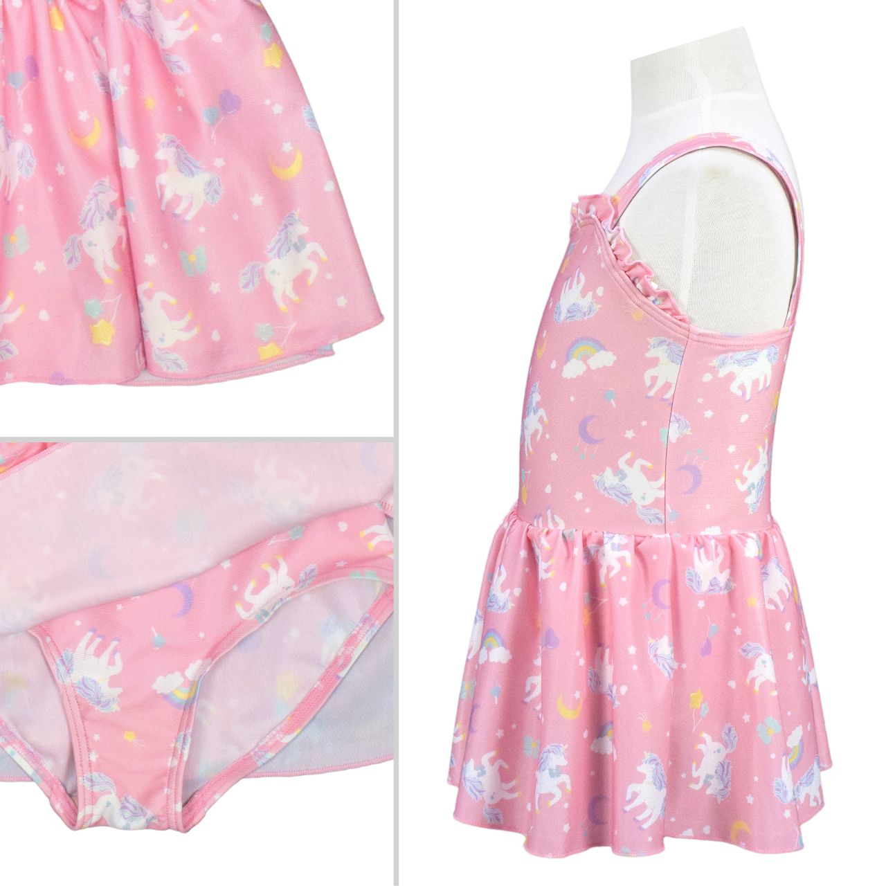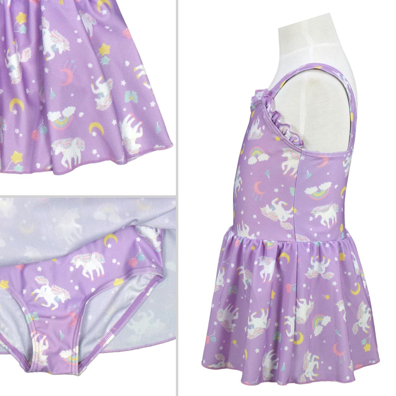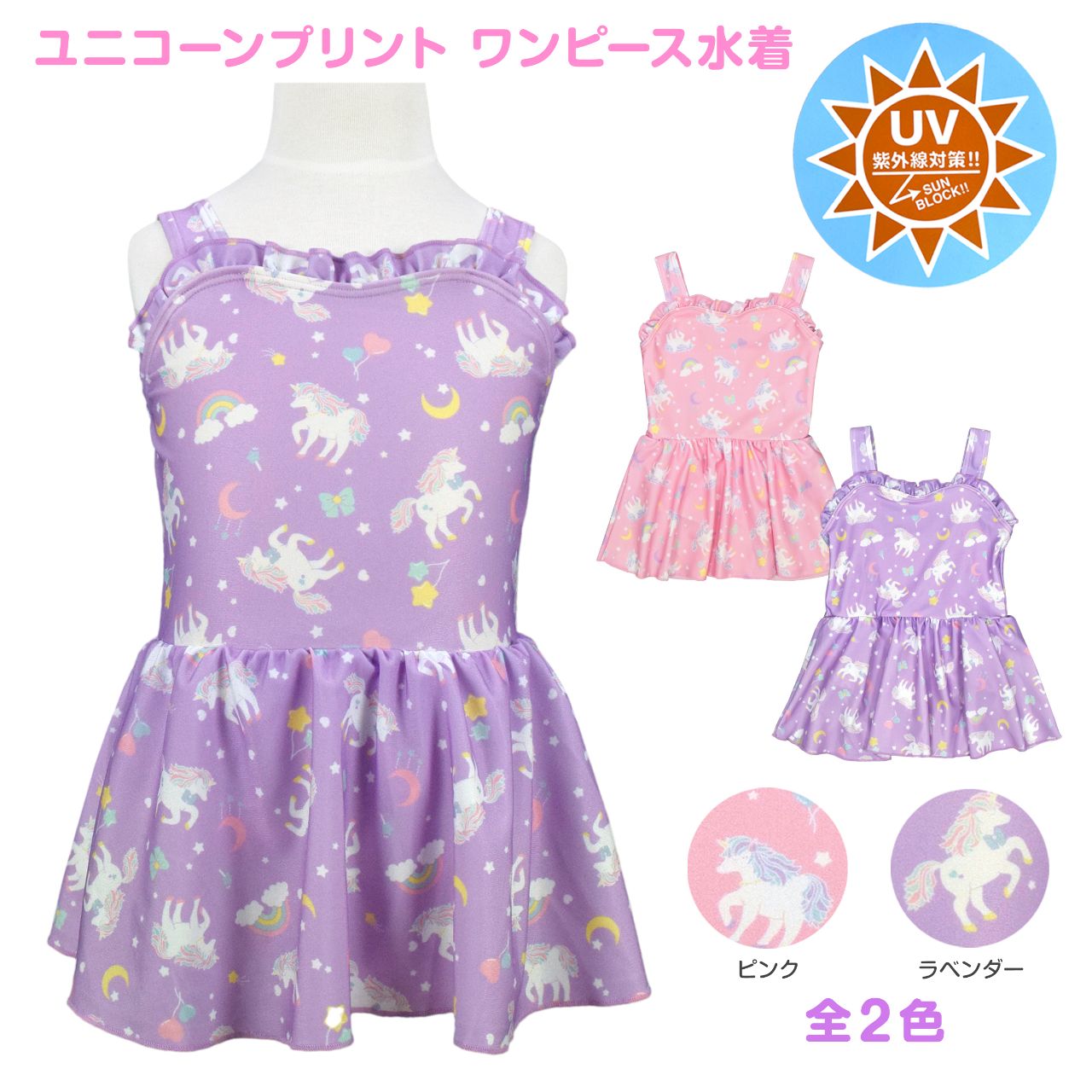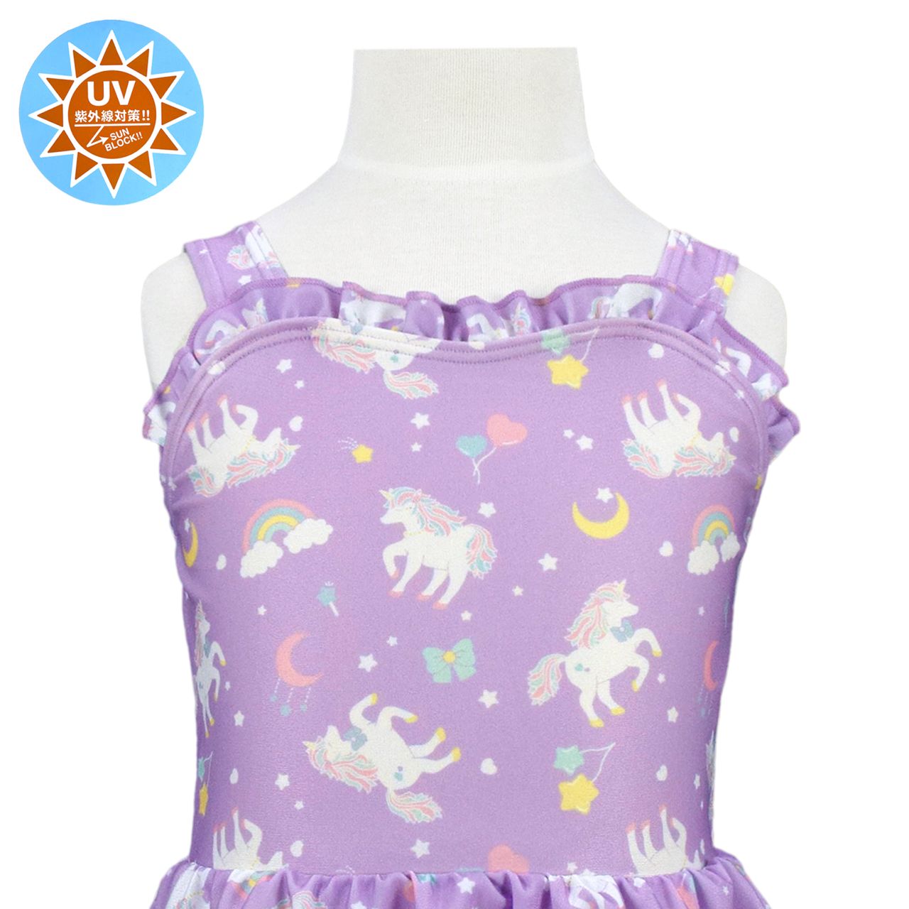 ☆ 商 品 説 明 ☆ UVカット加工 ユニコーン ワンピース水着 。 ユニコーンの総柄プリントが かわいい ワンピースタイプの デザイン水着 です。ウエスト部分はゴム入り。胸元のフリルや スカート部分のふんわりとしたデザインがおしゃれな スイムウェア です。UVカット加工で紫外線をガード。前身頃内側は裏地付き、肩紐調節不可。カップ取り付け不可。