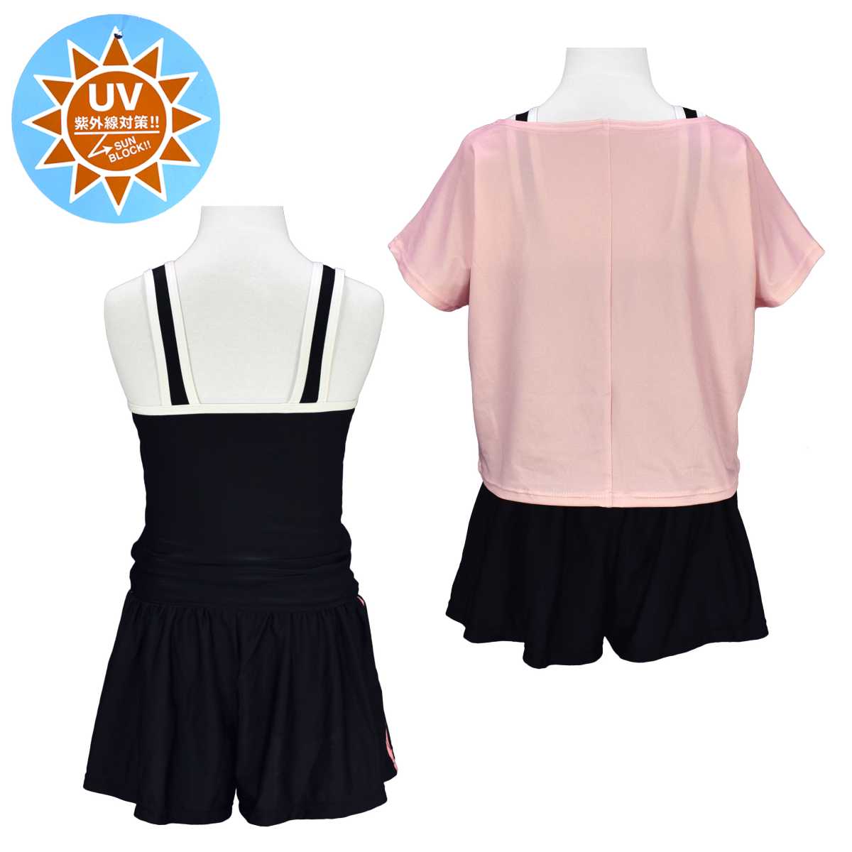 ☆ 商 品 説 明 ☆ UVカット加工 カバーアップ付 タンキニ 3点セット 水着です。 ロゴや裾のラインがスタイリッシュなスイムウエア。 トップスはTシャツ型のカバーアップとタンクトップ。気分に合わせて2WAYでも着られます。 ボトムスはショーツが一体型となったキュロットタイプ。 UVカット加工で紫外線対策もバッチリ。 胸元裏地にカップ差し込み口あり。取外しも可能です。 (カップは別売りです。)