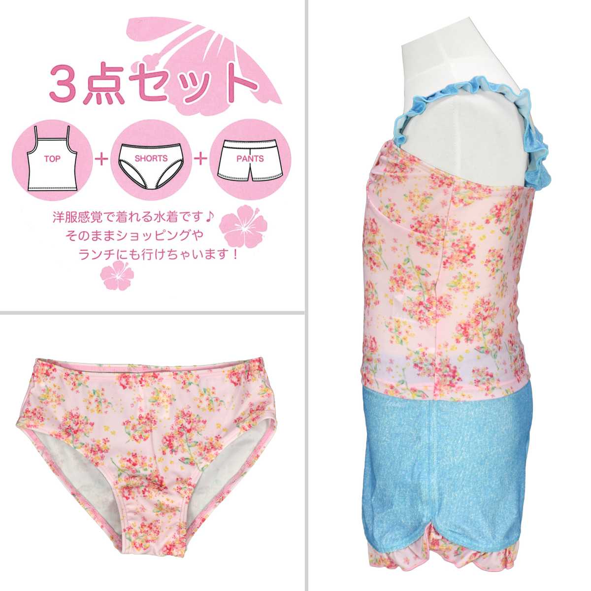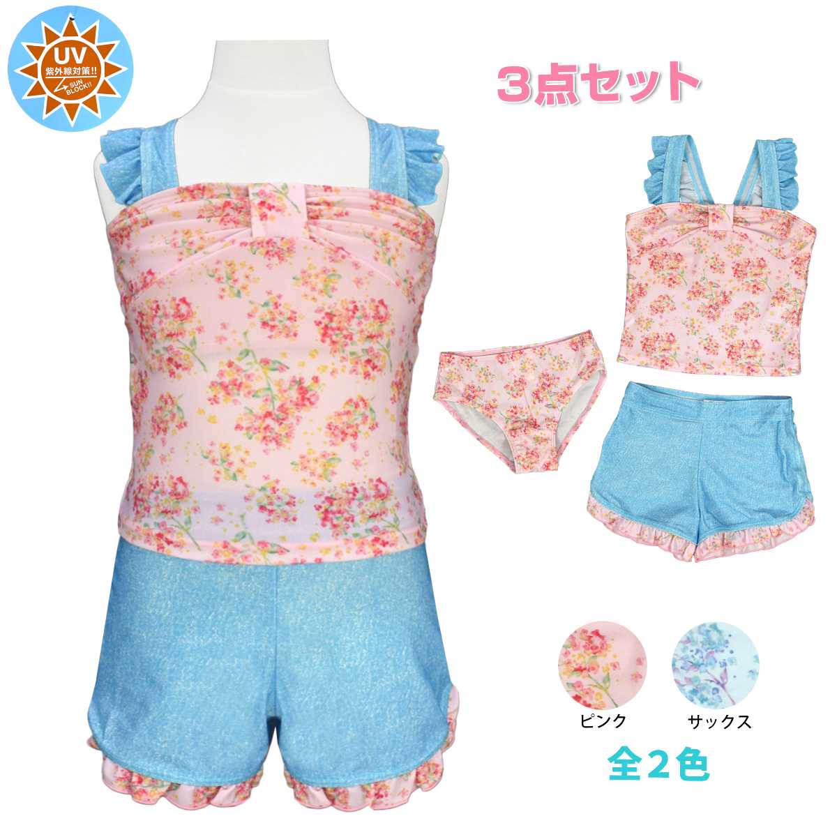 ☆ 商 品 説 明 ☆ UVカット加工 花柄 タンキニ3点セット 水着。 水彩で描いたような花柄がとっても可愛らしい3点セットのスイムウエアです。 トップス肩紐とボトムはフリル使いなので可愛いさアップ。 タンクトップ、キュロット、ショーツの3点セット、2WAYでも着られるます。 UVカット加工で紫外線対策もバッチリ。 130cmは胸元内側に布付き、カップ差し込み口無し。 140cm-160cmはカップ差し込み口あり。取外しも可能です。 (カップは別売りです。)