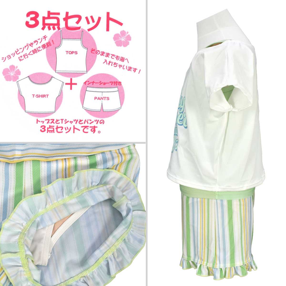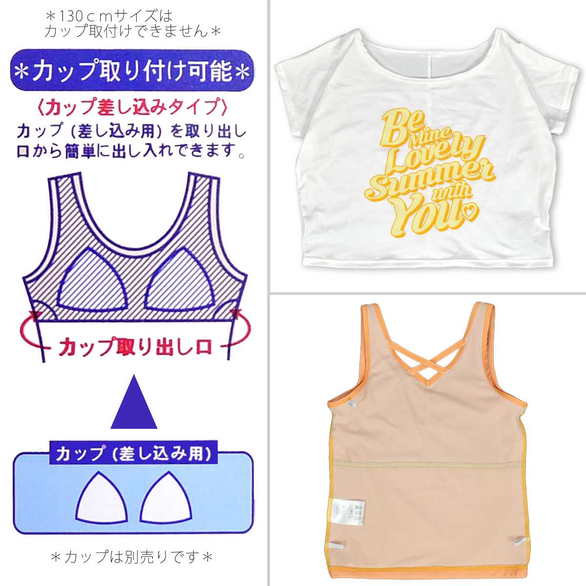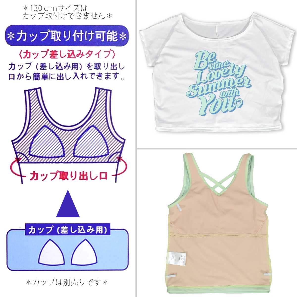☆ 商 品 説 明 ☆ UVカット加工 カバーアップ付 タンキニ 3点セット 水着です。 爽やかなストライプ柄やトップスのロゴが可愛らしいスイムウエア。 トップスはゆったりとしたTシャツ型カバーアップと 胸元のクロスデザインがおしゃれなタンクトップ。 気分に合わせて2WAYでも着られます。 ボトムスはショーツが一体型となったキュロットタイプ。 UVカット加工で紫外線対策もバッチリ。 130cmは胸元内側に布付き、カップ差し込み口無し。 140cm-160cmはカップ差し込み口あり。取外しも可能です。 (カップは別売りです。)