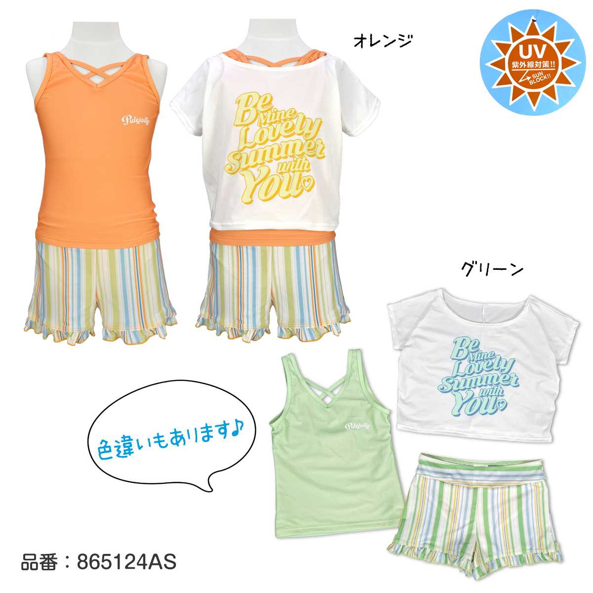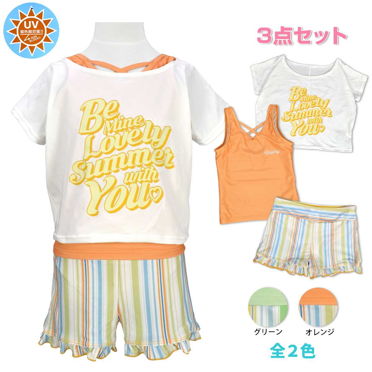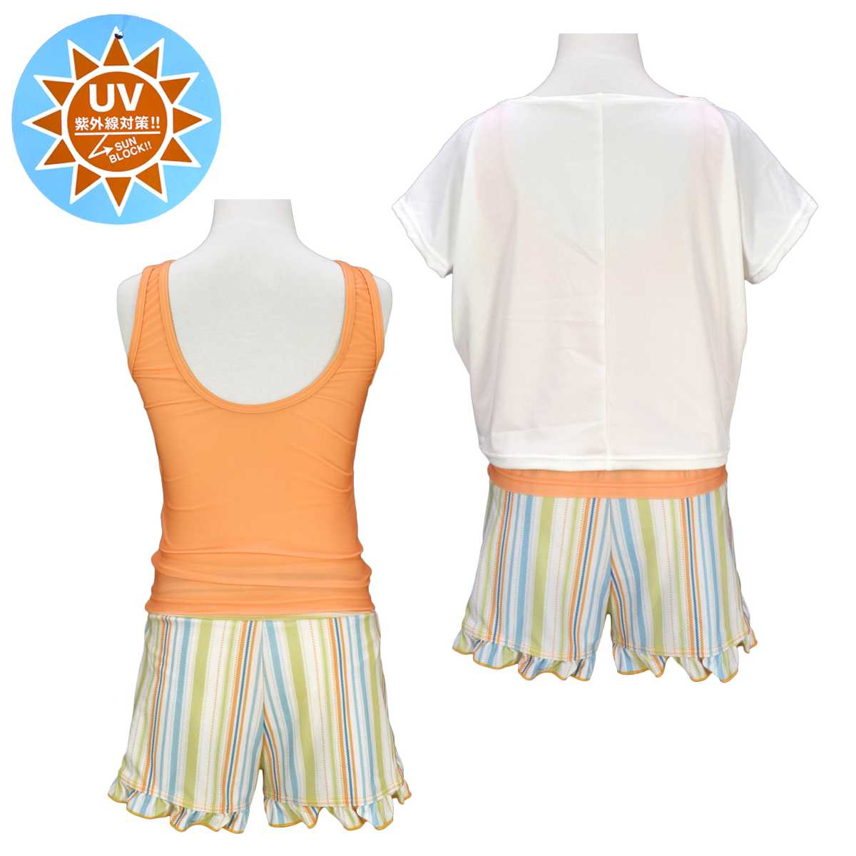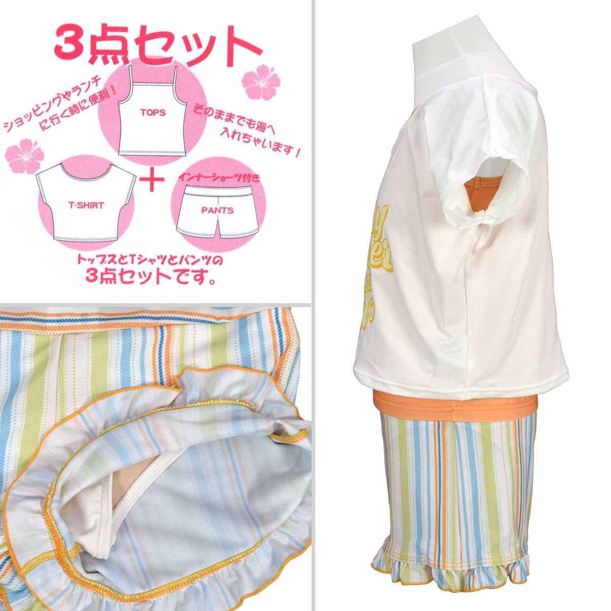 ☆ 商 品 説 明 ☆ UVカット加工 カバーアップ付 タンキニ 3点セット 水着です。 爽やかなストライプ柄やトップスのロゴが可愛らしいスイムウエア。 トップスはゆったりとしたTシャツ型カバーアップと 胸元のクロスデザインがおしゃれなタンクトップ。 気分に合わせて2WAYでも着られます。 ボトムスはショーツが一体型となったキュロットタイプ。 UVカット加工で紫外線対策もバッチリ。 130cmは胸元内側に布付き、カップ差し込み口無し。 140cm-160cmはカップ差し込み口あり。取外しも可能です。 (カップは別売りです。)