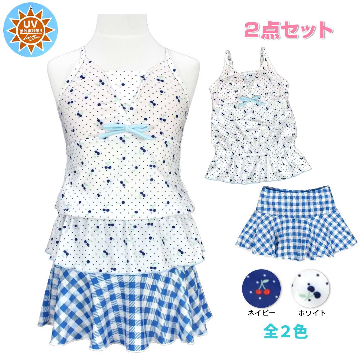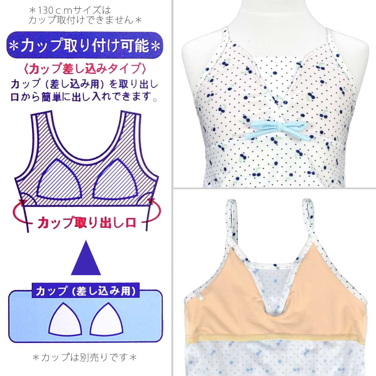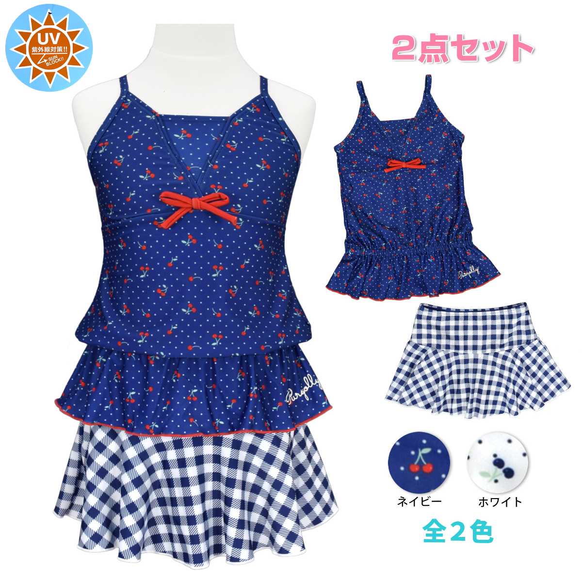 ☆ 商 品 説 明 ☆ UVカット加工 さくらんぼ柄 セパレート 水着。 さくらんぼ、ドット、チェック柄が可愛い2点セットのスイムウェアです。 トップスは肩ひもが調節可能なキャミソールタイプ。 裾にはゴム入りなので捲れずらいデザインです。 ボトムスはスカートとショーツが一体型のスカパンタイプ。 スカートとショーツはしっかり縫い付けてあるので無くす心配がありません。 UVカット加工で紫外線対策もバッチリです。 130cmは胸元内側に布付き、カップ差し込み口無し。 140cm-160cmはカップ差し込み口あり。取外しも可能です。 (カップは別売りです。)